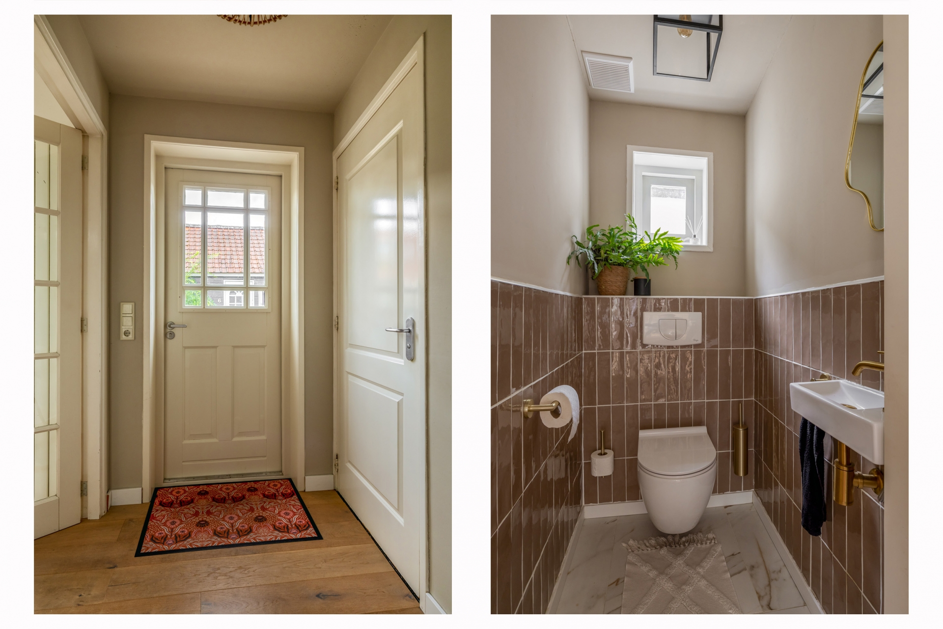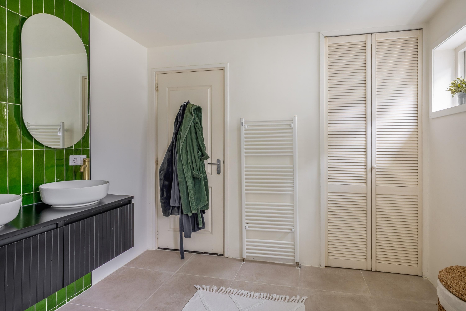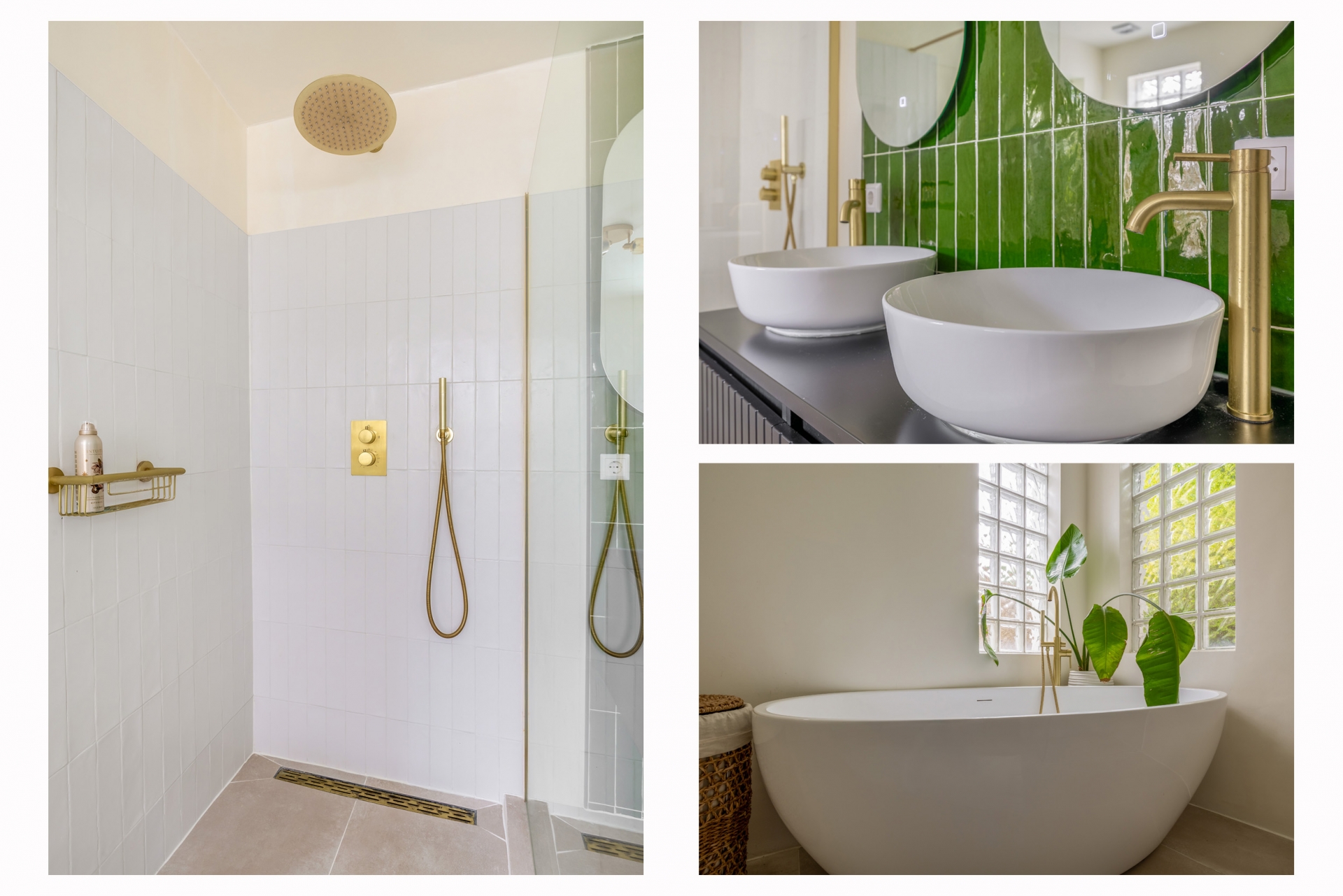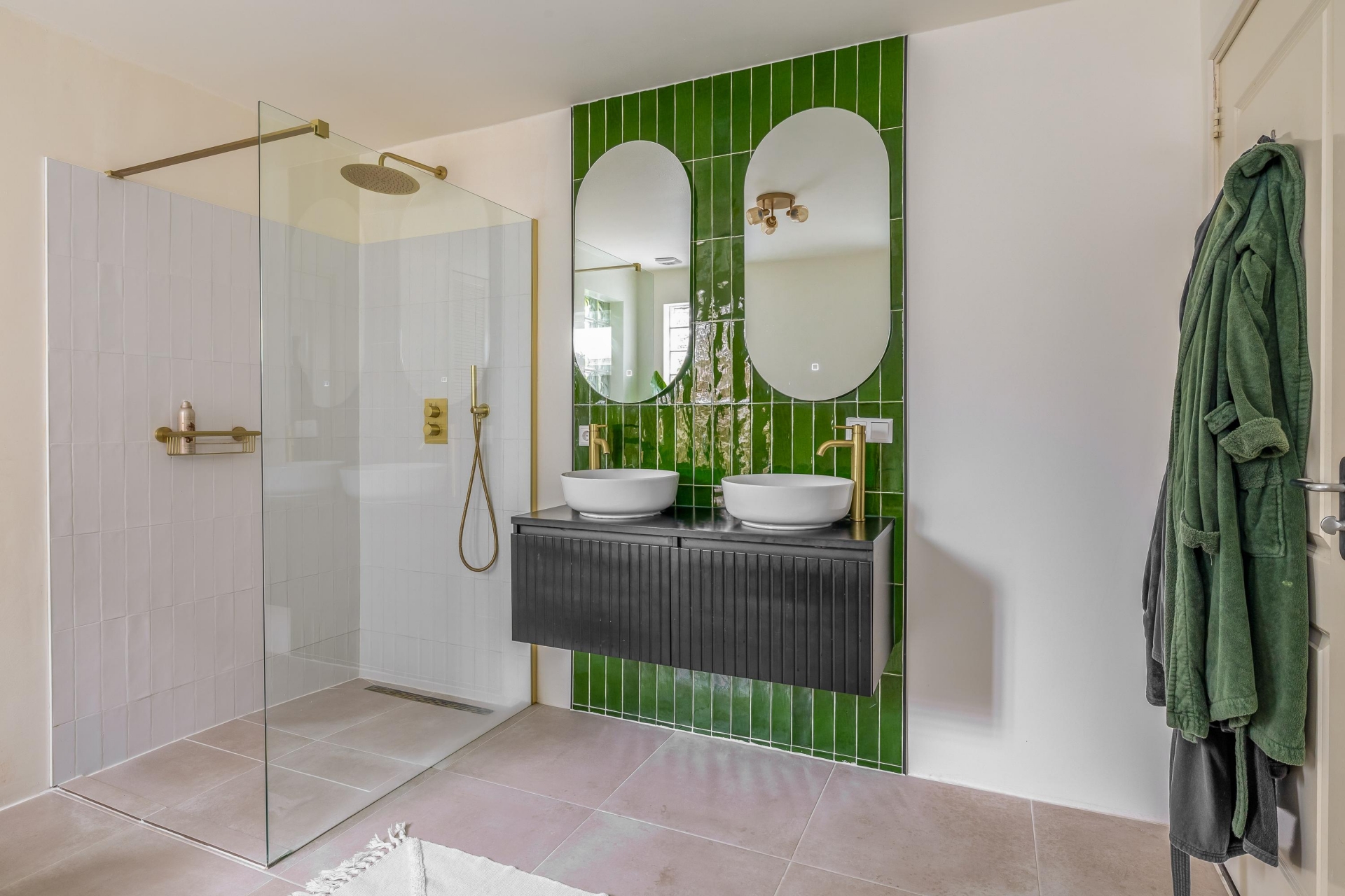 Binnen tref je een mooie balans tussen stijl en functionaliteit. De badkamer is strak en modern ingericht met een vrijstaand bad, een ruime inloopdouche, dubbele waskommen en luxe afwerkingen zoals messing kranen en groene wandtegels voor een eigentijdse look. Alle slaapkamers bevinden zich op de eerste verdieping, met een ruime hoofdslaapkamer en twee kleinere kamers die perfect geschikt zijn als logeerkamer, kinderkamer of werkruimte. De bovenverdieping heeft een sfeervolle indeling en biedt een aangename, huiselijke sfeer.