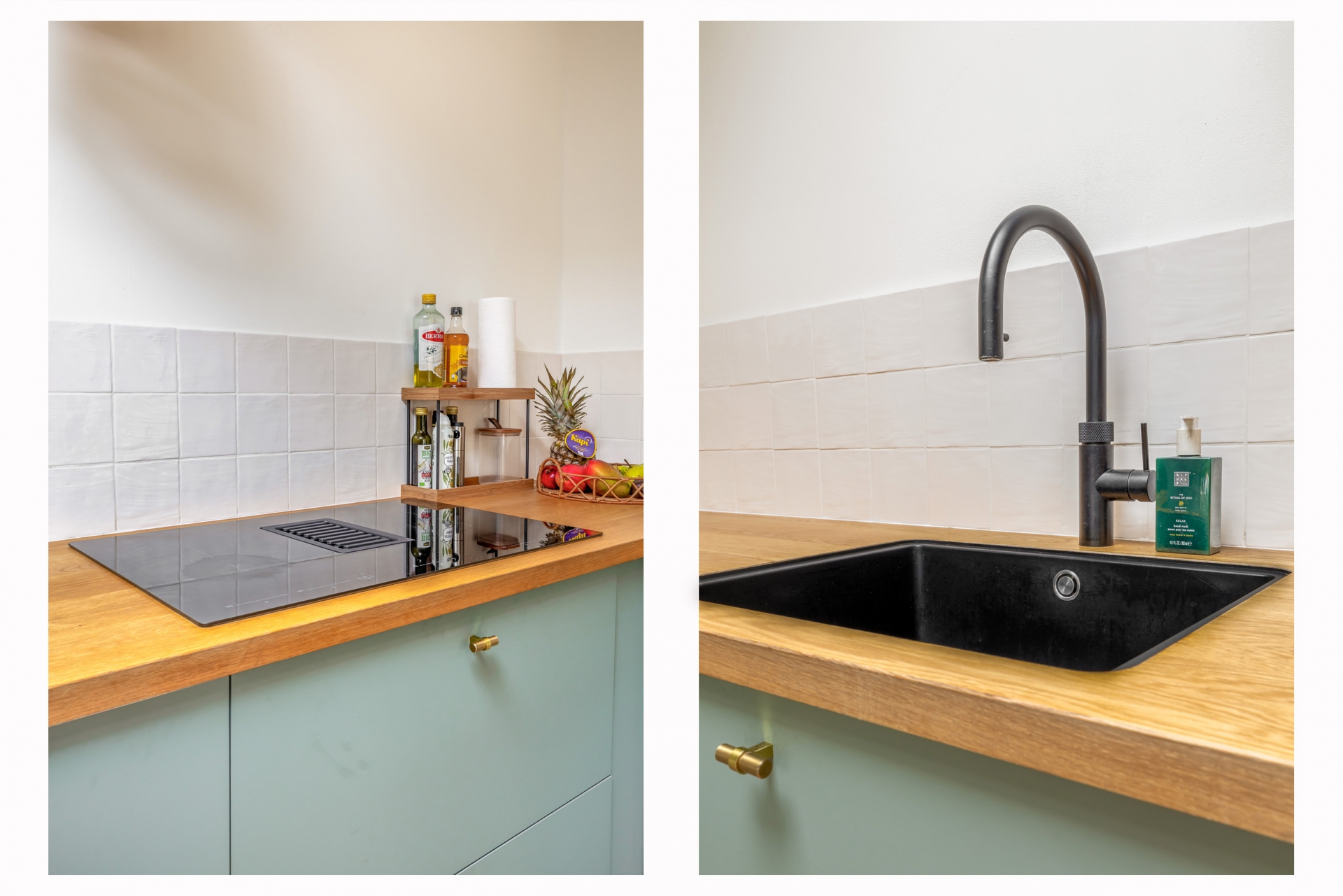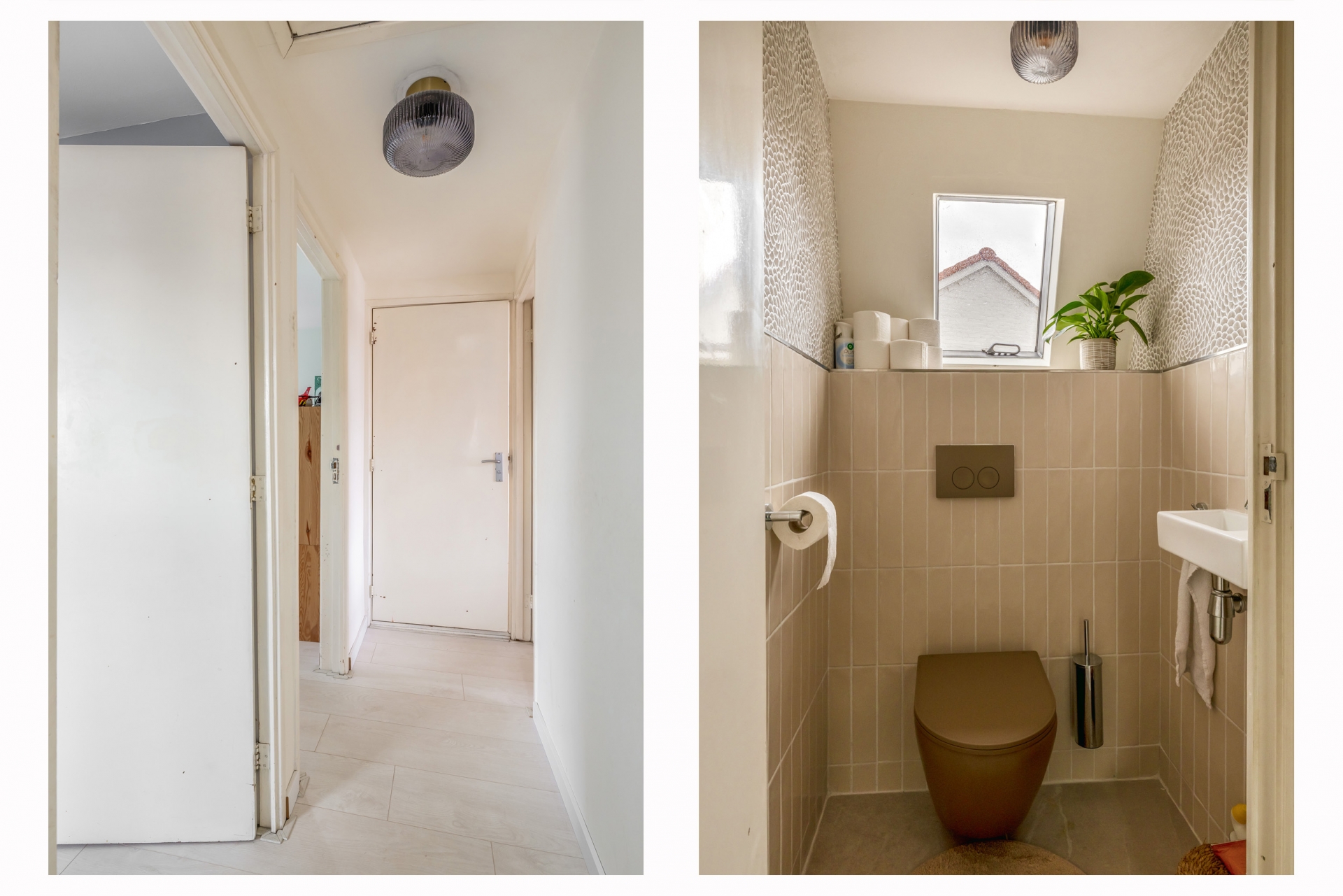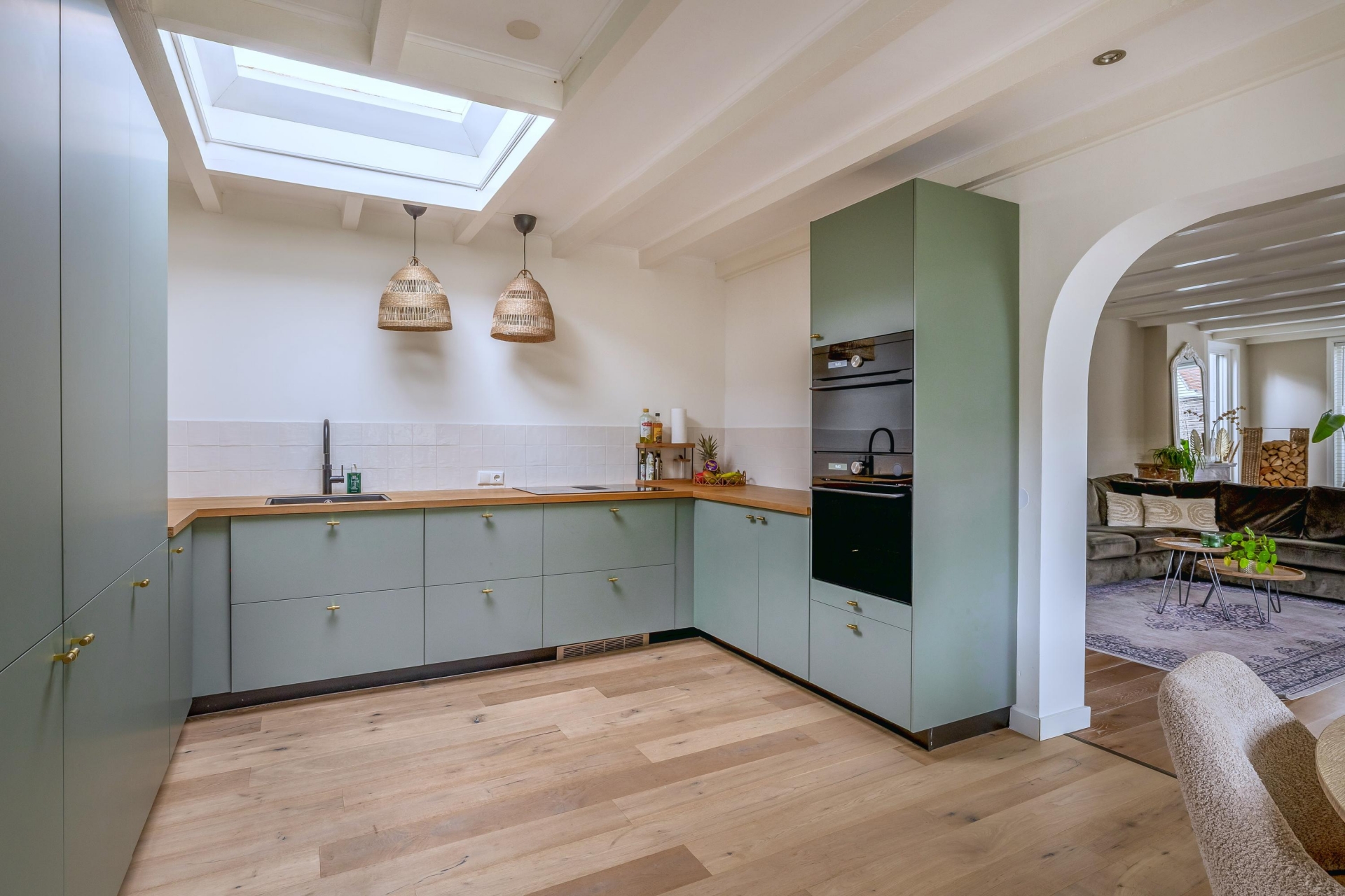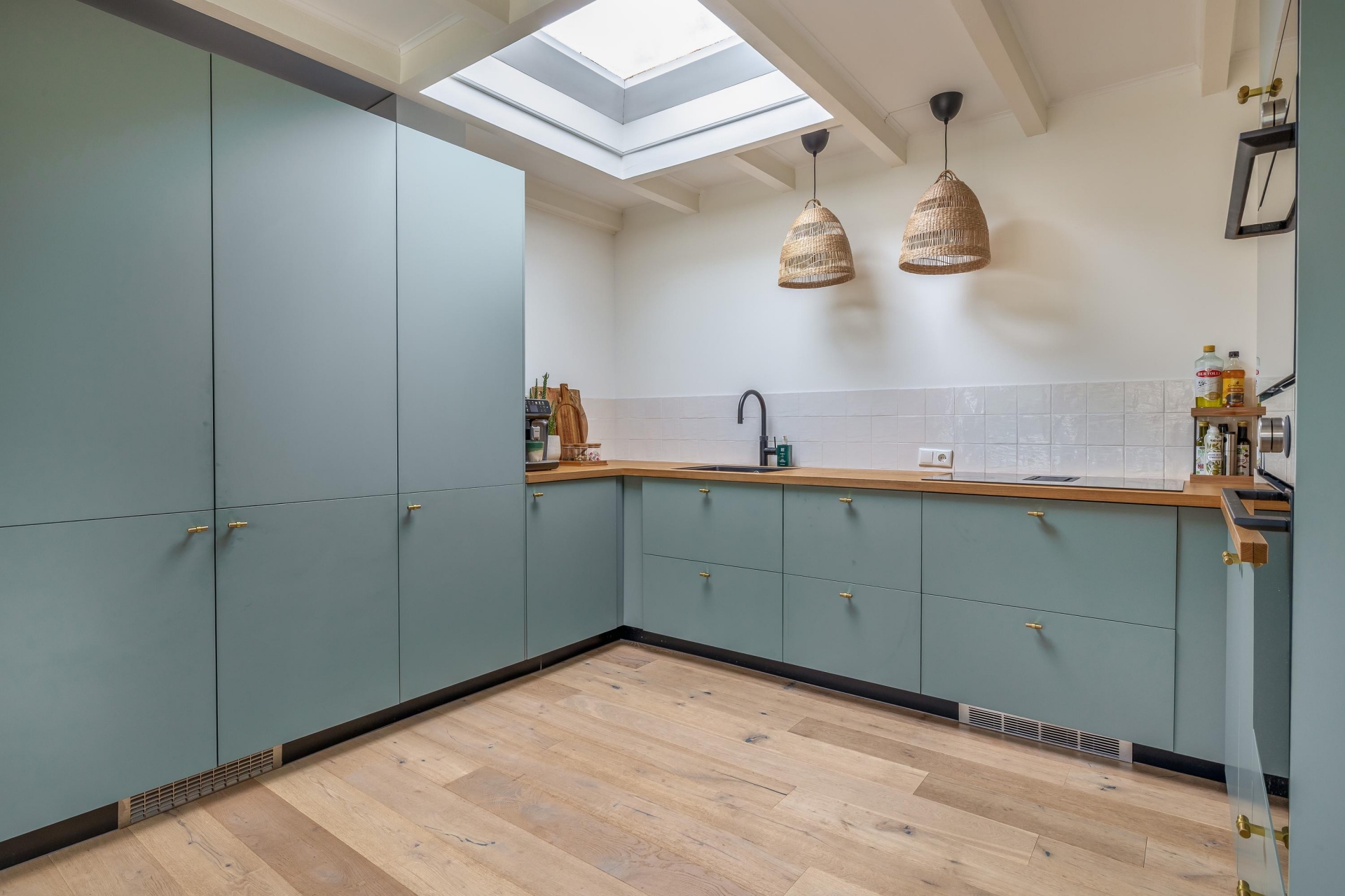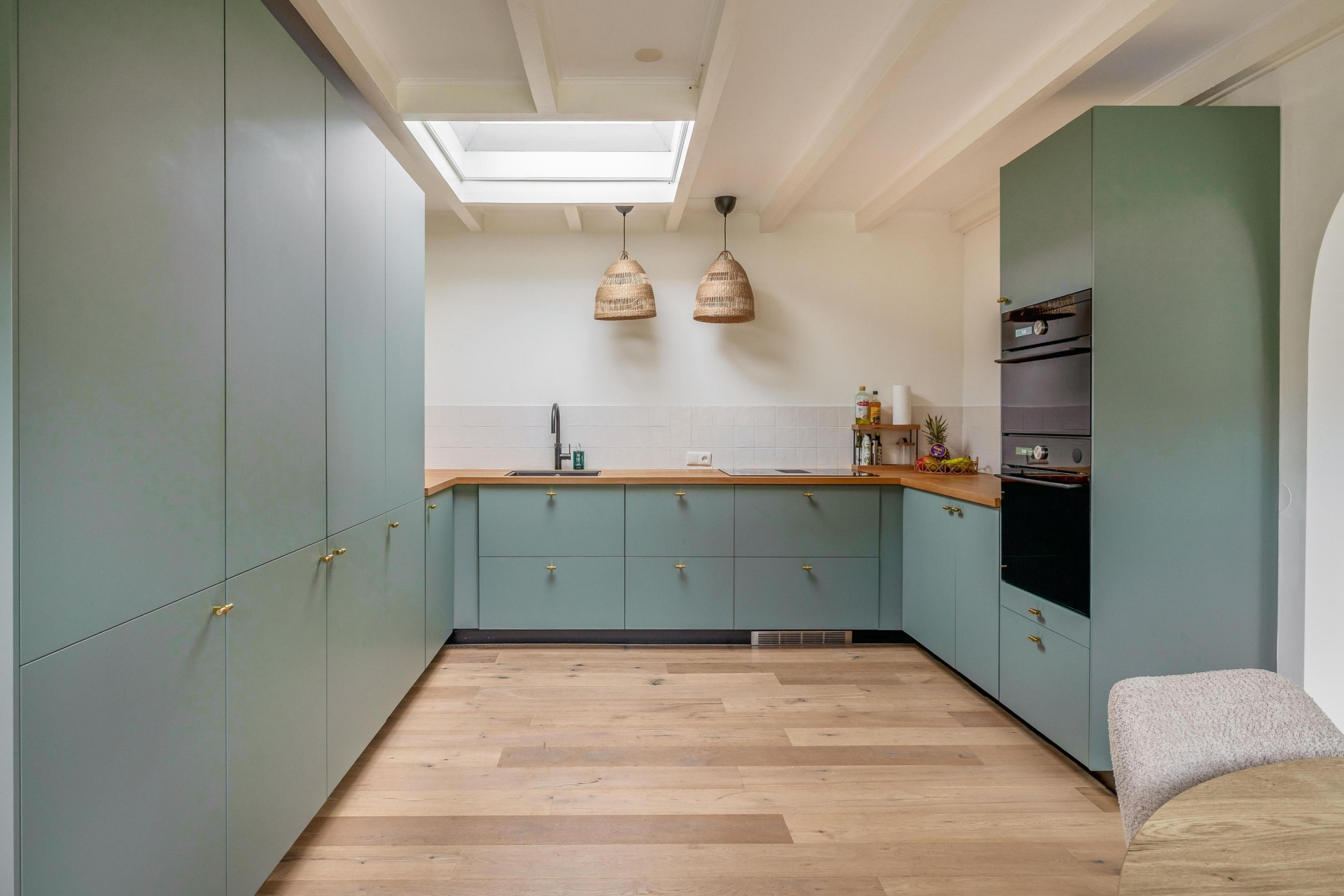 Binnen tref je een mooie balans tussen stijl en functionaliteit. De badkamer is strak en modern ingericht met een vrijstaand bad, een ruime inloopdouche, dubbele waskommen en luxe afwerkingen zoals messing kranen en groene wandtegels voor een eigentijdse look. Alle slaapkamers bevinden zich op de eerste verdieping, met een ruime hoofdslaapkamer en twee kleinere kamers die perfect geschikt zijn als logeerkamer, kinderkamer of werkruimte. De bovenverdieping heeft een sfeervolle indeling en biedt een aangename, huiselijke sfeer.