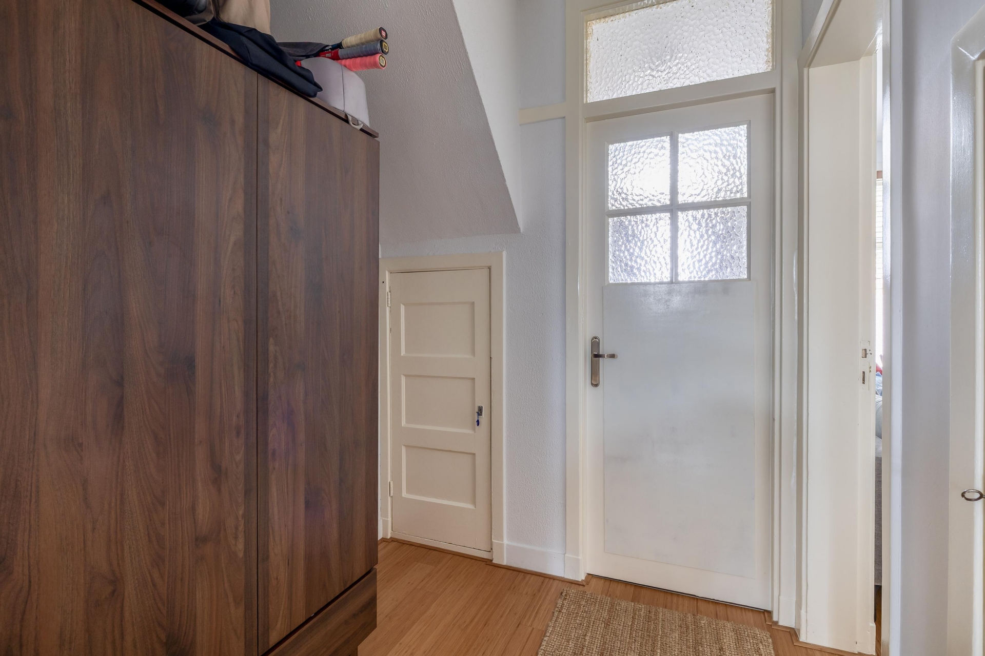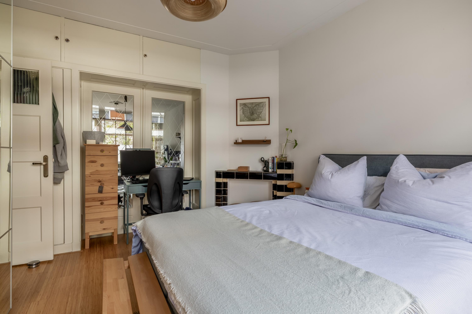 Bij binnenkomst kom je in de hal die toegang geeft tot alle vertrekken. De woonkamer ligt aan de voorzijde van het huis en valt direct op door het prettige lichtinval via de grote raampartijen. De ruimte is praktisch in te delen met een comfortabele zithoek en een eethoek. De huidige indeling laat goed zien hoe je hier een gezellige leefruimte creëert waar je zowel kunt ontspannen als vrienden ontvangt. De nette afwerking en de hoogte van het plafond zorgen voor een ruimtelijk gevoel. Aan de achterzijde van het huis vind je de slaapkamer. Dit is een ruime kamer waar met gemak een tweepersoonsbed en kastruimte geplaatst kan worden. Vanuit hier heb je een directe verbinding met de rest van het appartement en ervaar je een rustige ligging aan de tuinzijde.