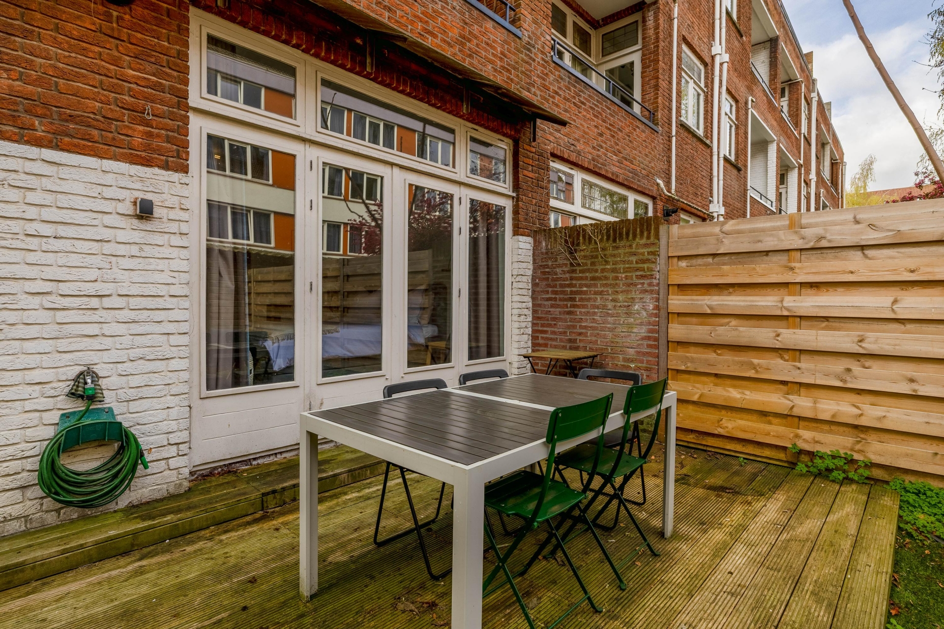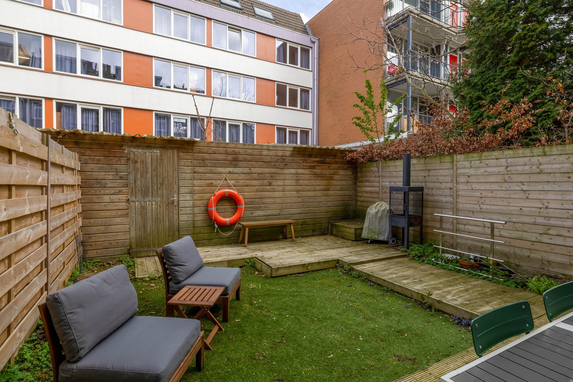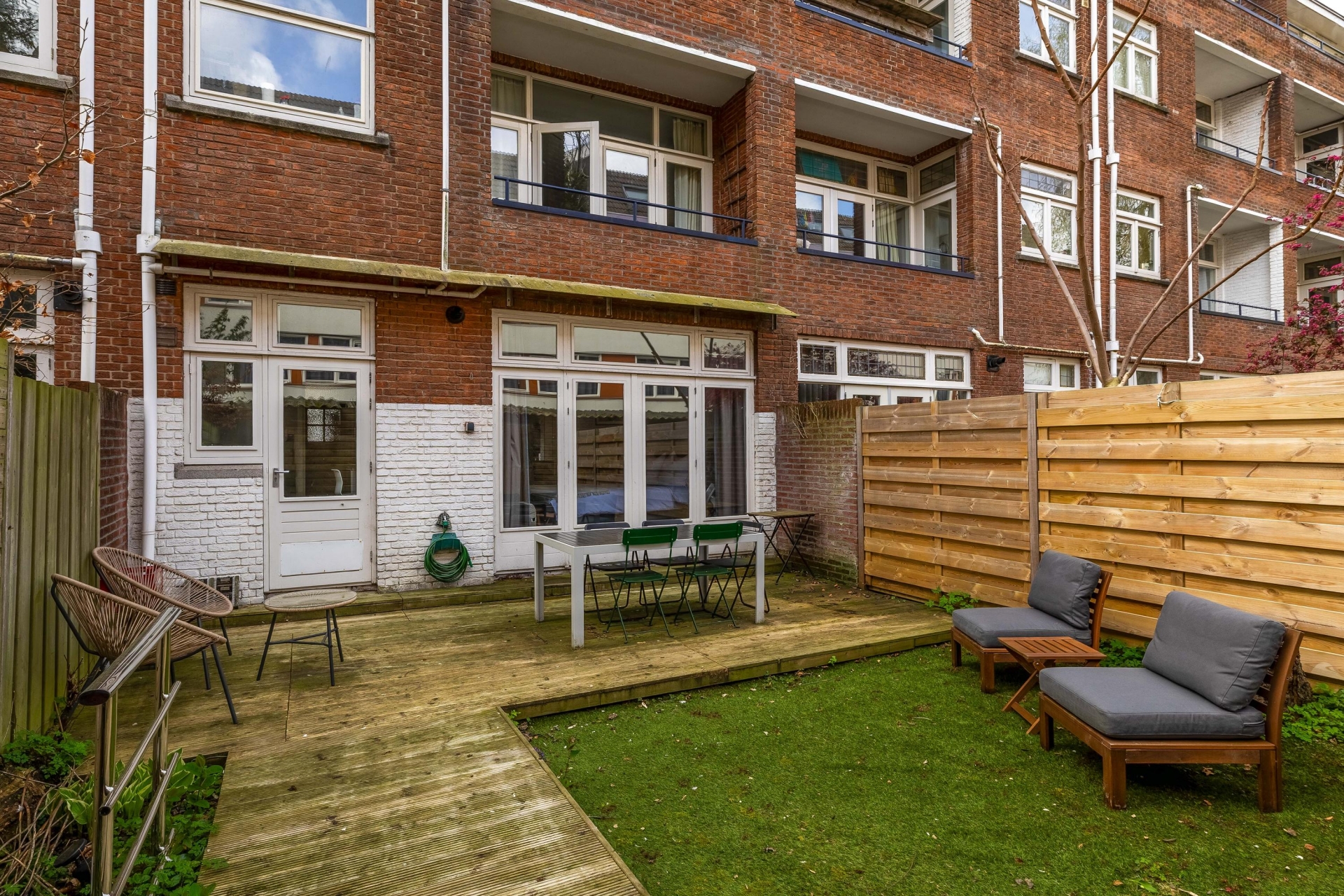 Een van de grote pluspunten van dit huis is de achtertuin. Met een diepte van circa 7 meter heb je hier opvallend veel buitenruimte voor een appartement. De tuin is een combinatie van terras en groen, waardoor je meerdere zitplekken kunt creëren. Of je nu rustig wilt genieten van een kop koffie in de ochtendzon of met vrienden wilt borrelen op een zomeravond, hier kan het allemaal. De houten schuttingen zorgen voor privacy en een beschutte sfeer.