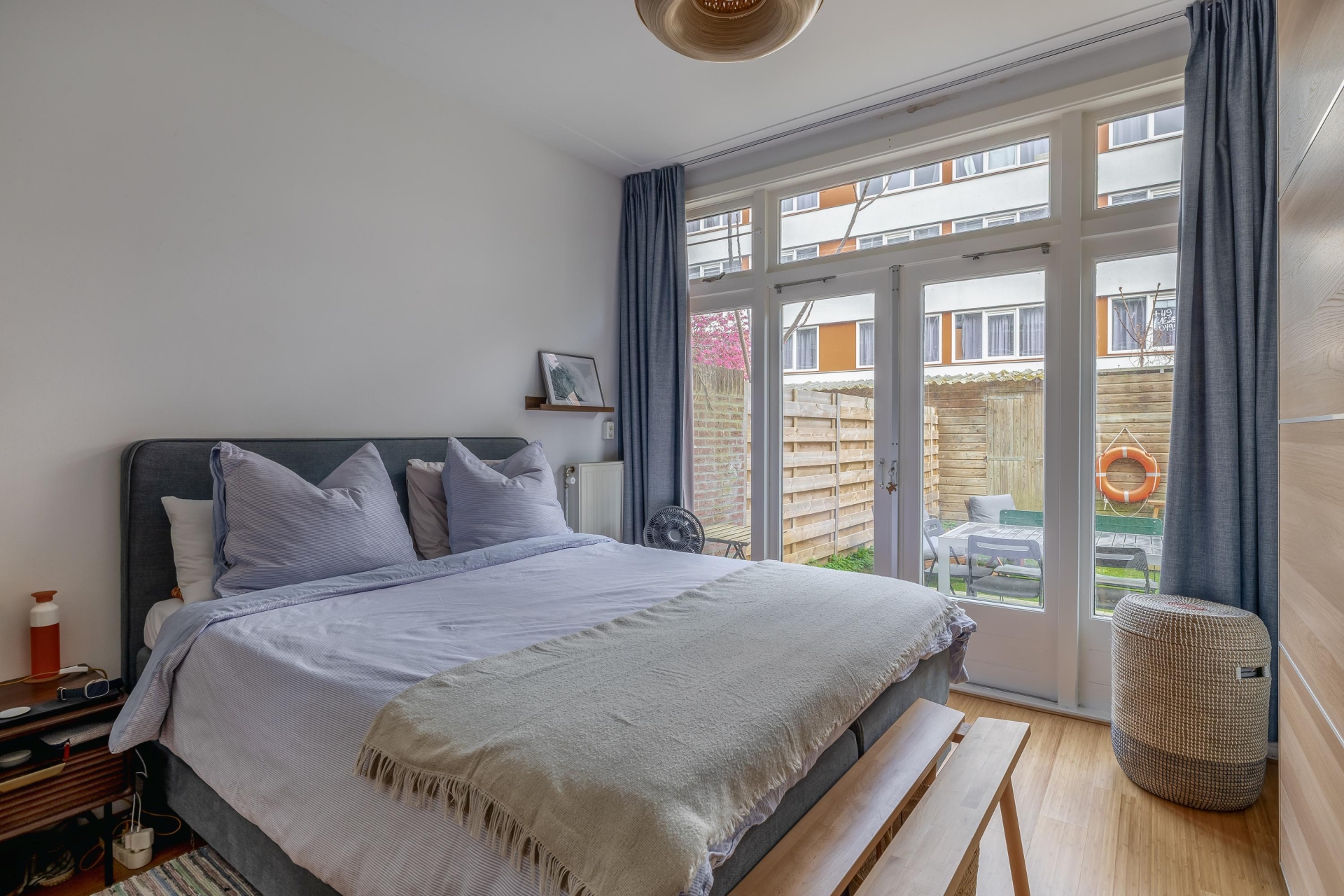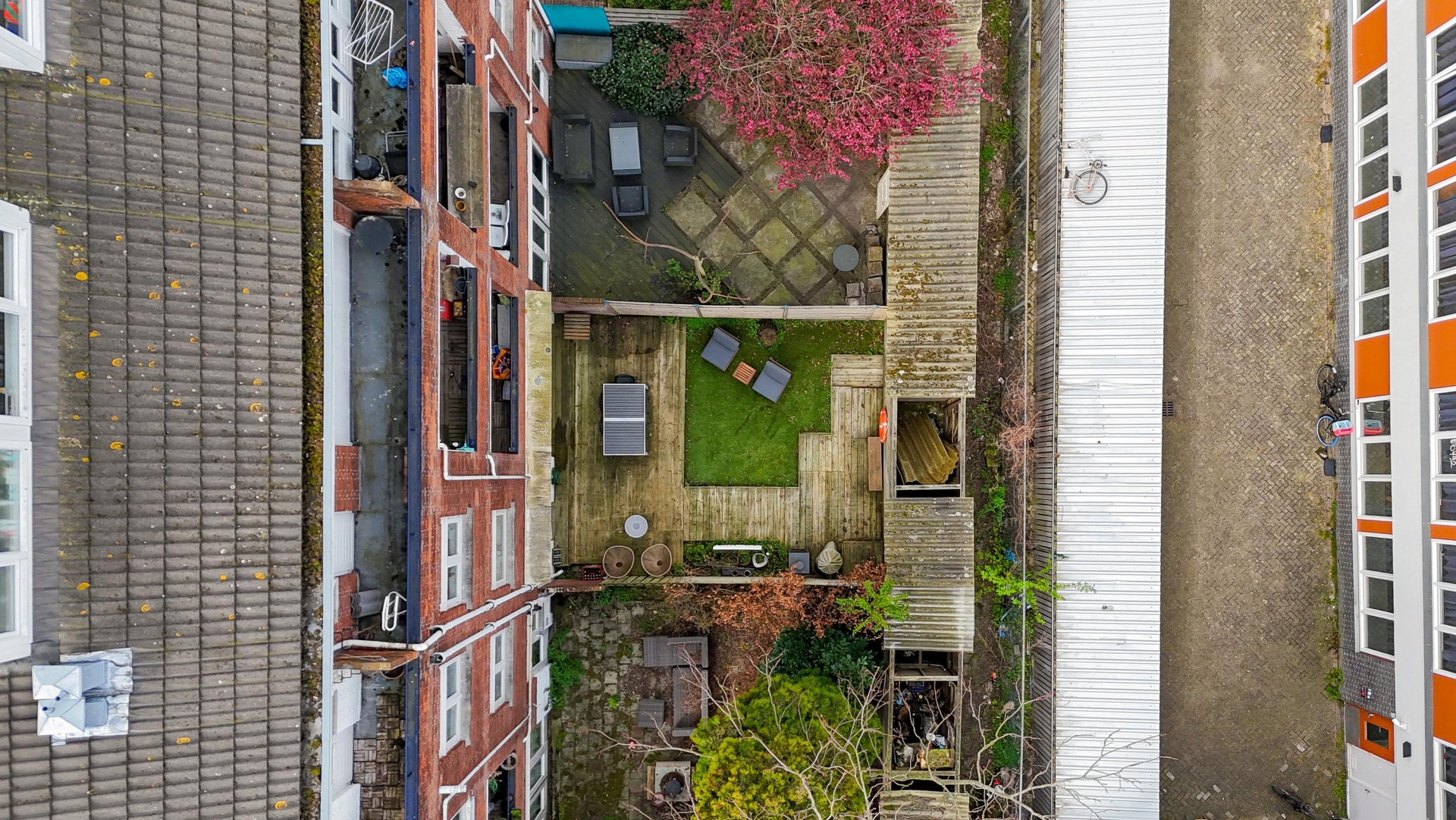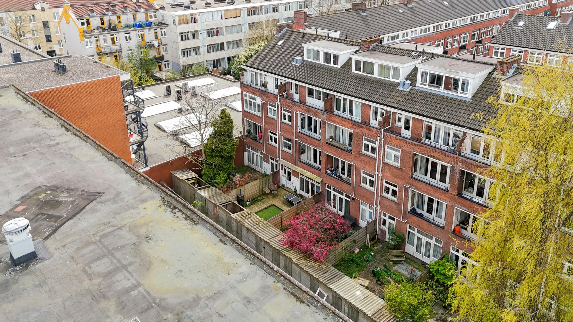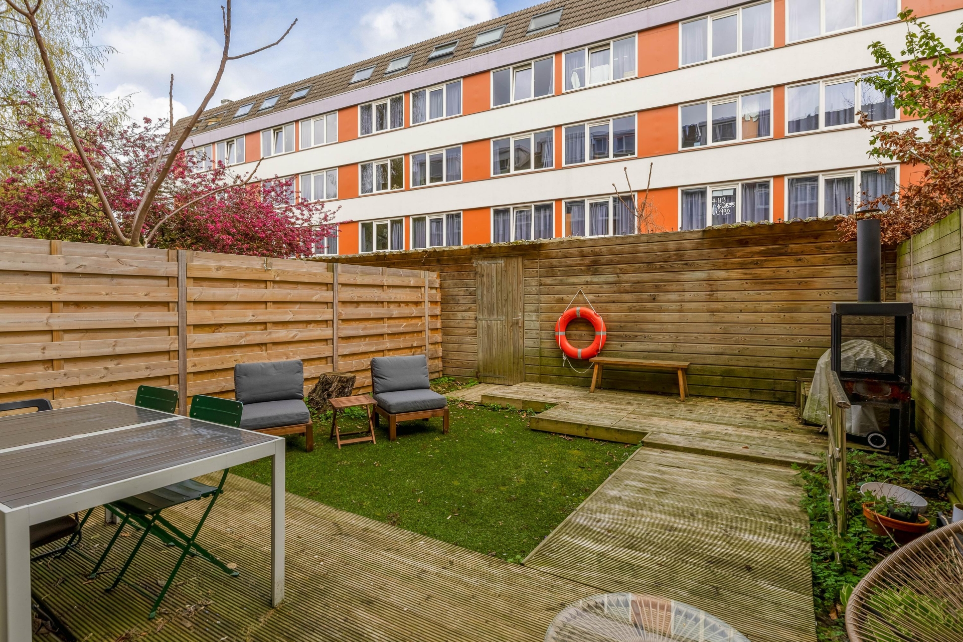 Een van de grote pluspunten van dit huis is de achtertuin. Met een diepte van circa 7 meter heb je hier opvallend veel buitenruimte voor een appartement. De tuin is een combinatie van terras en groen, waardoor je meerdere zitplekken kunt creëren. Of je nu rustig wilt genieten van een kop koffie in de ochtendzon of met vrienden wilt borrelen op een zomeravond, hier kan het allemaal. De houten schuttingen zorgen voor privacy en een beschutte sfeer.