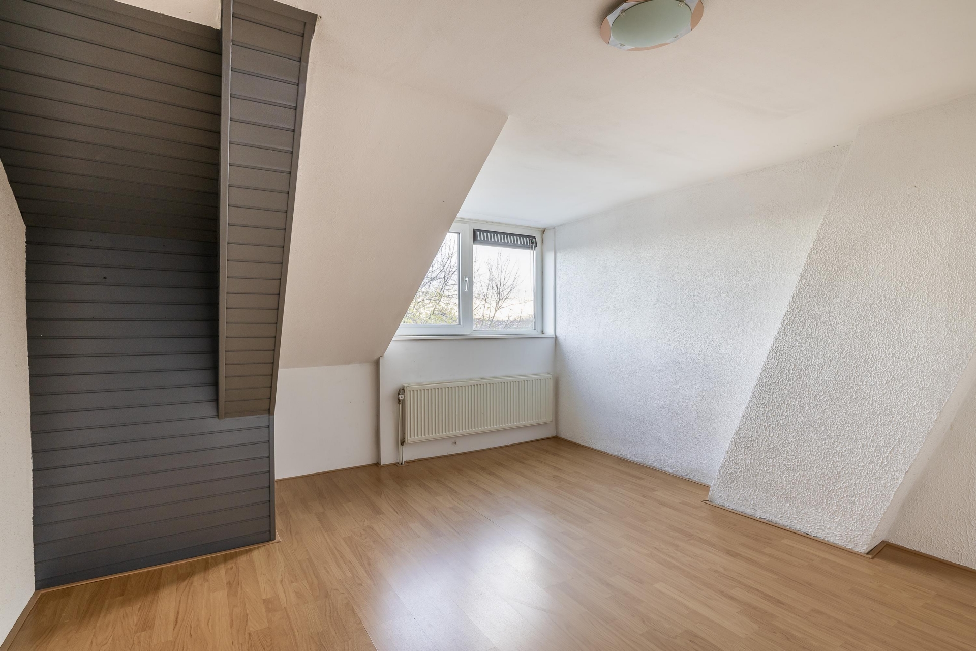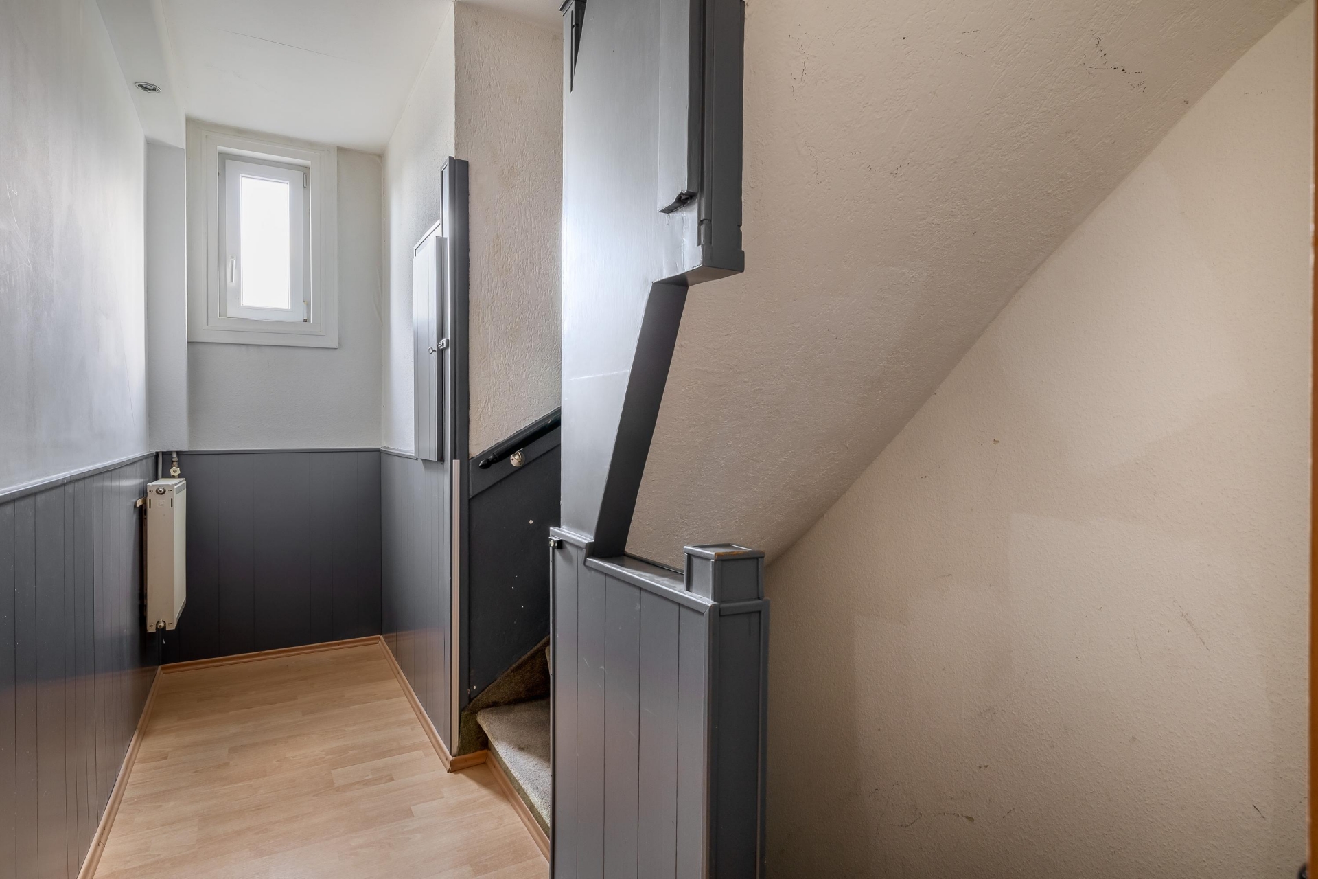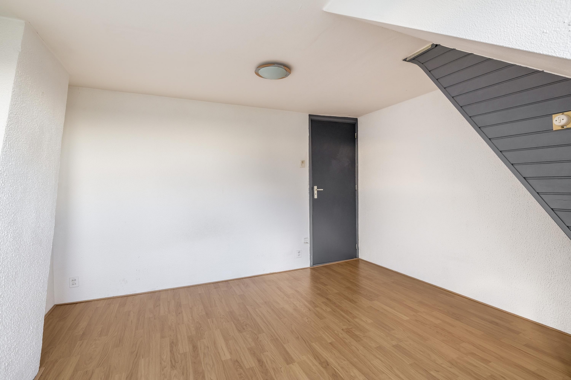 De woonkamer valt direct op door de grote ramen die zorgen voor veel daglicht en een prachtig uitzicht op het water en groen. Dankzij de ruime indeling is er plek voor een royale zithoek én een eethoek. De laminaatvloer en de trapopgang zijn verzorgd afgewerkt, waardoor het geheel een warme en moderne uitstraling krijgt.