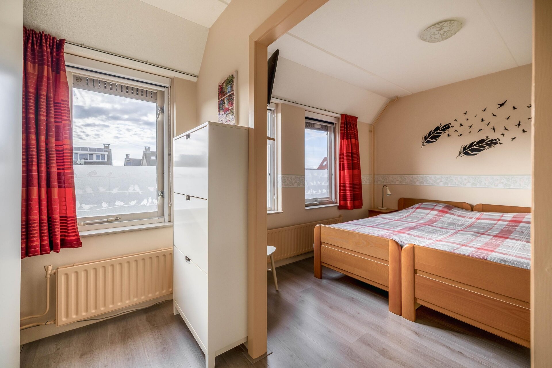 Op de eerste verdieping vind je twee slaapkamers en de badkamer. De grootste slaapkamer ligt aan de achterzijde, is voorzien van royale inloopkast (voorheen slaapkamer) en kijkt uit over de diepe tuin. De tweede kamer, aan de voorzijde is ideaal als kinder- of werkkamer. De badkamer is functioneel ingericht met een douche, wastafel en toilet. De tweede verdieping biedt nog een derde slaapkamer met dakraam en bergruimte achter de knieschotten.