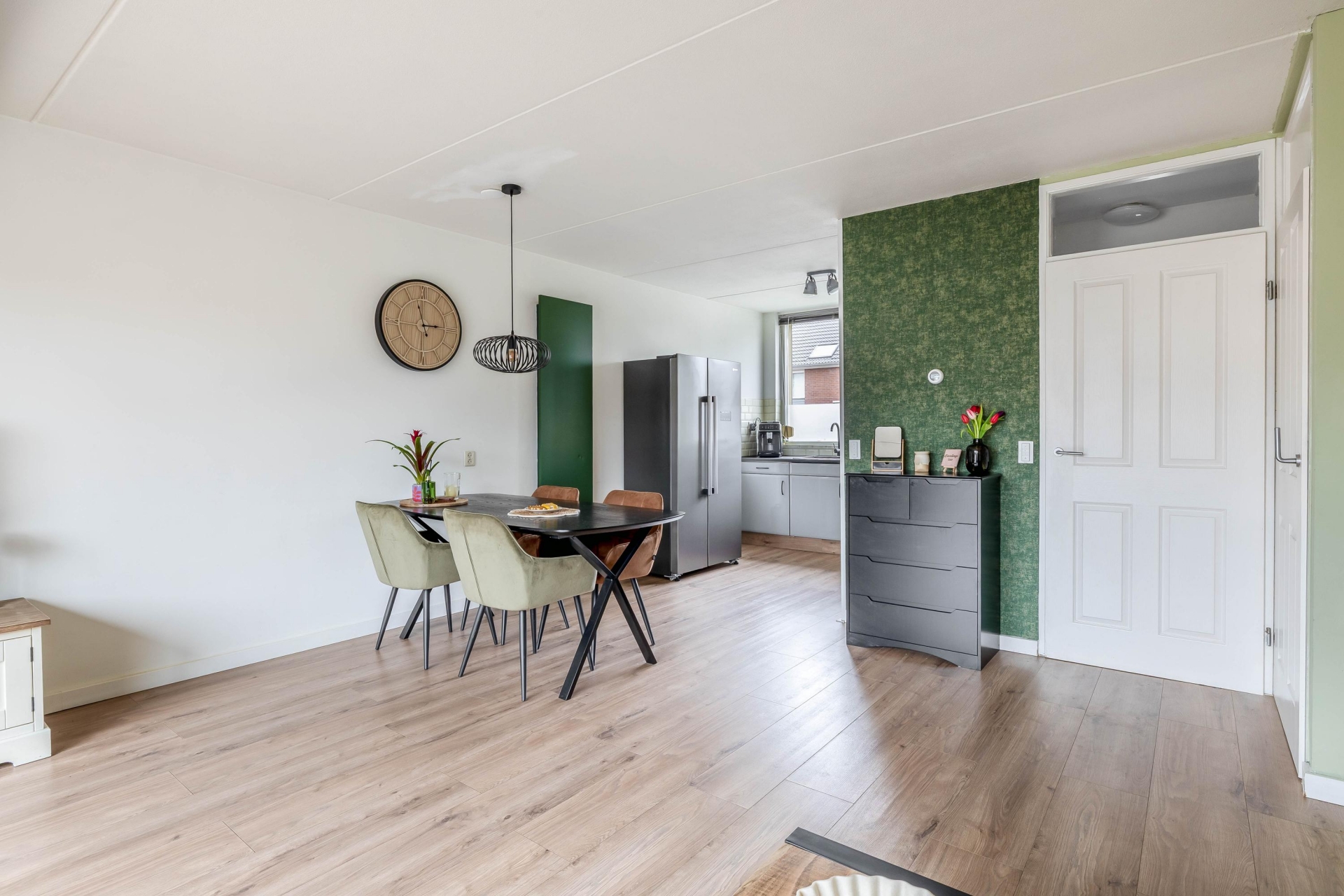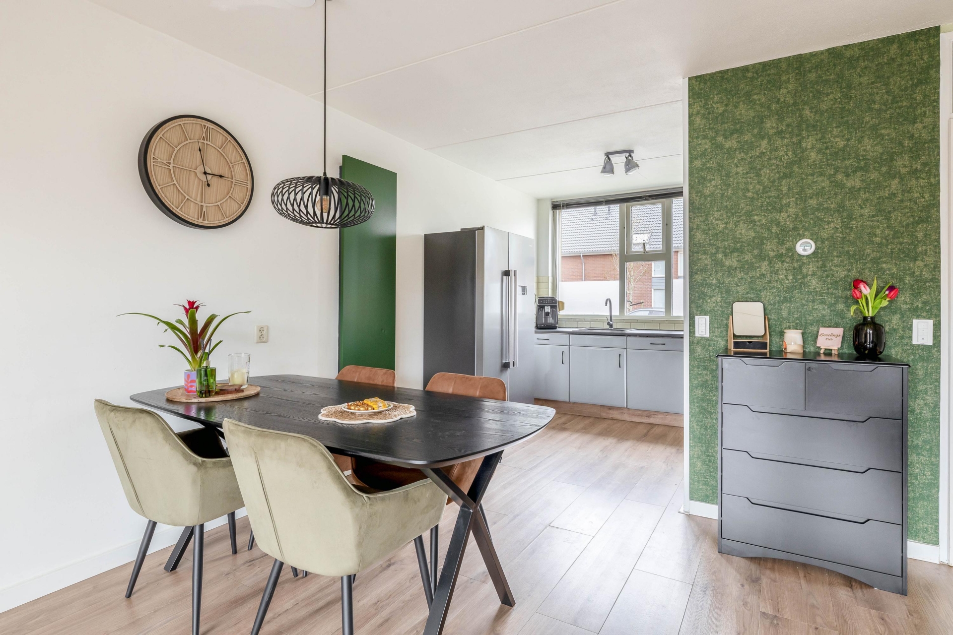 Aan de voorzijde bevindt zich de keuken, opgesteld in een praktische opstelling. Vanuit de keuken kijk je uit over de straat, wat zorgt voor een levendig en open gevoel. Er is voldoende werk- en bergruimte aanwezig, waardoor koken hier comfortabel is. De indeling van de begane grond is logisch en zorgt ervoor dat elke vierkante meter goed wordt benut.