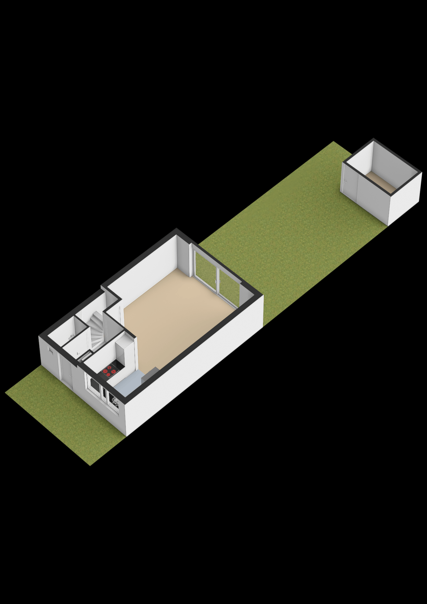Bij binnenkomst kom je in de entree met toegang tot het toilet, de meterkast en de trap naar boven. Vanuit hier loop je door naar de woonkamer aan de achterzijde van het huis. Deze ruimte is prettig licht dankzij de grote schuifpui en biedt voldoende plek voor een ruime zithoek. Het contact met de tuin maakt dit een fijne leefruimte waar binnen en buiten moeiteloos in elkaar overlopen.