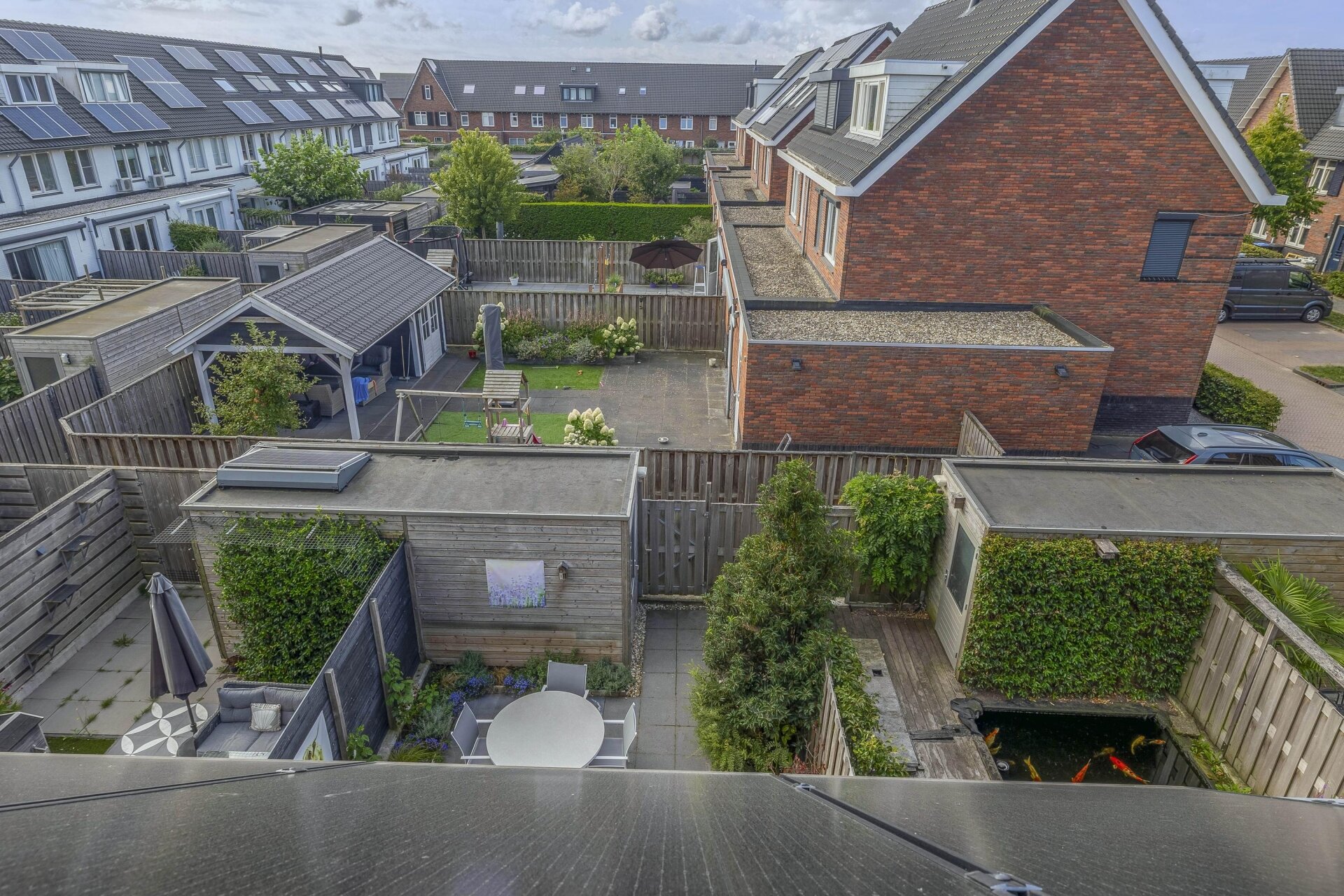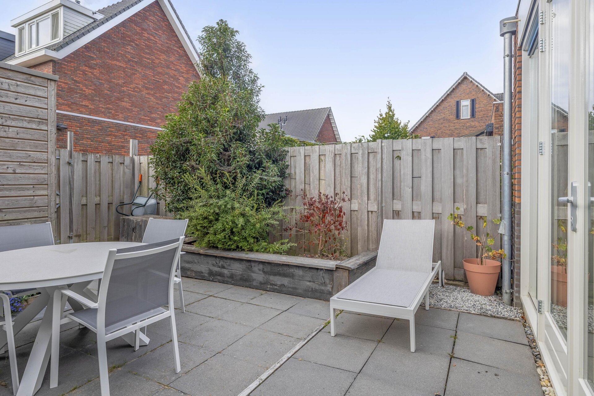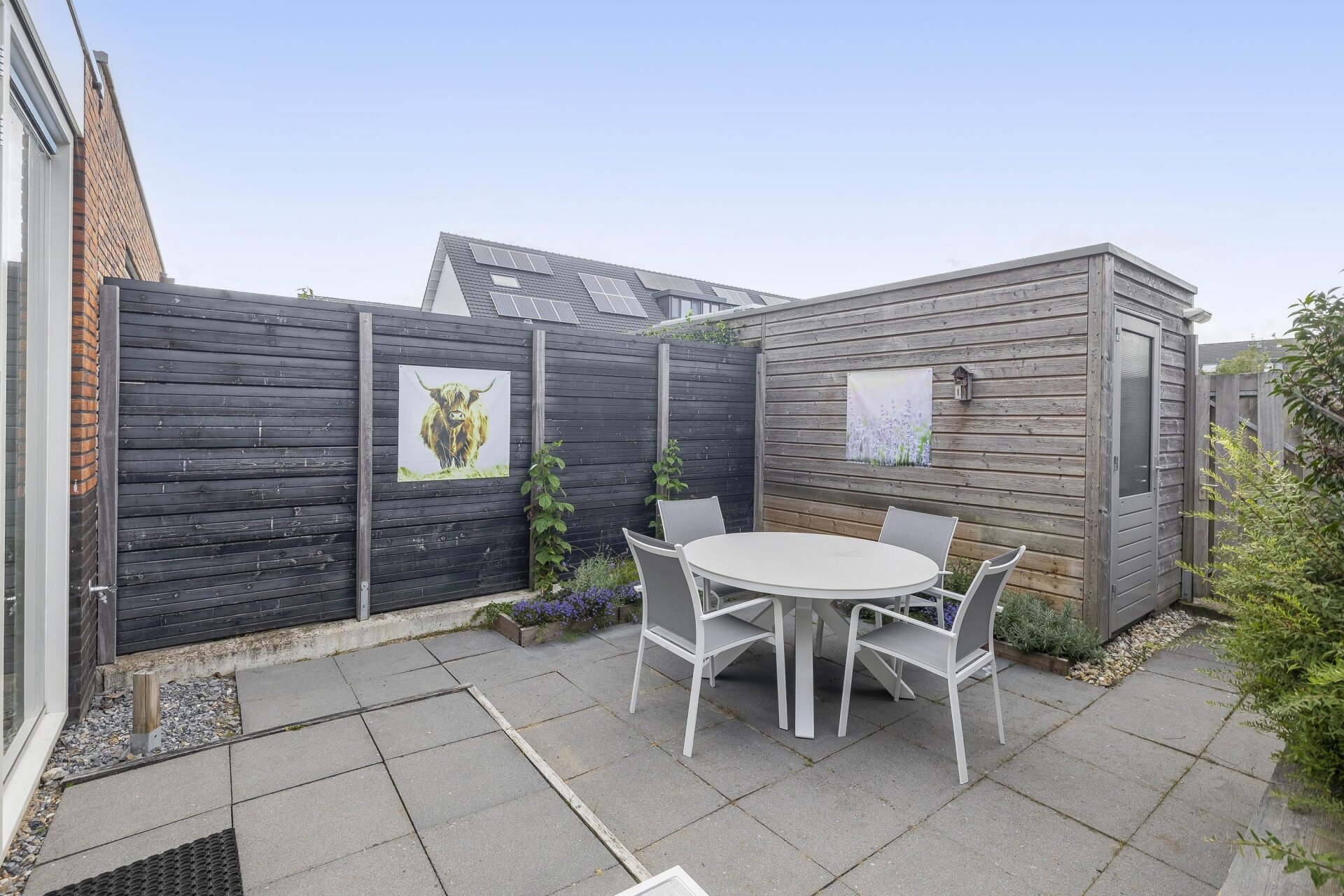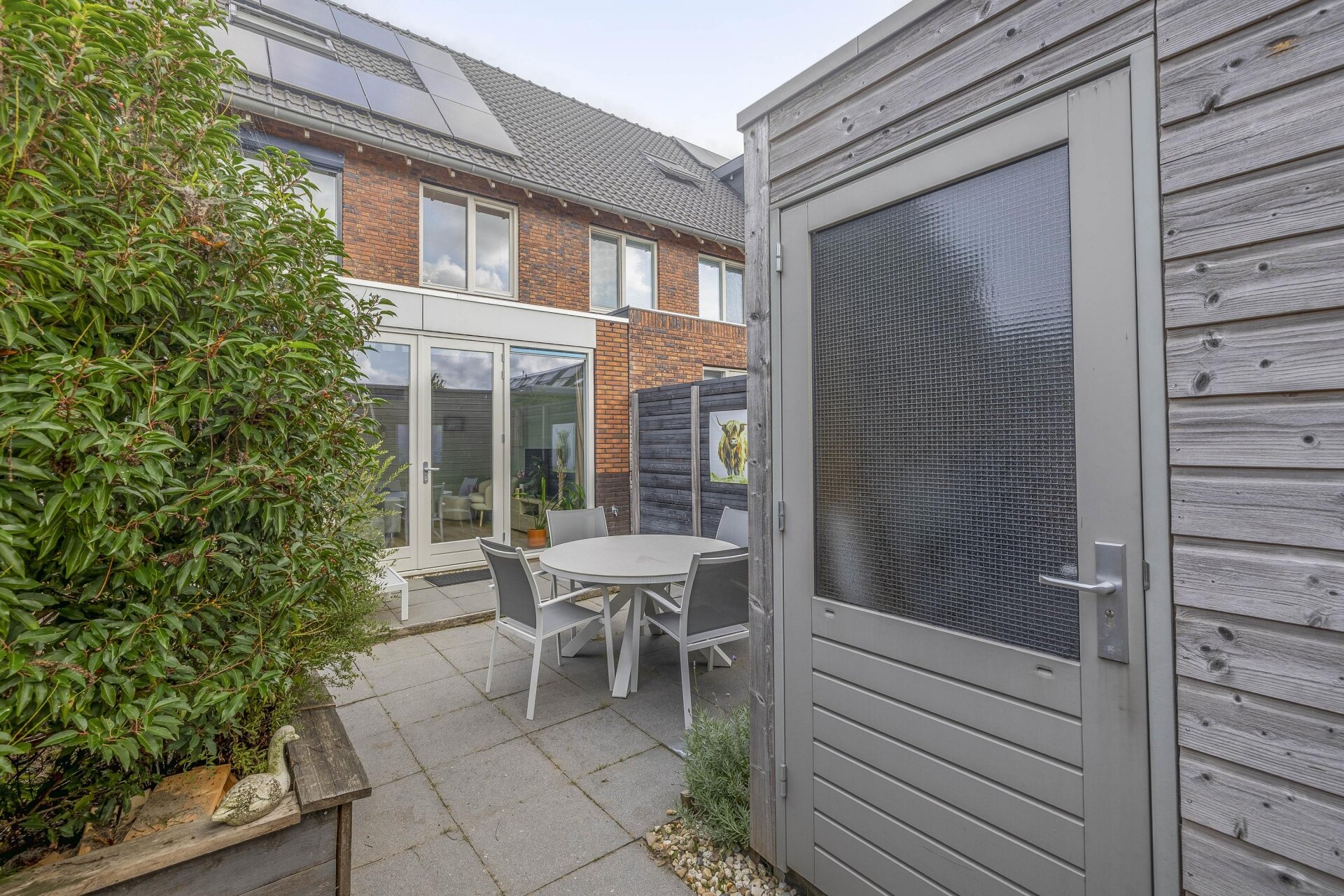 De achtertuin ligt pal op het zuiden: een groot pluspunt voor iedereen die graag buiten leeft. Hier kun je al vroeg in het voorjaar tot laat in de avond genieten van de zon. Het terras is praktisch aangelegd en biedt genoeg ruimte voor een eettafel en loungehoek. Achterin de tuin een houten berging en toegang tot het achterpad.