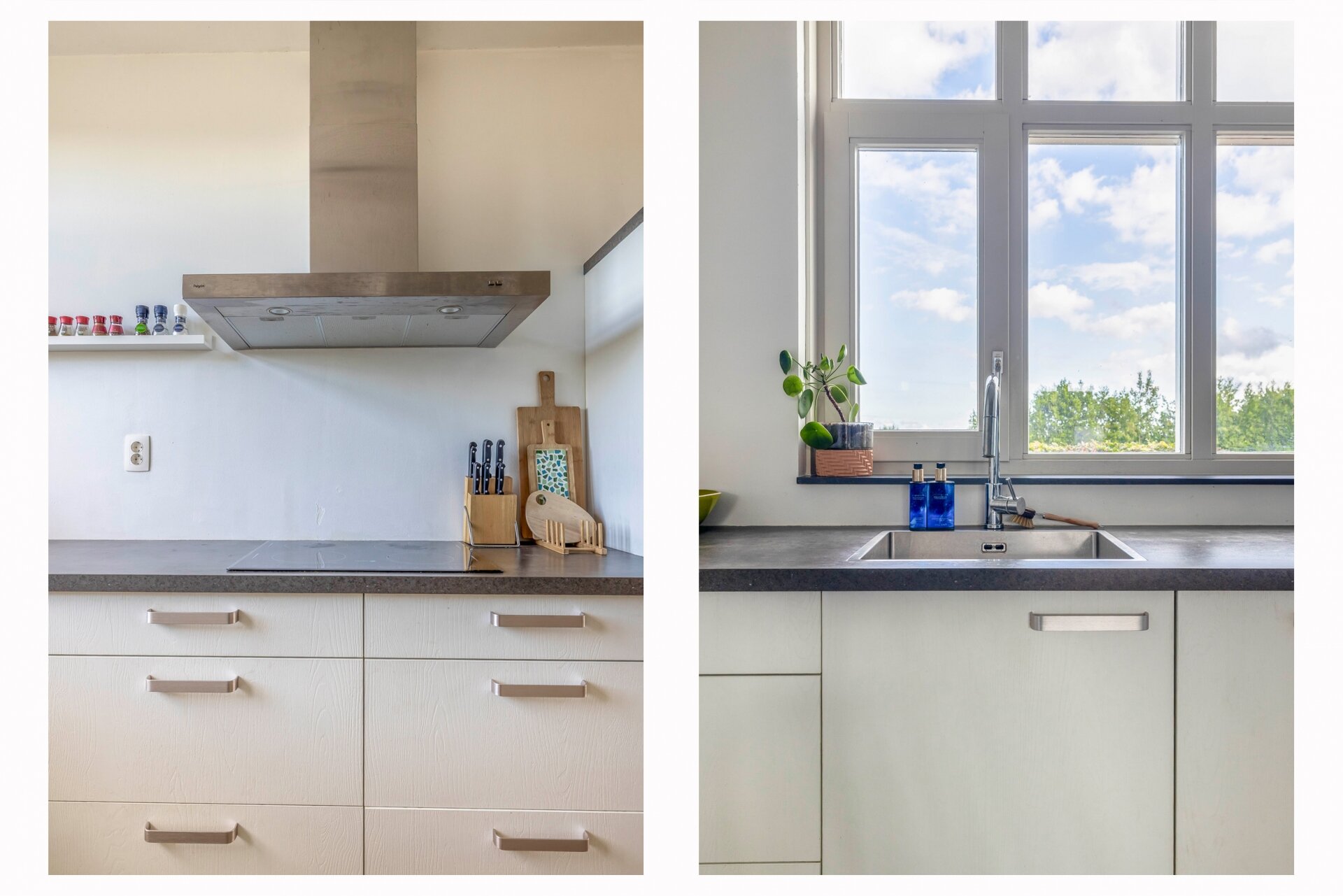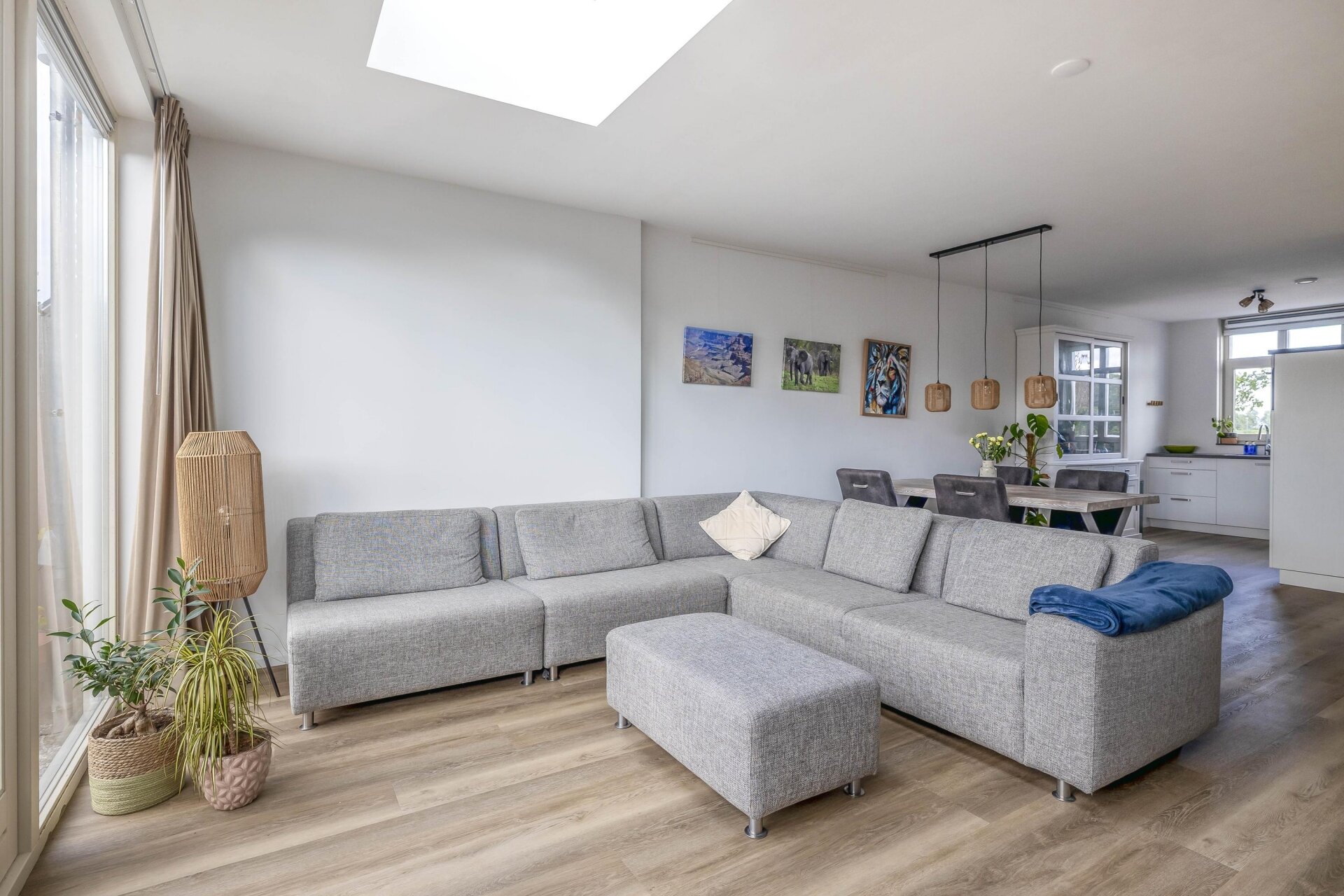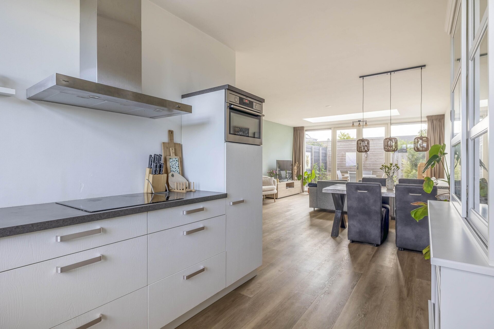De uitgebouwde woonkamer aan de achterzijde van de woning is een hele fijne lichte plek. Dankzij de lichtkoepel en de openslaande deuren naar de tuin geeft dit een prettige verbinding met buiten. De zithoek is royaal genoeg voor een grote hoekbank en biedt tegelijk een knusse sfeer. De keuken ligt aan de voorzijde met zicht op de straat heeft een praktische indeling met voldoende werk- en bergruimte, ideaal voor wie van koken houdt en is voorzien van diverse inbouwapparatuur waaronder een vaatwasser, inductiekookplaat, koelvriescombinatie en combi oven.