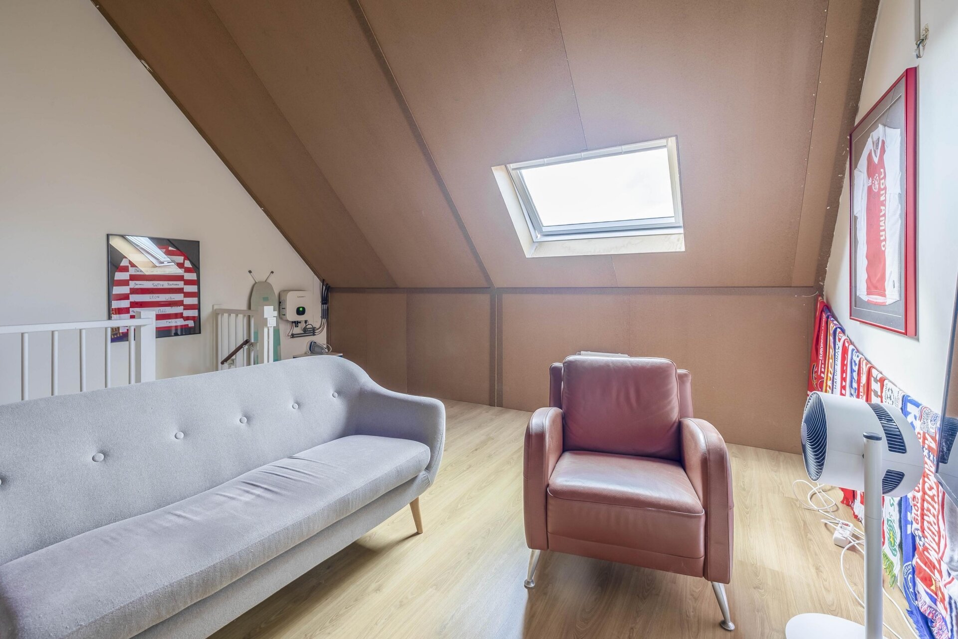 Een vaste trapt brengt ons op de 2e verdieping en biedt nog een zee aan ruimte en licht waardoor hier eventueel een 4e slaapkamer gecreerd kan worden maar ook leent deze etage zich prima als werkkamer, logeerplek of hobbyruimte.