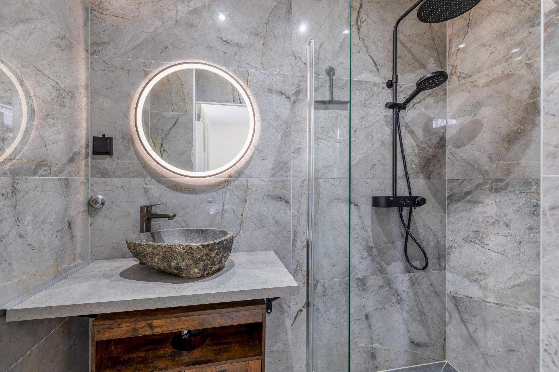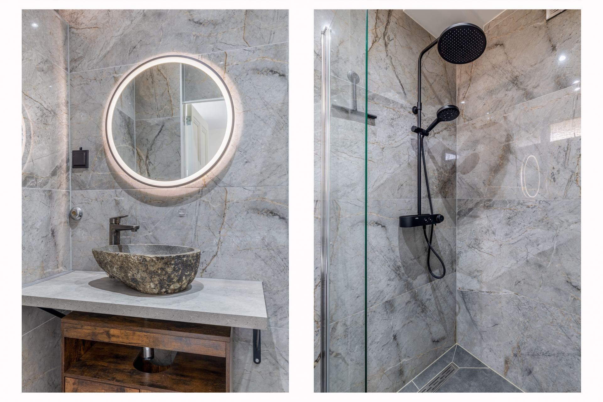 De badkamer en het toilet zijn eveneens volledig vernieuwd en dat zie je terug in de afwerking. De badkamer is stijlvol ingericht met een inloopdouche, modern wastafelmeubel en mooie materialen die zorgen voor een luxe uitstraling. Het separate toilet is in dezelfde lijn afgewerkt, wat zorgt voor een mooi geheel.