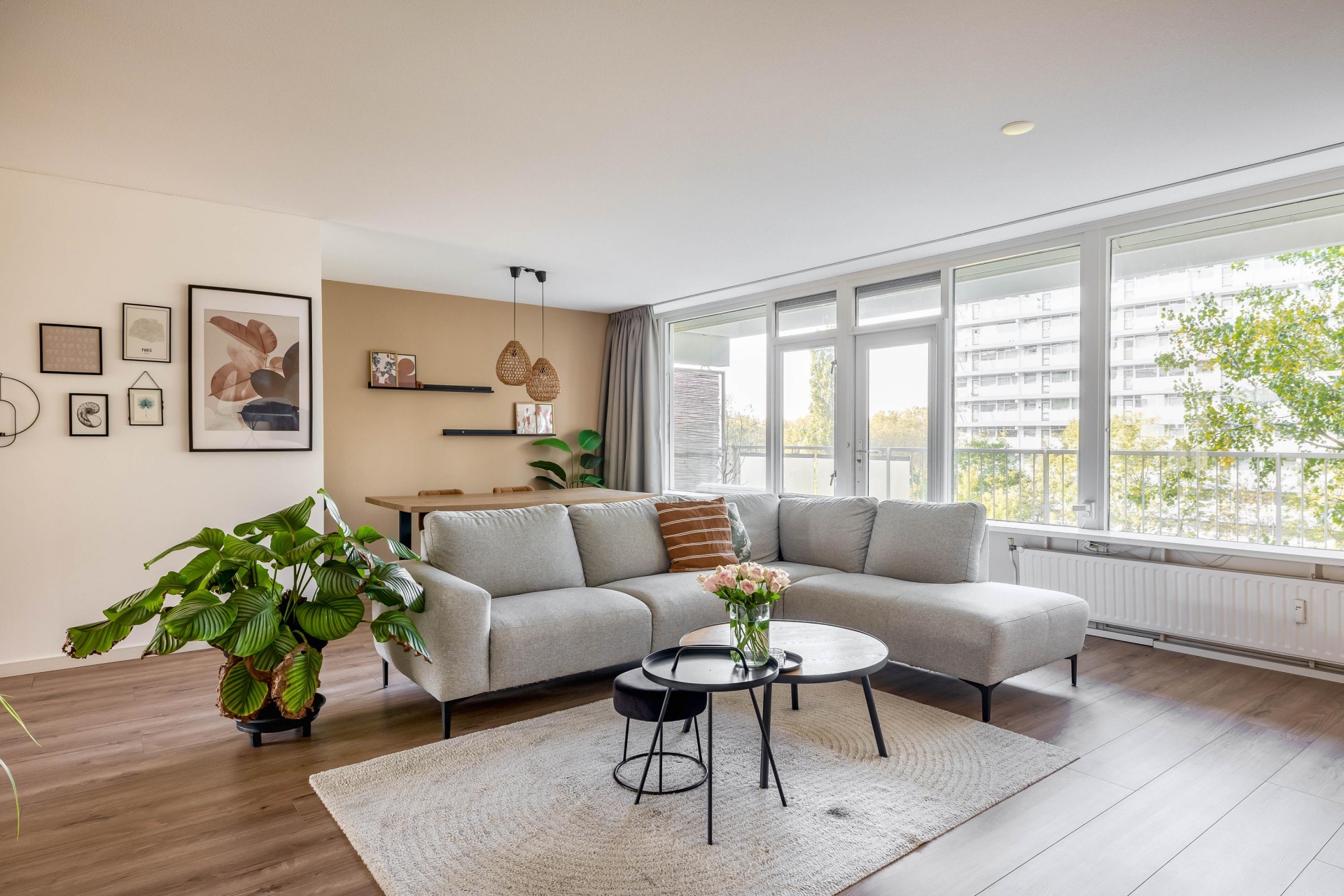 De woonkamer is royaal opgezet en oogt nog ruimer dankzij de grote raampartijen die het daglicht overvloedig binnenlaten. Vanuit hier stap je zo het zonnige balkon op het zuidwesten op, waar je tot in de late uurtjes kunt genieten van de zon. Dankzij de slimme indeling is er volop ruimte voor een comfortabele zithoek én een sfeervolle eethoek.