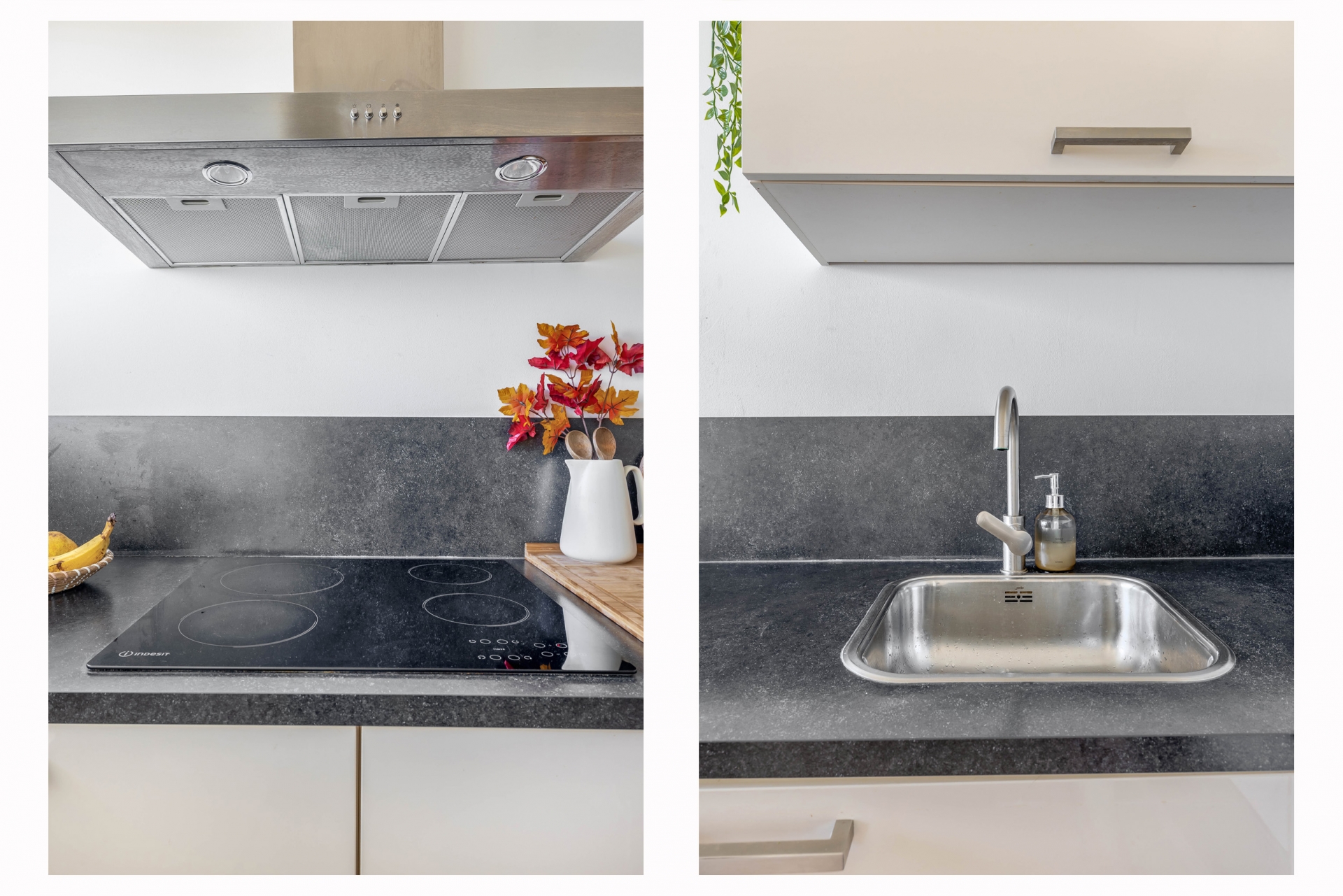 De keuken is uitgevoerd in een moderne, matte stijl met een rustige uitstraling. Dankzij de praktische indeling, ruime werkbladen en complete inbouwapparatuur kook je hier met plezier. De badkamer sluit daar naadloos op aan: stijlvol afgewerkt met luxe tegels, voorzien van een inloopdouche, wastafelmeubel en een aansluiting voor de wasmachine. Alles straalt kwaliteit uit, klaar om zo te betrekken.