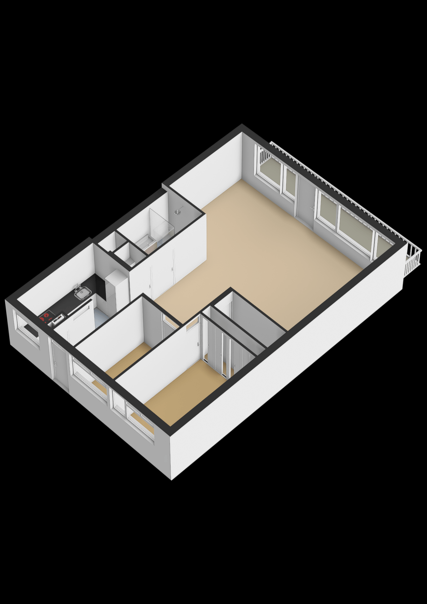 Het appartement telt twee slaapkamers. Aan de voorzijde bevinden zich twee kamers van circa 6 m² en 10 m², waarvan de grootste is voorzien van een handige vaste kast.