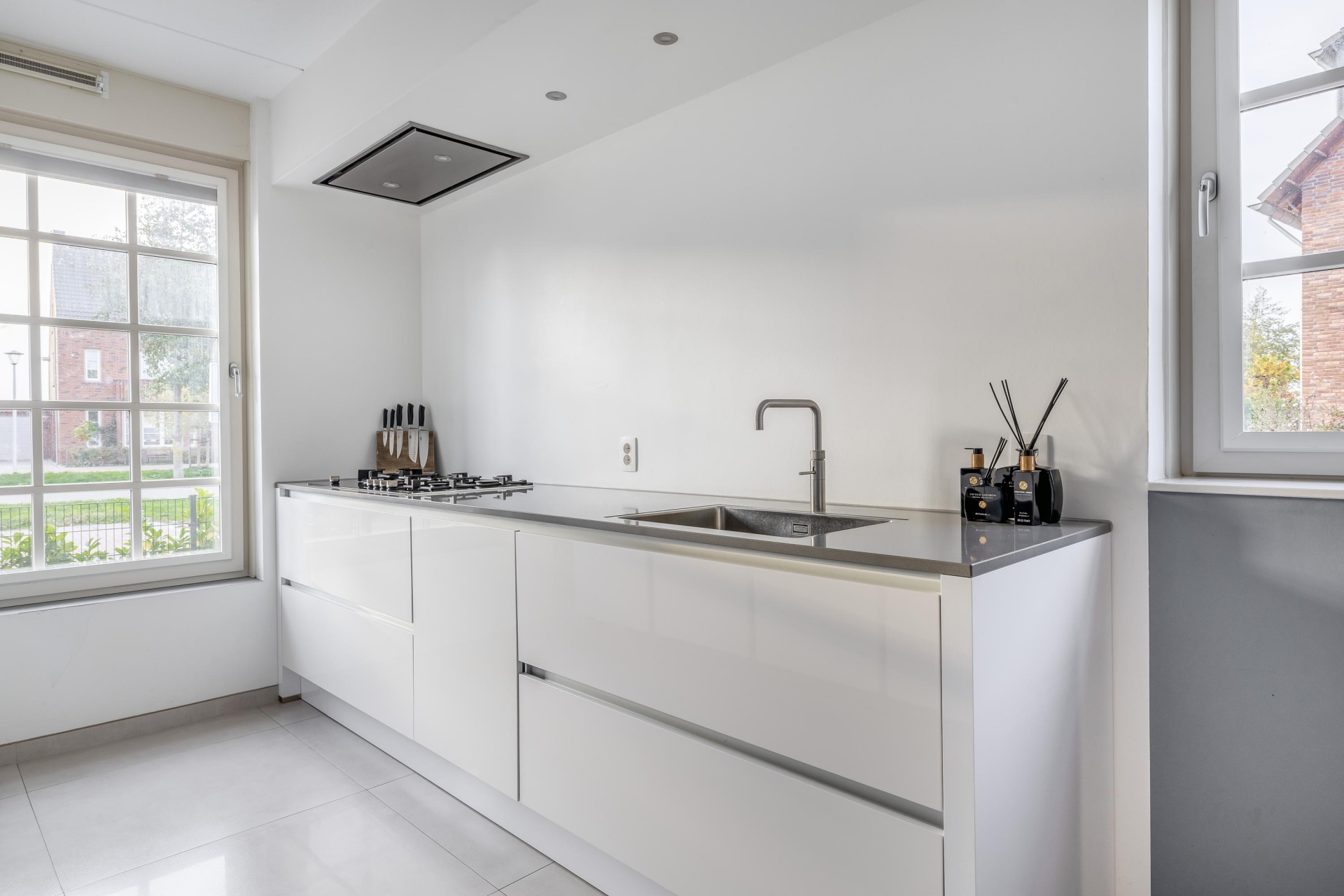 De open keuken aan de voorzijde is modern uitgevoerd met greeploze kasten, een vijfpits gaskookplaat, afzuiging verwerkt in het plafond en een strak werkblad. Vanuit hier kijk je fijn uit over de rustige straat. Ook de hal is tot in de puntjes verzorgd, met inbouwverlichting in de trap die zorgt voor een sfeervolle binnenkomst.