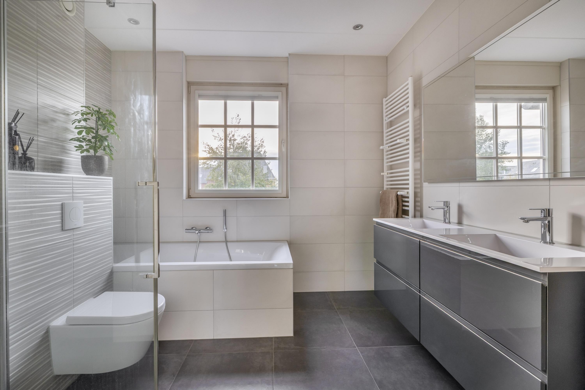 Op de eerste verdieping bevinden zich drie slaapkamers van verschillende afmetingen, stuk voor stuk keurig afgewerkt. De grootste kamer ligt aan de achterzijde en is ruim genoeg voor een groot tweepersoonsbed en kastruimte. De andere kamers zijn ideaal voor kinderen, een thuiskantoor of logeerkamer. De badkamer is modern en stijlvol uitgevoerd met een inloopdouche, ligbad, zwevend toilet en een wastafelmeubel. Alles strak betegeld in neutrale tinten, met oog voor detail.