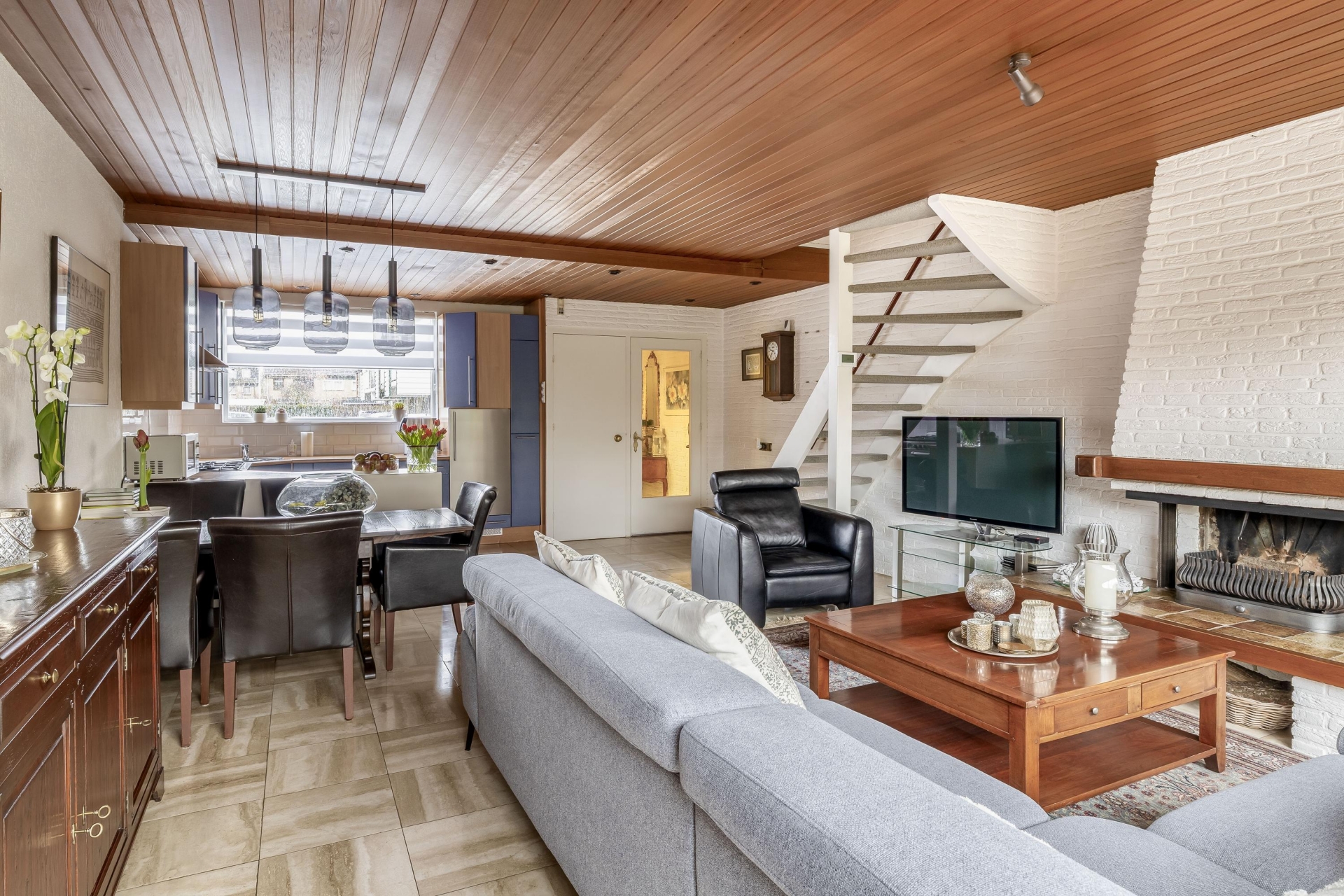 Entree/hal met meterkast, toilet met fontein en trapopgang naar de 1 verdieping. Riante woonkamer met openhaard, grote schuifpui en convectorput.