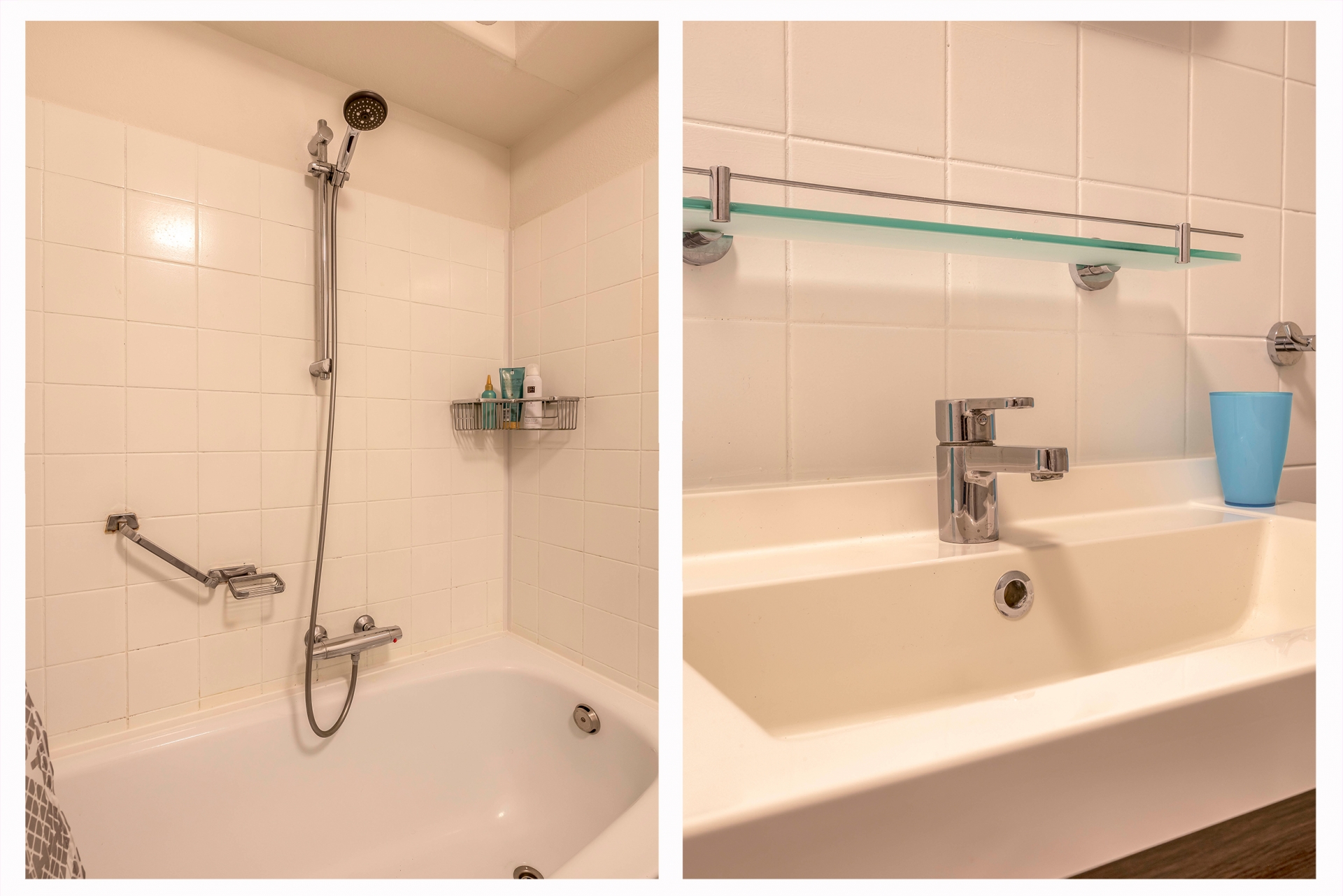 Centraal in het appartement bevindt zich de badkamer, uitgerust met een ligbad/douche, wastafel, verwarming en wasmachineaansluiting.