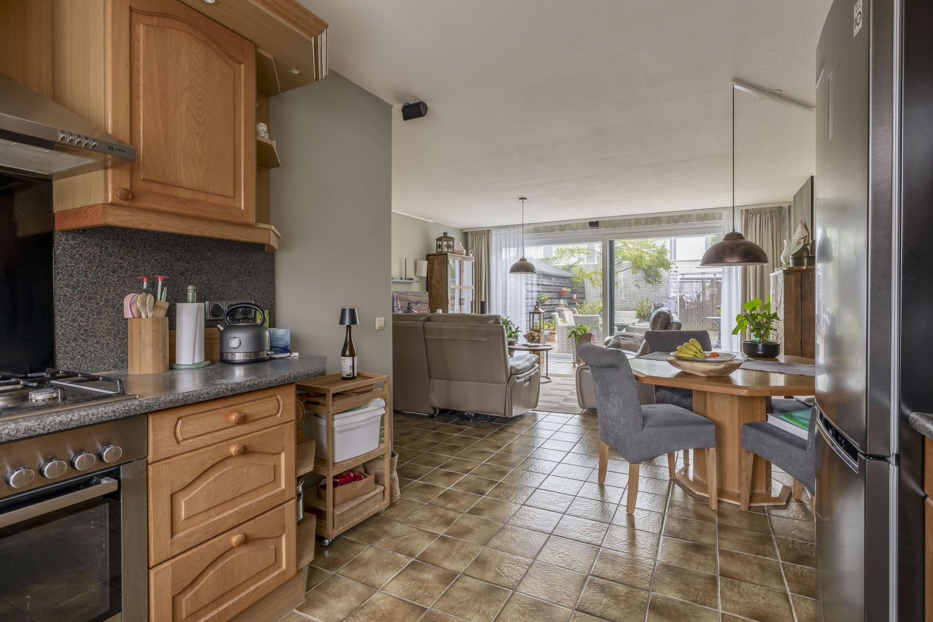 Aan de voorzijde vind je de royale keuken, uitgevoerd in een landelijke stijl met veel werk- en opbergruimte. De opstelling biedt voldoende plek voor al je kookgerei en apparatuur. Hier geniet je tijdens het koken van vrij uitzicht over de rustige straat.