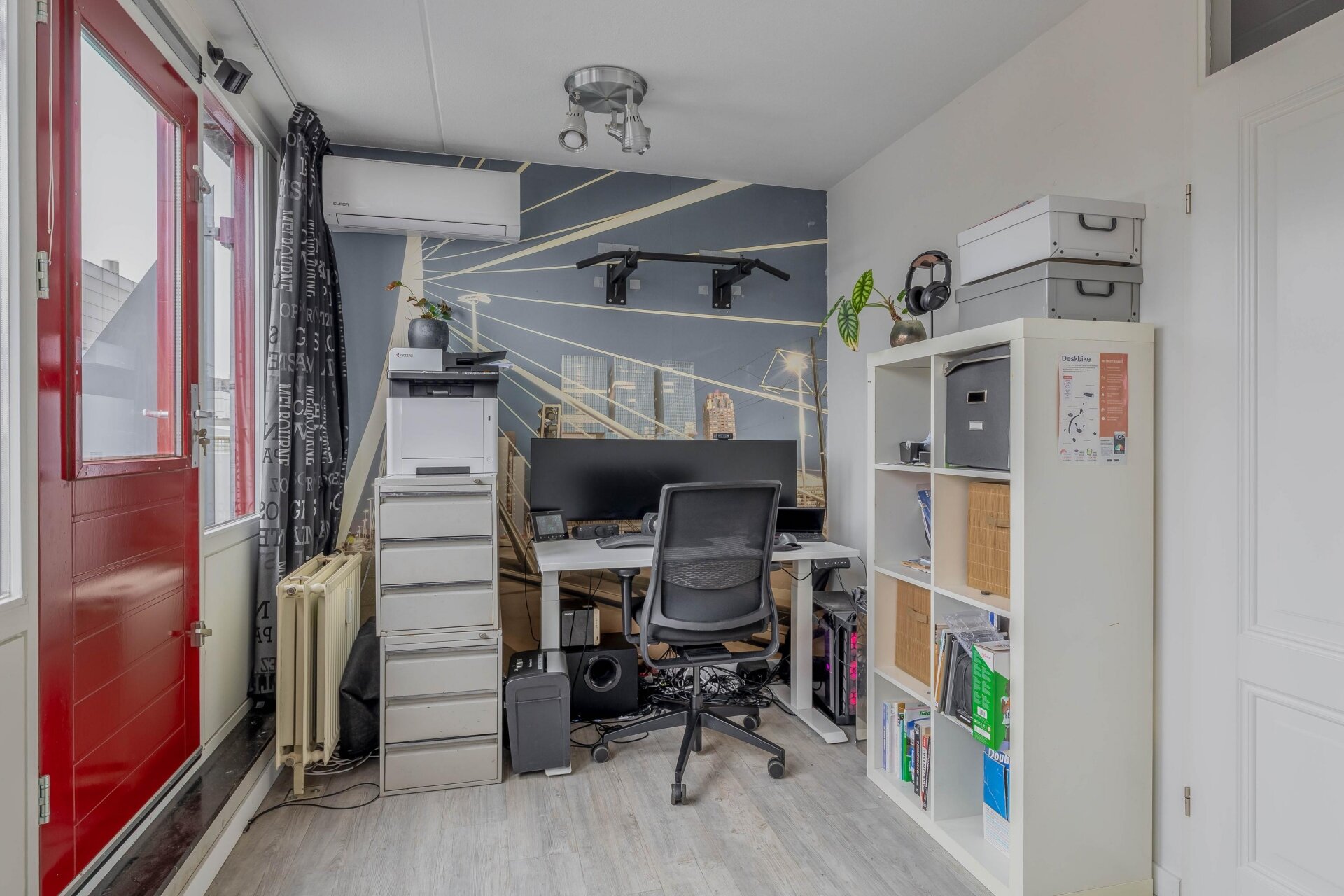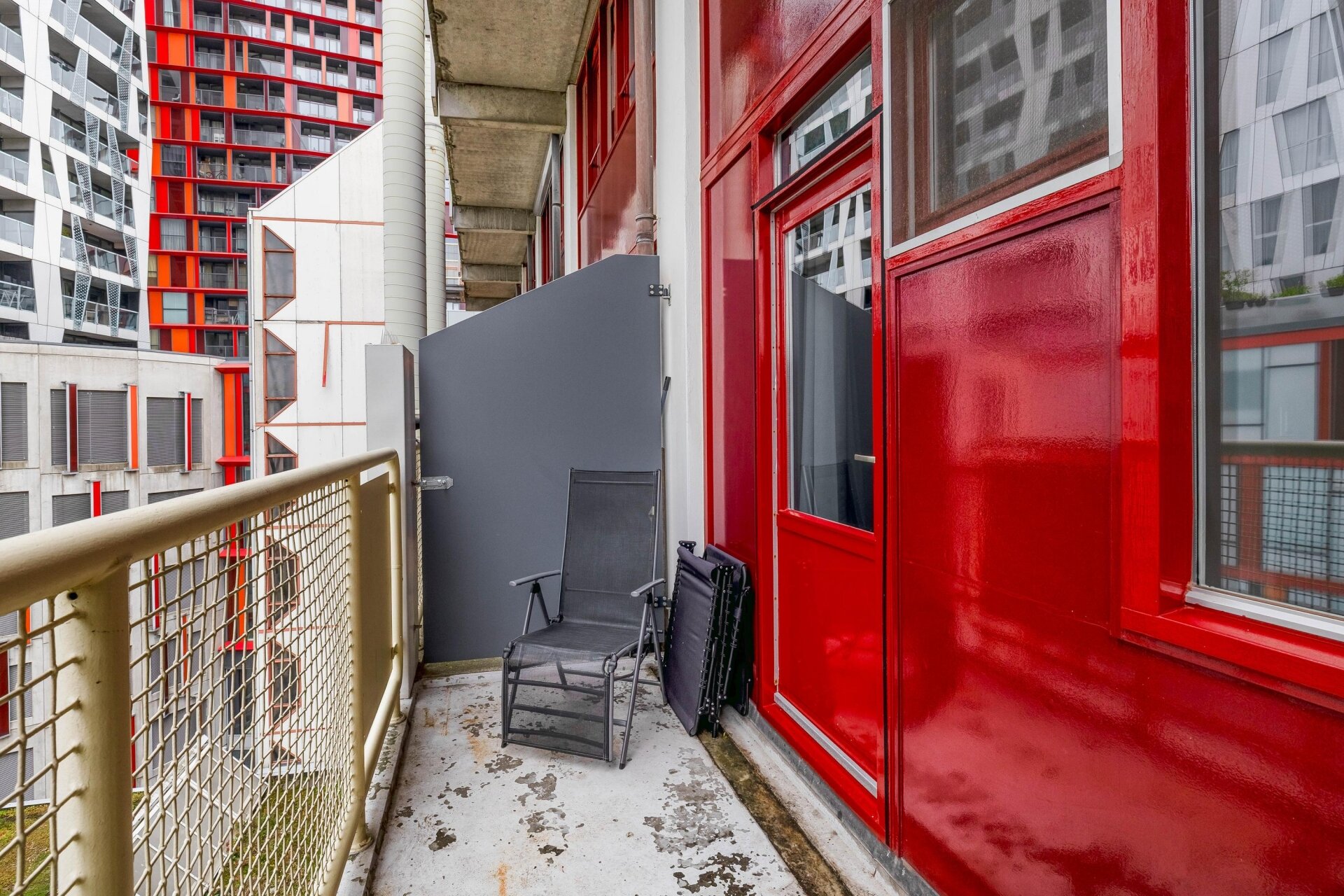 De indeling van het appartement is efficiënt en ruimtelijk opgezet. Er zijn in totaal twee royale slaapkamers. De eerste slaapkamer bevindt zich op de 6e verdieping, direct grenzend aan de entree van de woning. Vanuit deze slaapkamer, nu dienstdoende als werkkamer, betreed je het eerste balkon aan de oostzijde. Heerlijk voor ochtenden met een kop koffie. De andere slaapkamer, op de vijfde verdieping, is wat groter en perfect te gebruiken als master bedroom. Dankzij de praktische opzet en vaste kledingkast is er voldoende bergruimte in deze kamer. De strakke afwerking en het kleurgebruik zorgen voor een rustige sfeer in elke ruimte.