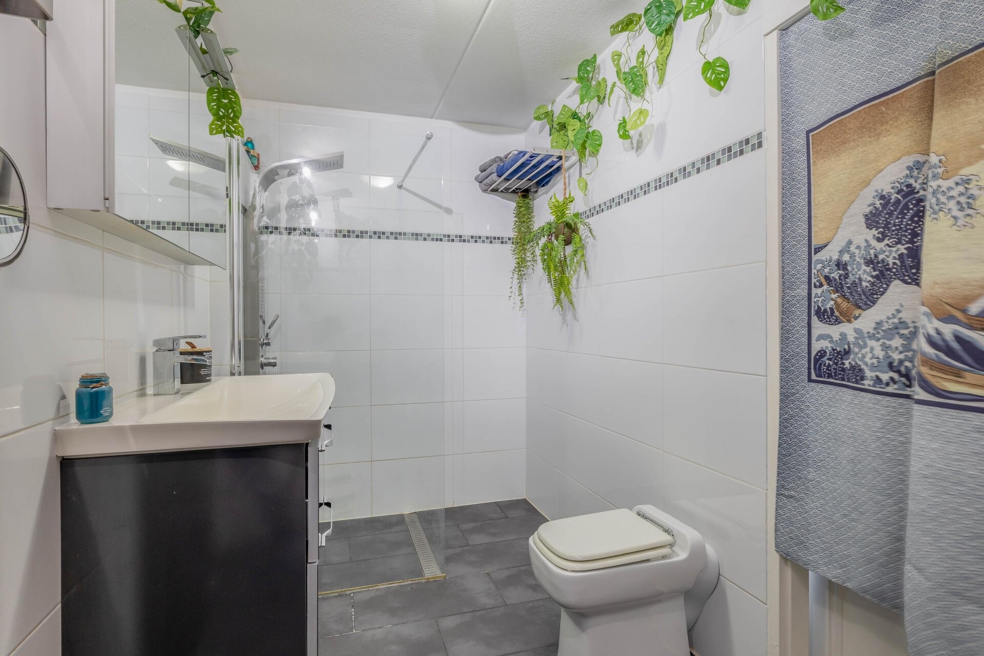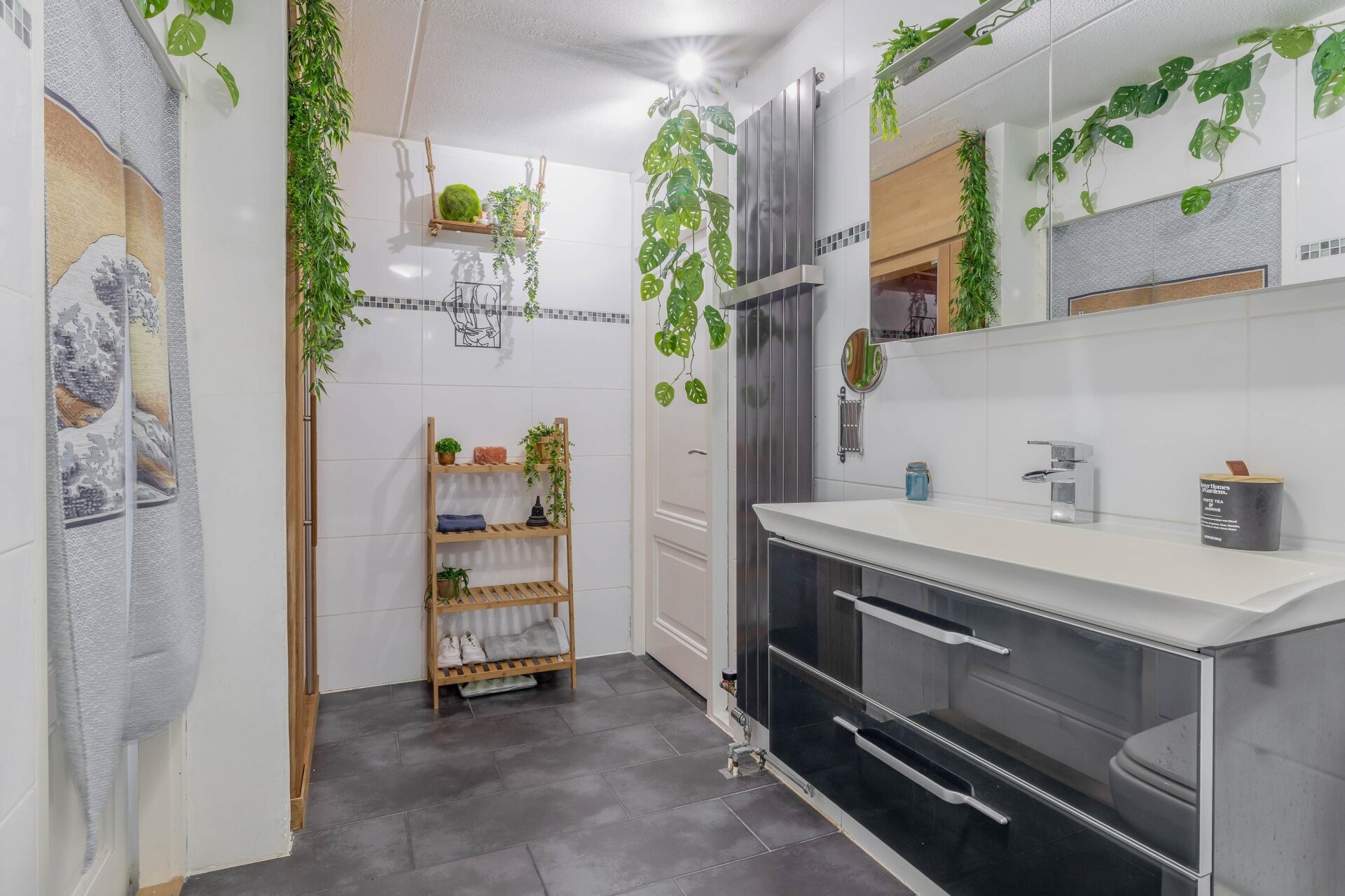 In de badkamer tref je iets bijzonders: een heerlijke privésauna. Daarnaast is de badkamer modern betegeld en voorzien van een ruime inloopdouche, wastafelmeubel en toilet. Alles is verzorgd, fris en instapklaar; ideaal voor wie geen zin heeft in klussen.
