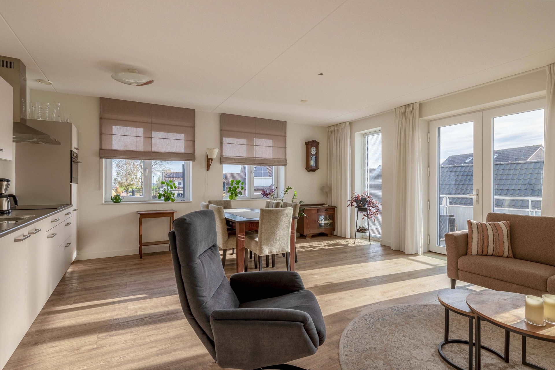 Bij binnenkomst valt direct de lichte en prettige sfeer op. De woonkamer en open keuken vormen samen een royale leefruimte waar je je meteen thuis voelt. Dankzij de grote ramen aan twee zijden is er de hele dag door veel natuurlijk lichtinval, wat de ruimte nog ruimtelijker maakt. De neutrale afwerking, strakke vloer en warme kleuraccenten zorgen voor een verzorgde uitstraling die moeiteloos aansluit op je eigen woonstijl.