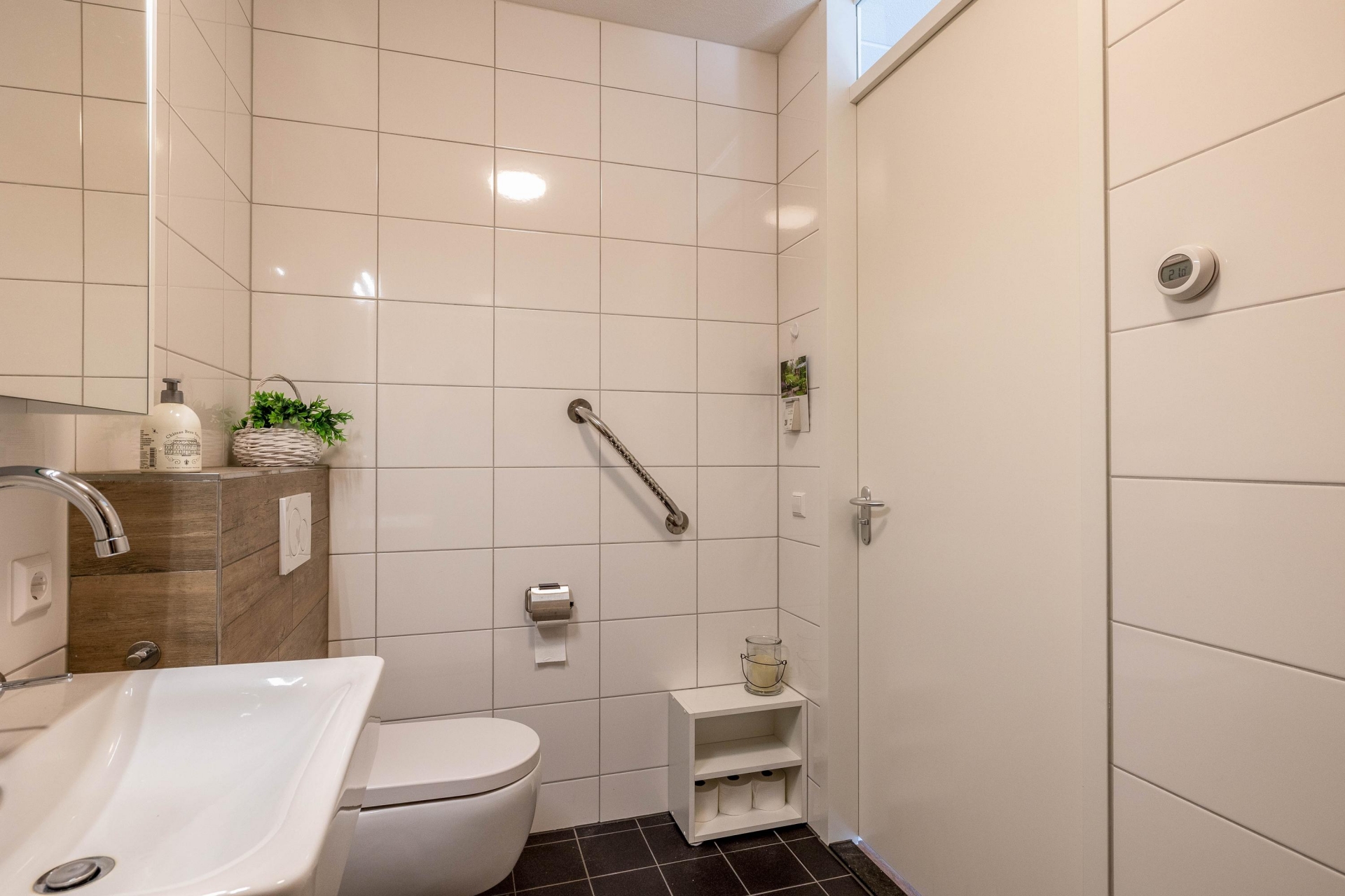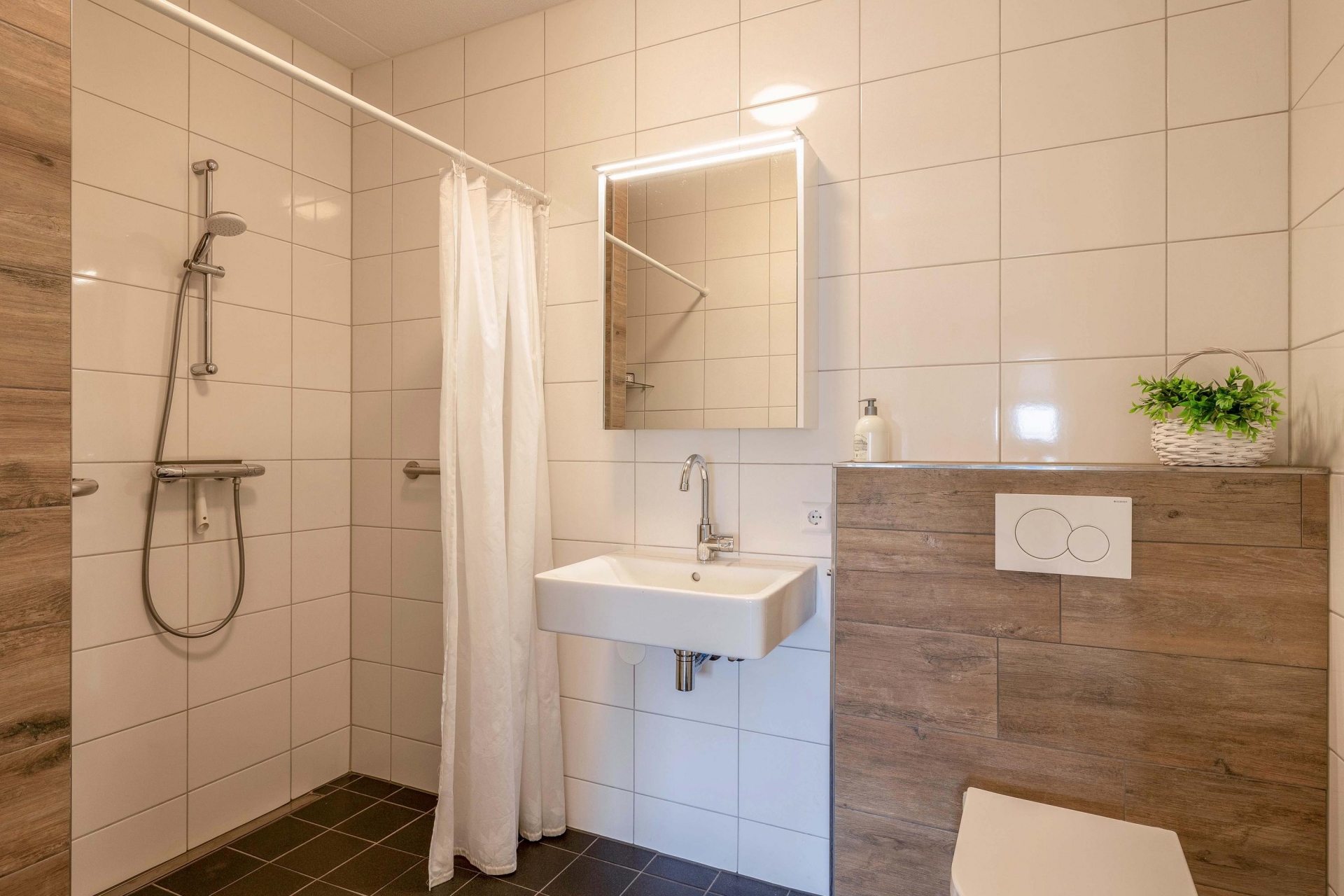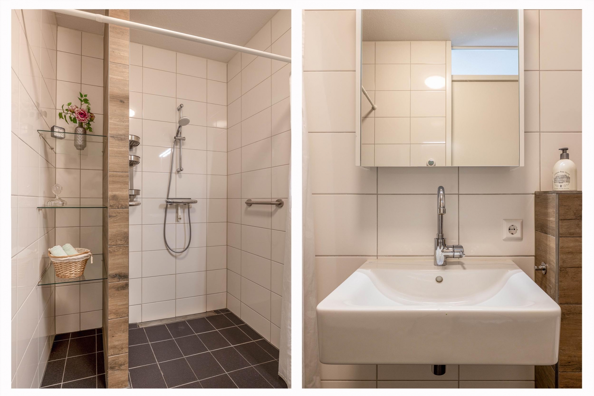 De badkamer is netjes en volledig uitgerust met een inloopdouche, wastafel en toilet. Ook aan praktische zaken is gedacht, zoals een interne berging voor wasmachine en droger.