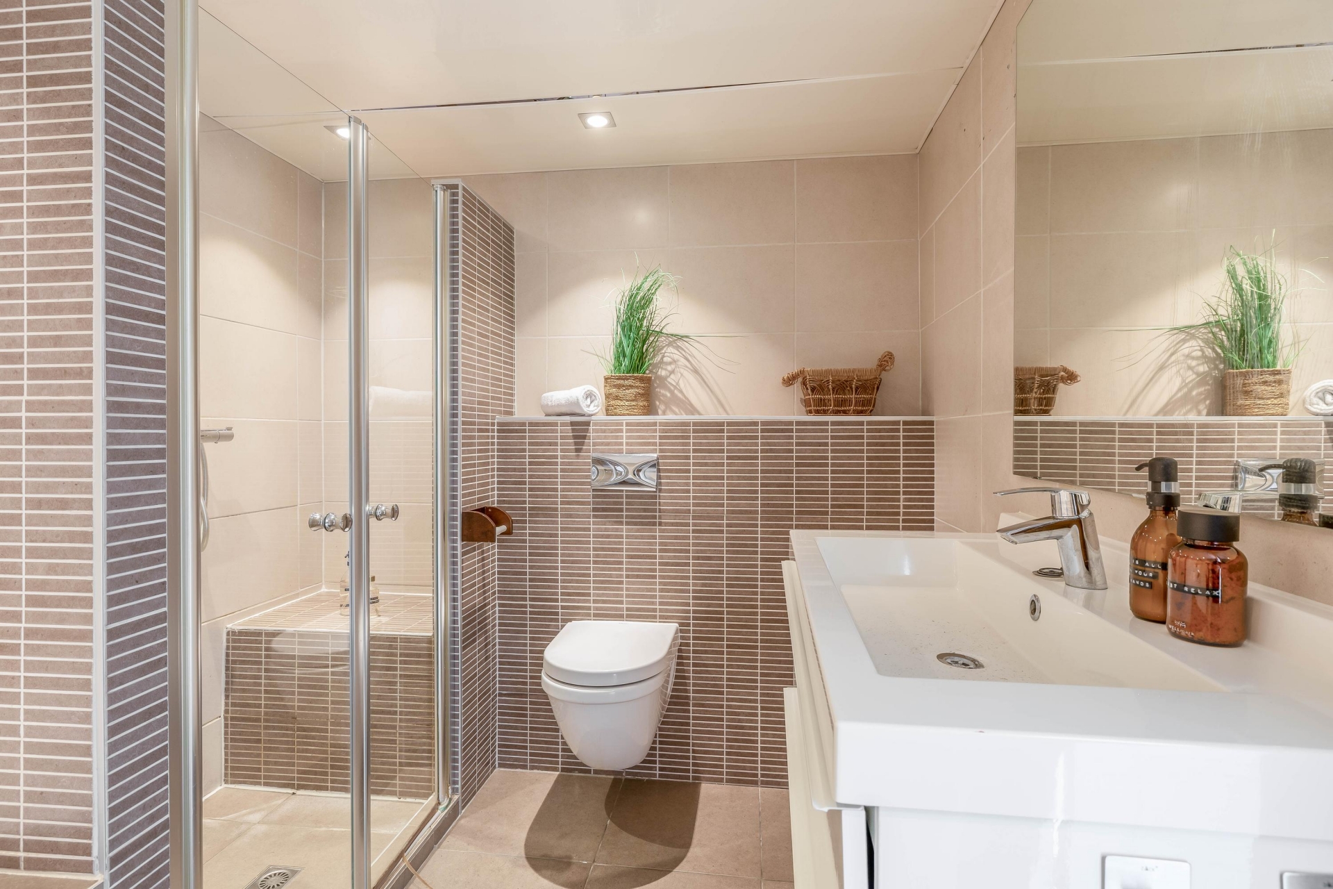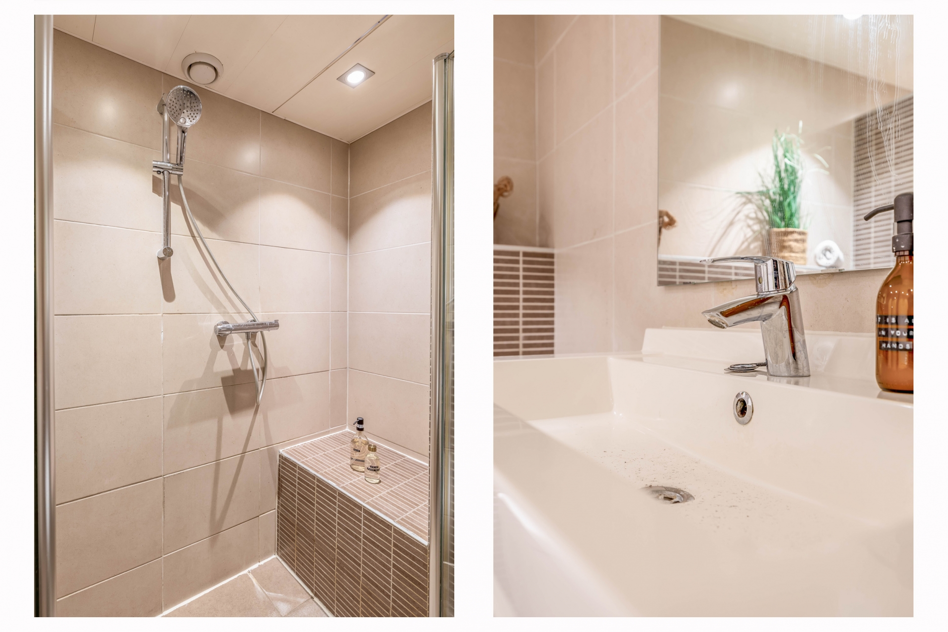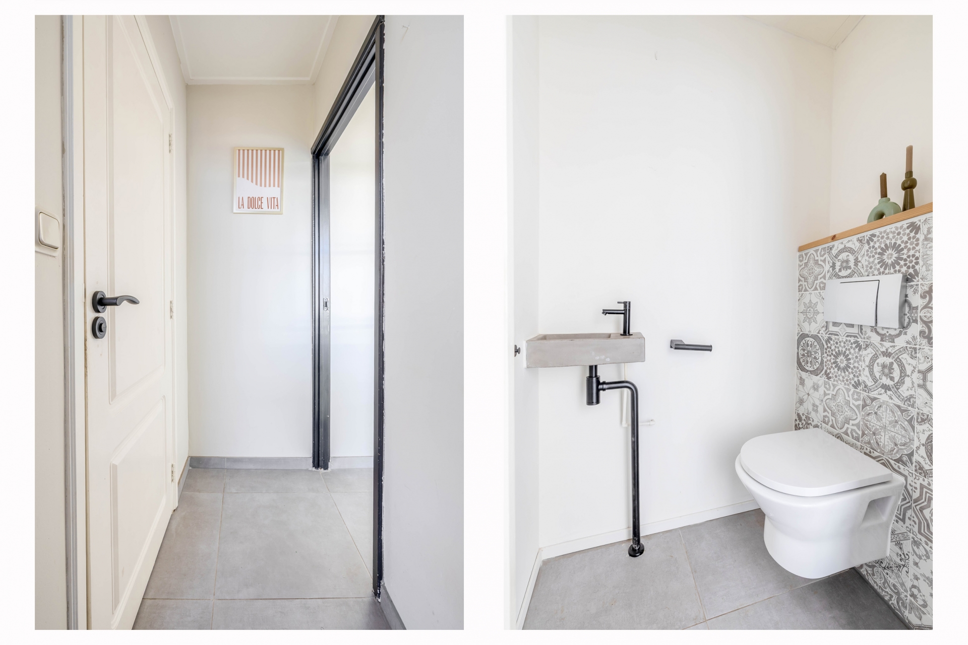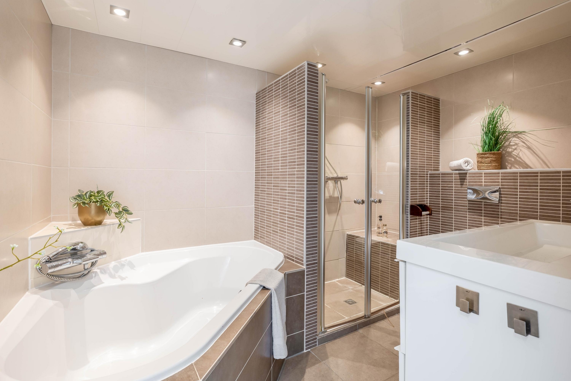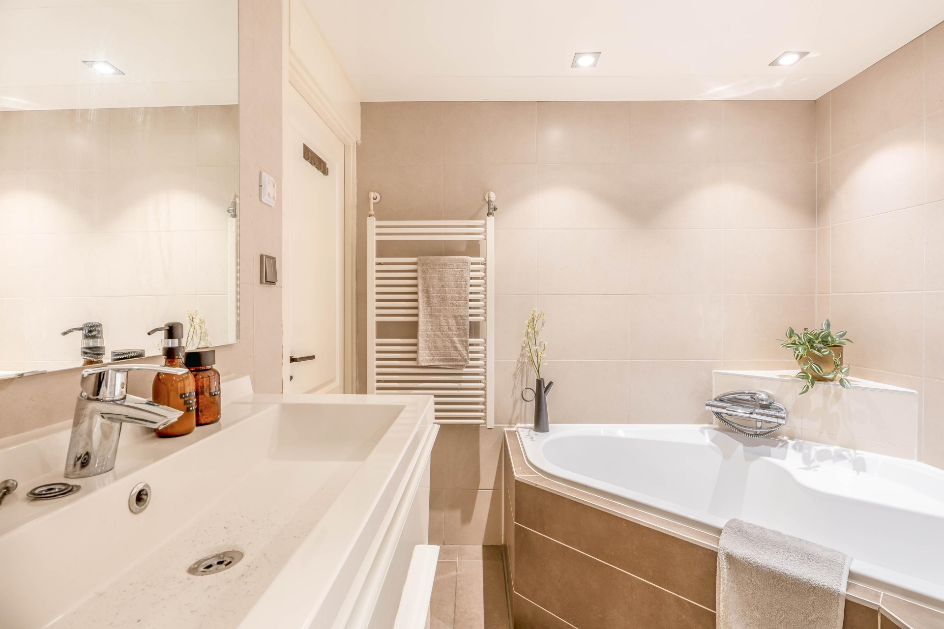 Aan de voorzijde van het huis vind je de keuken, die praktisch is ingericht met een hoekopstelling. Je hebt hier voldoende werk- en opbergruimte en dankzij het raam aan de straatzijde komt er prettig daglicht binnen. De keuken staat in open verbinding met de woonkamer, wat zorgt voor een fijne interactie tijdens het koken. De badkamer is opvallend ruim en netjes afgewerkt. Hier beschik je over zowel een ligbad als een aparte douche, ideaal voor gezinnen of voor wie graag de keuze heeft tussen snel of ontspannen. De neutrale afwerking geeft het geheel een verzorgde uitstraling waar je voorlopig niets aan hoeft te doen.