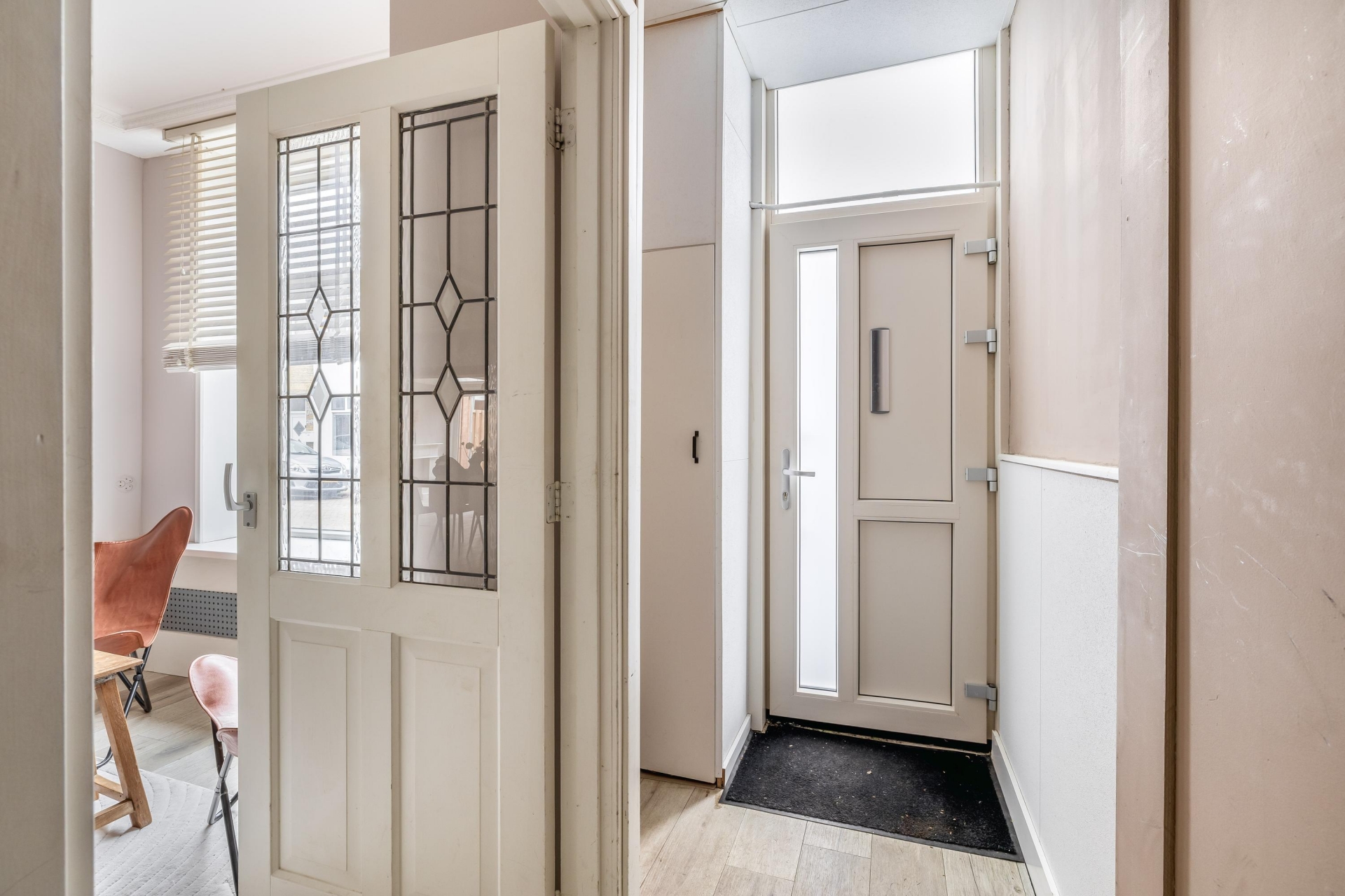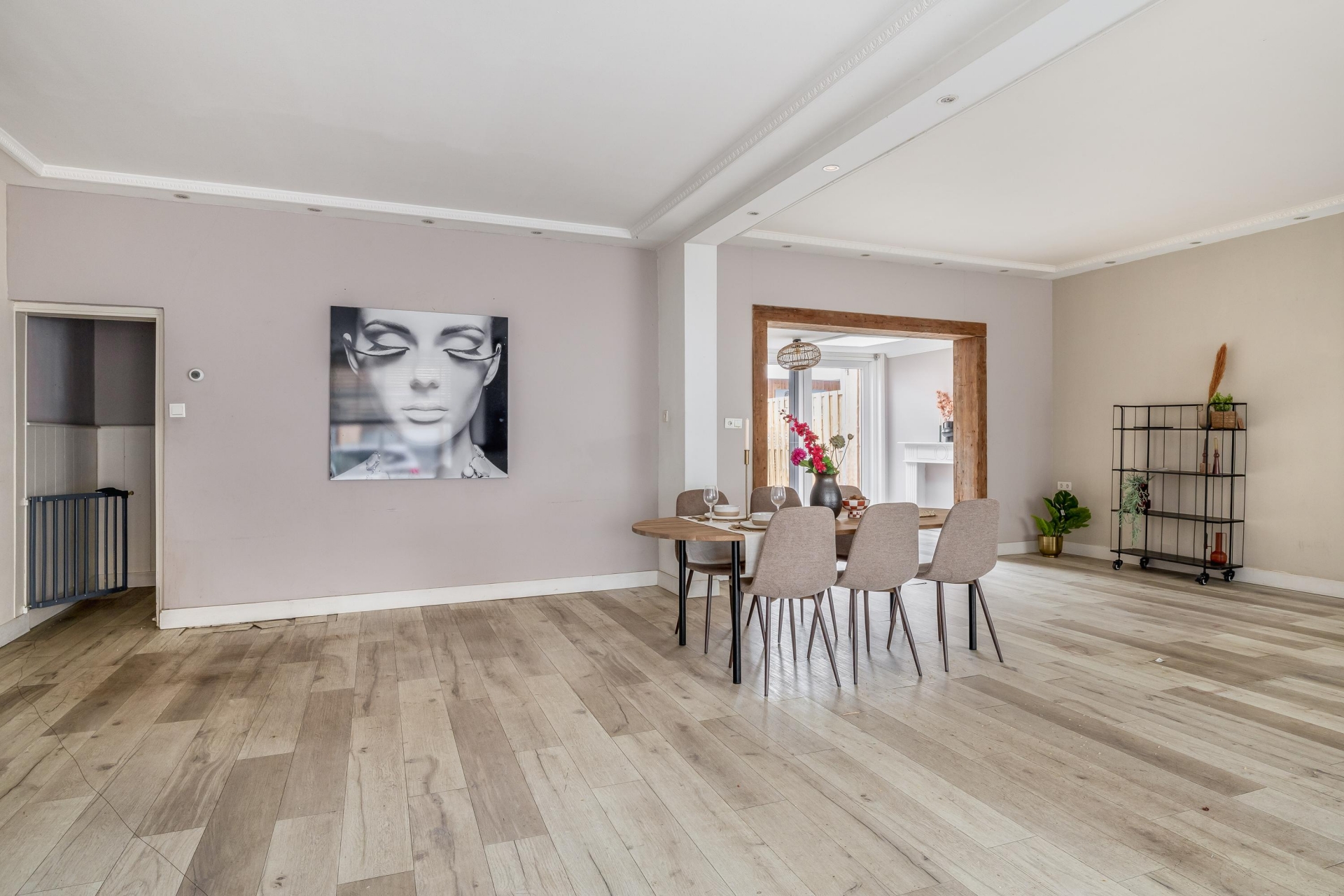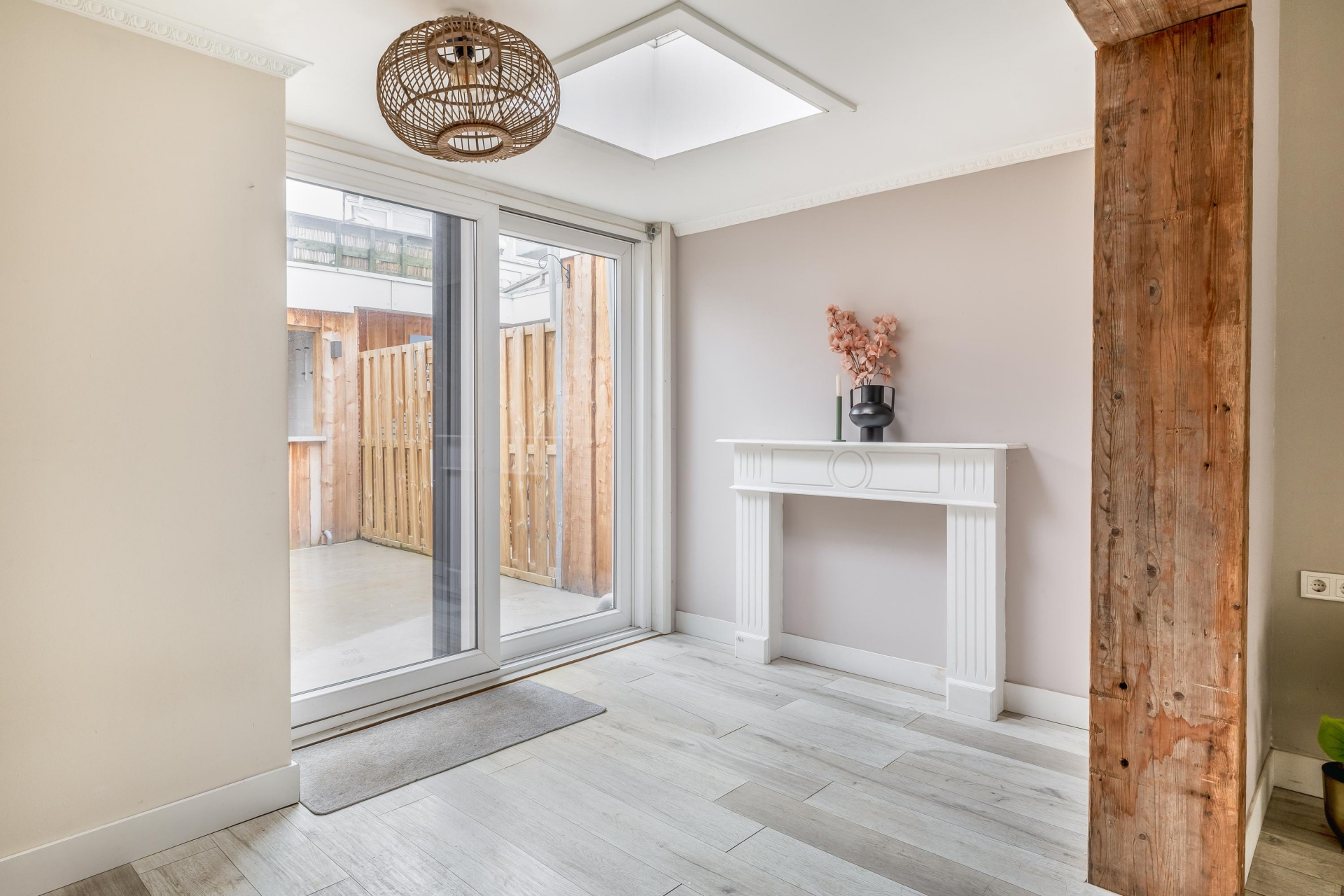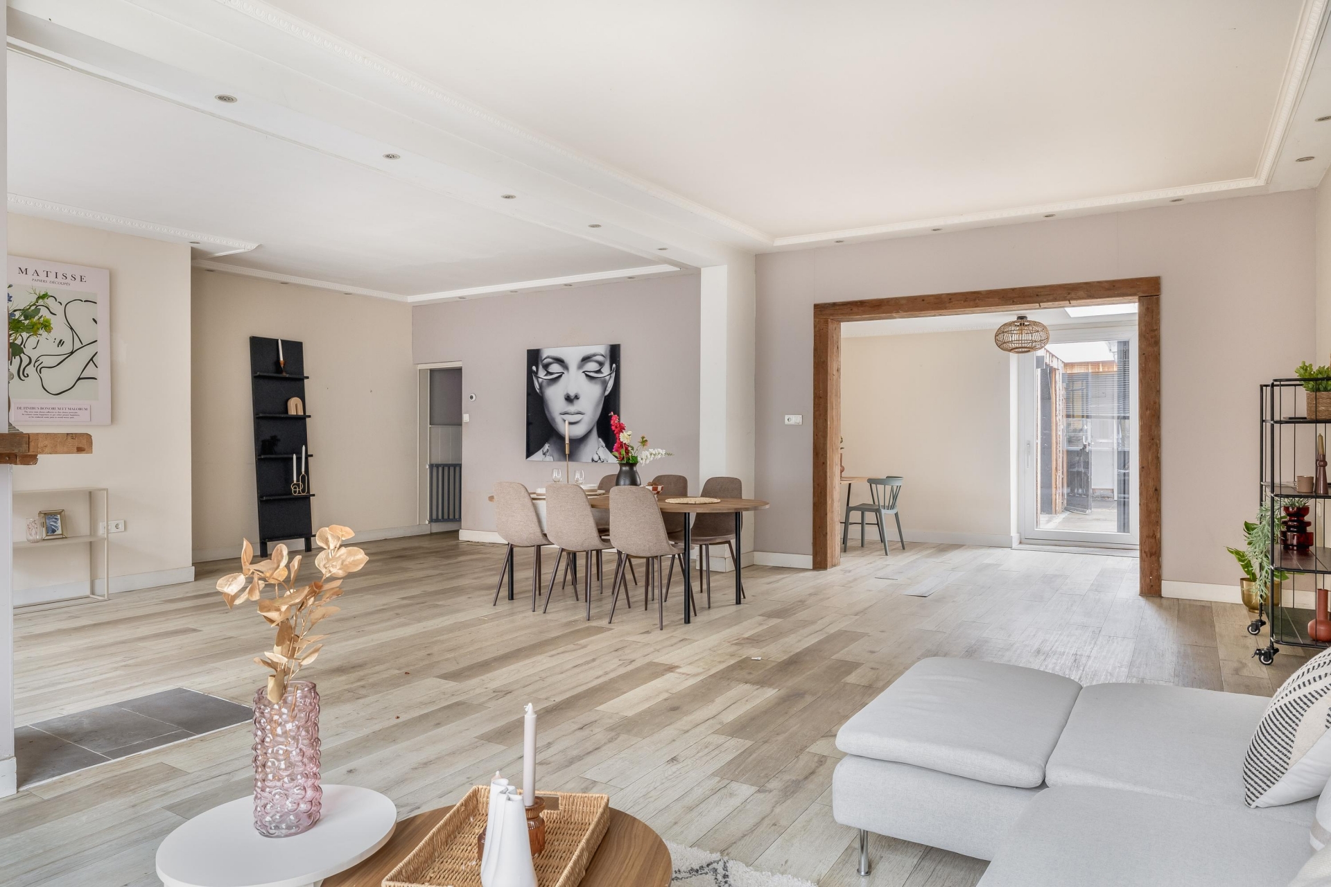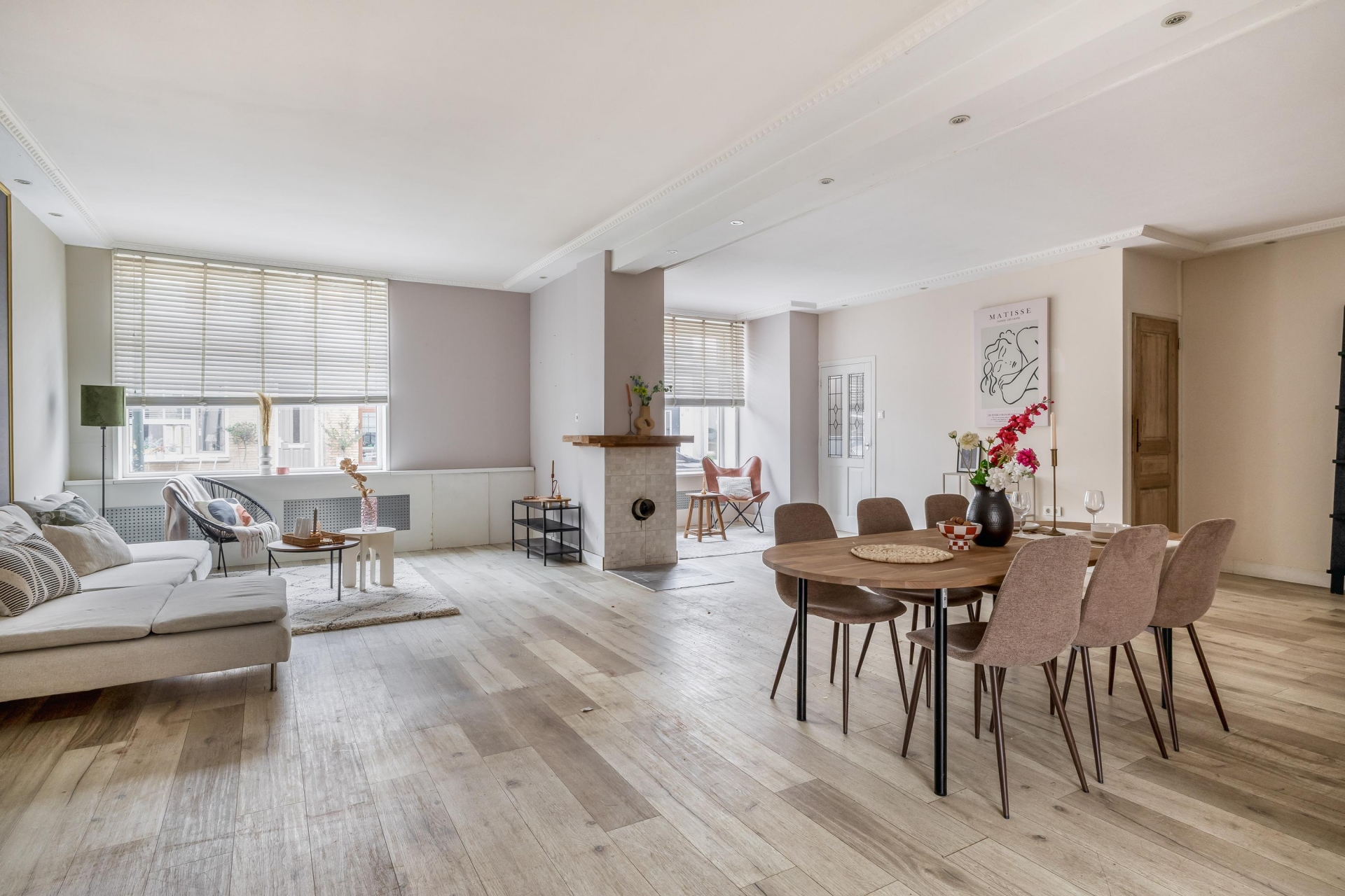 Bij binnenkomst valt direct de ruimte op. Dit huis is in het verleden samengevoegd uit twee woningen en dat merk je: de woonkamer is uitzonderlijk ruim en heeft een prettige indeling met een duidelijk zit- en eetgedeelte.