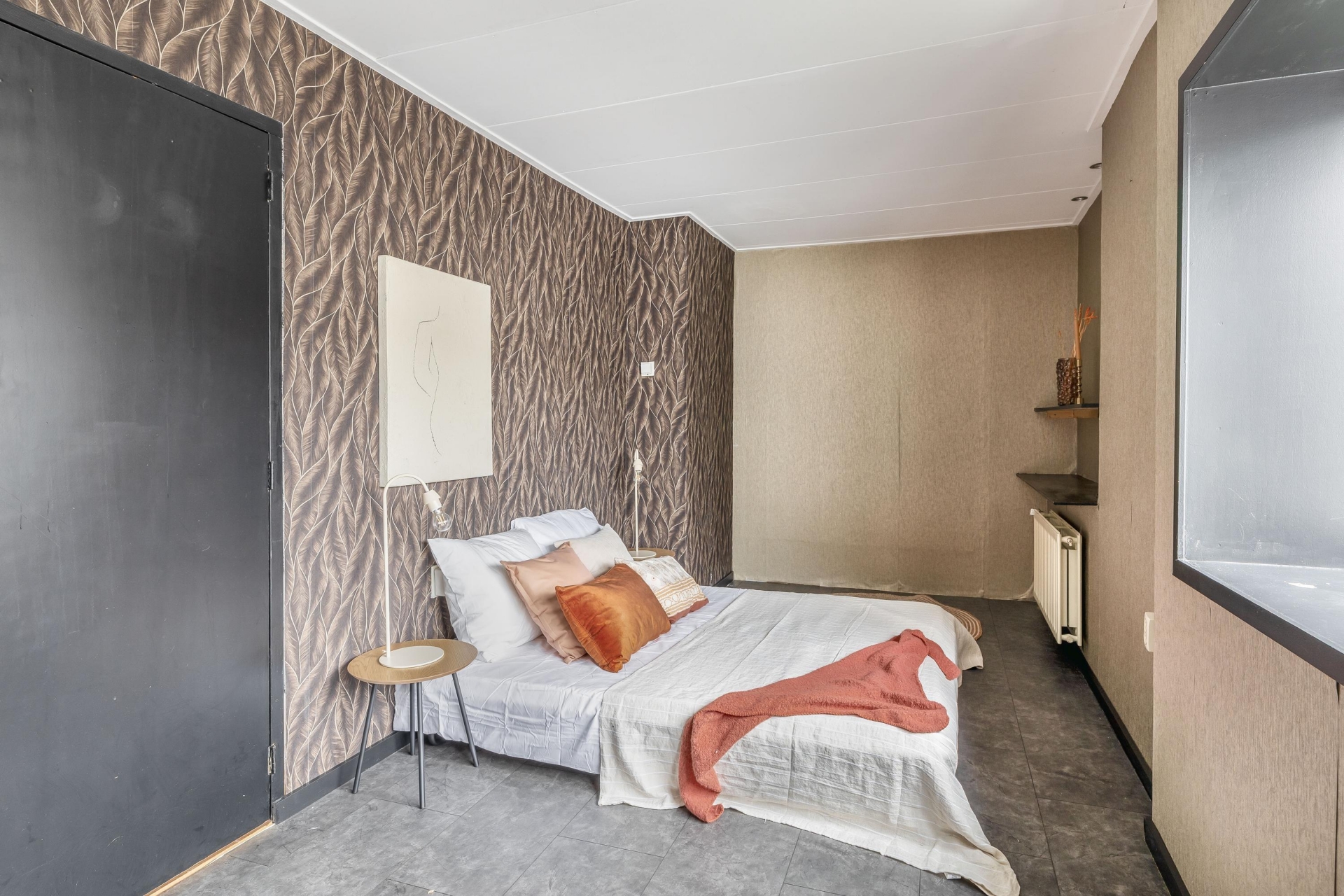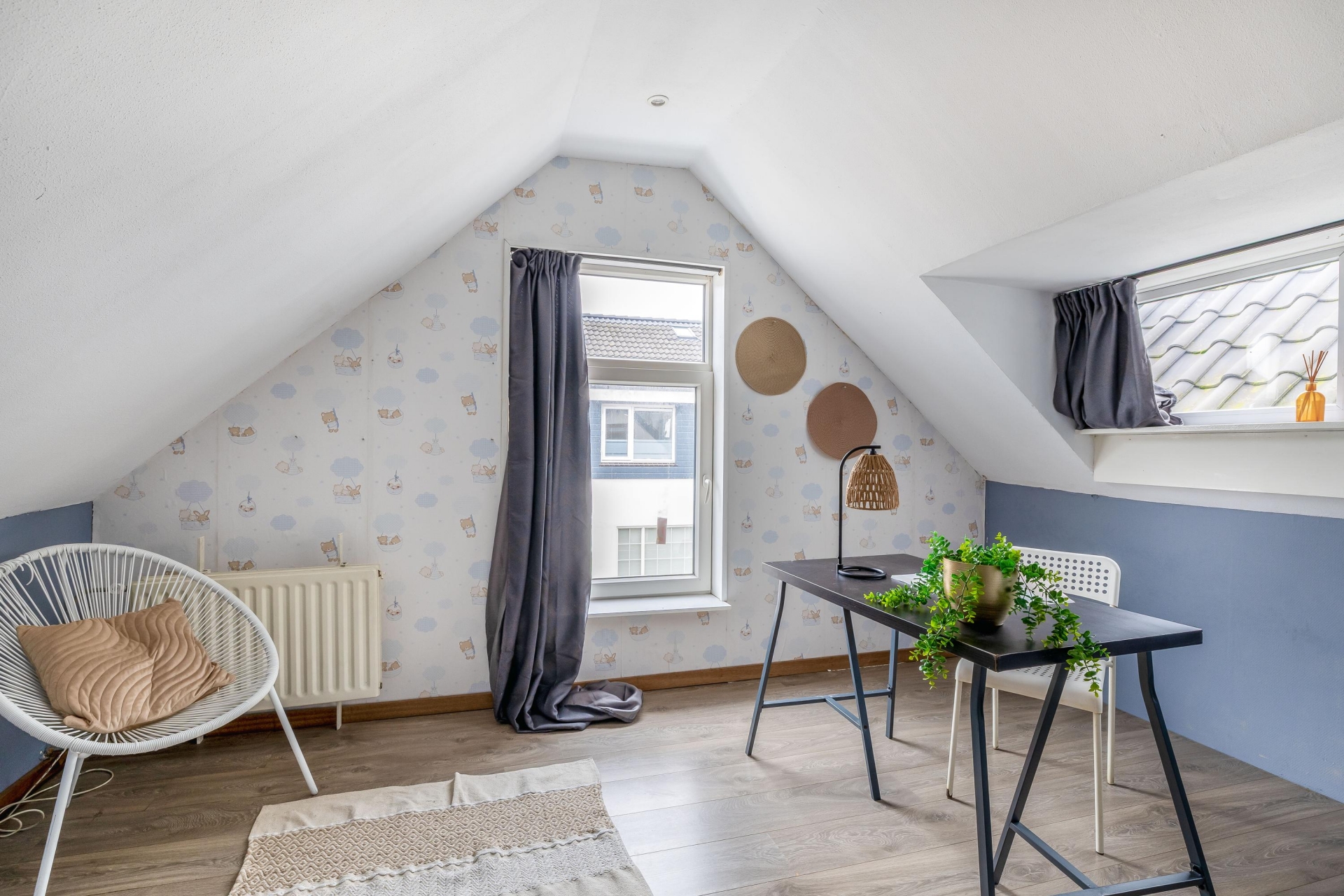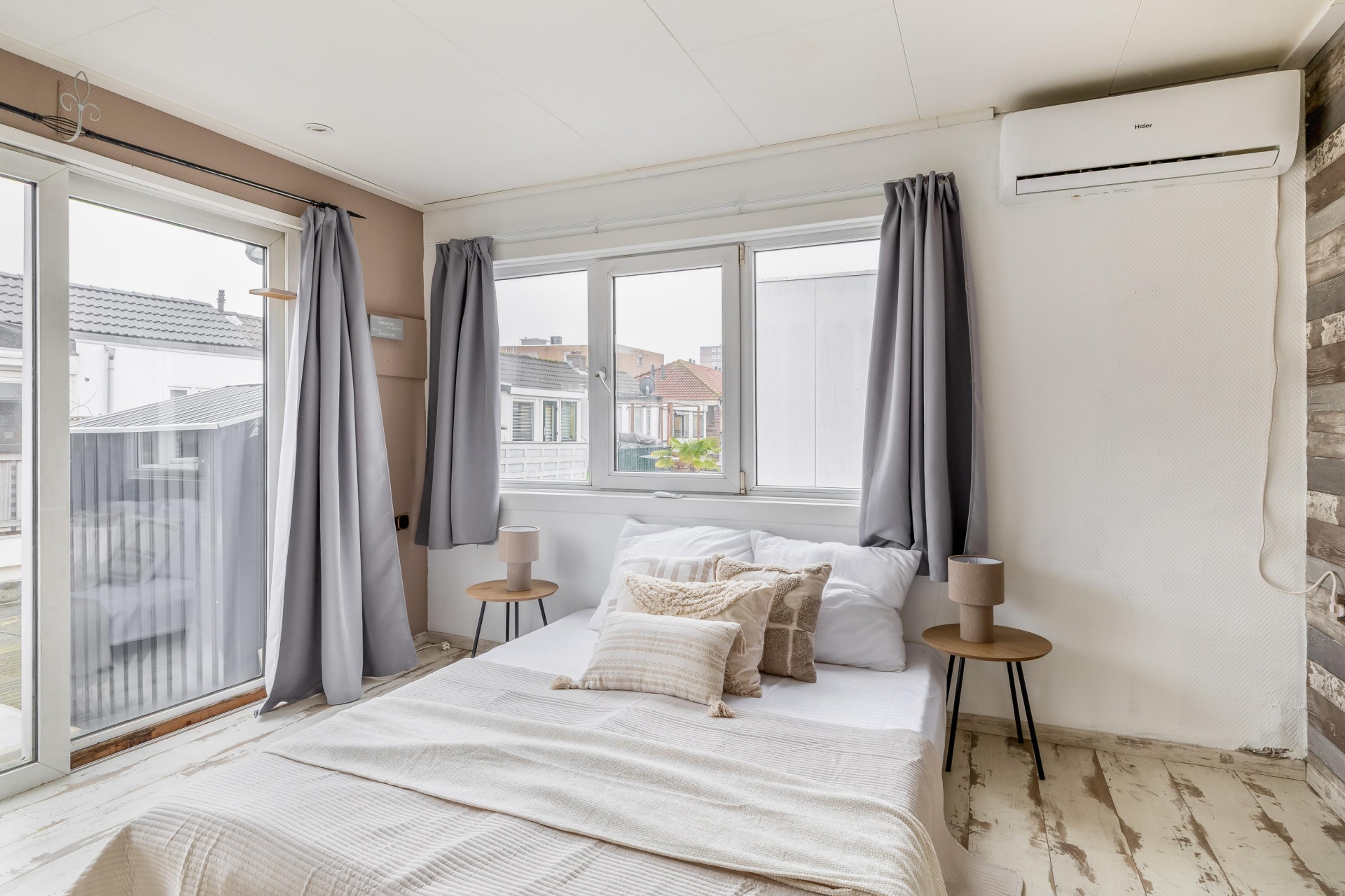 De twee kamers aan de voorzijde hebben een speelse indeling dankzij de puntdaken. Eén van deze kamers is voorzien van airconditioning, de andere beschikt over vaste kastruimte.