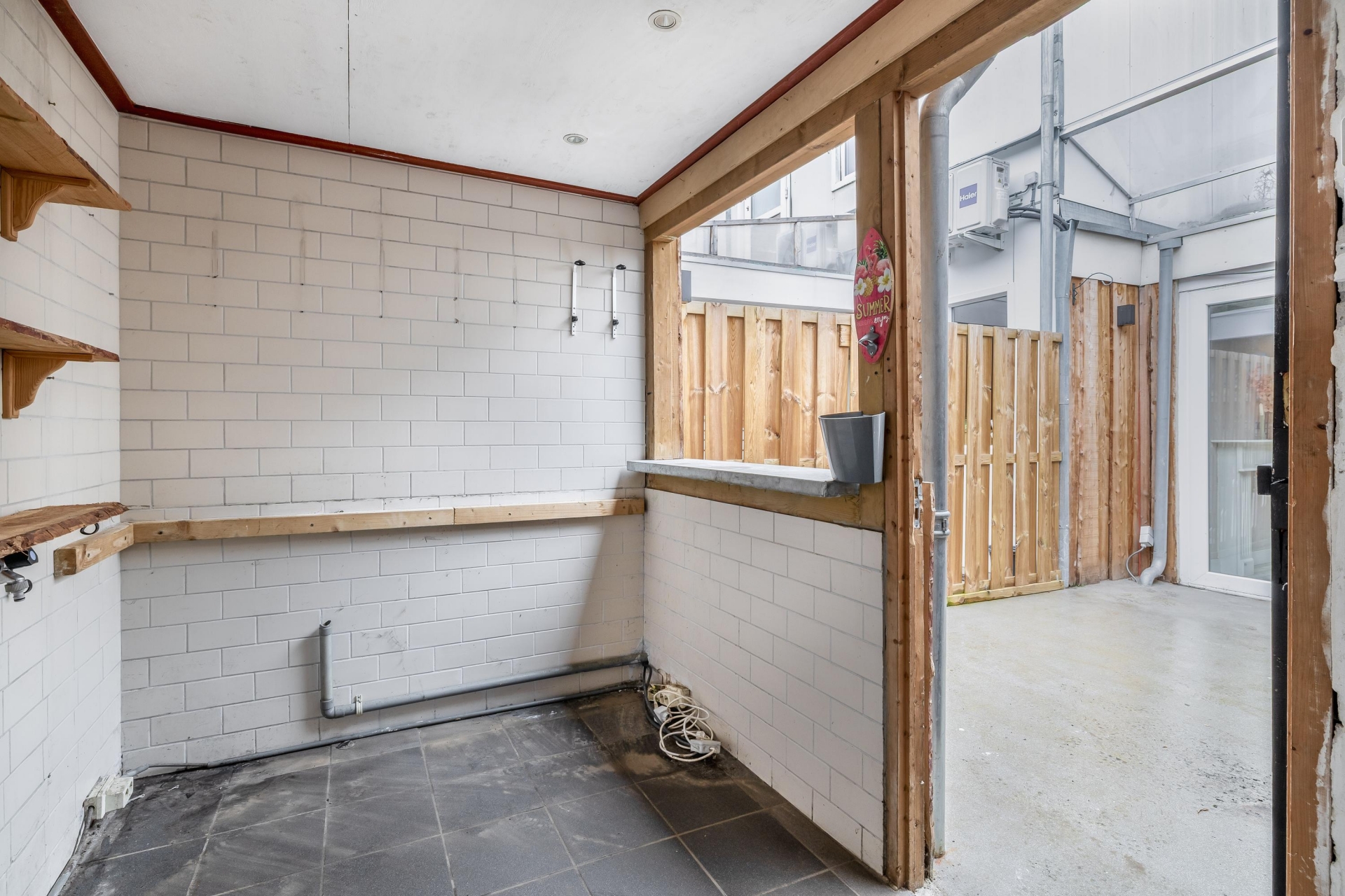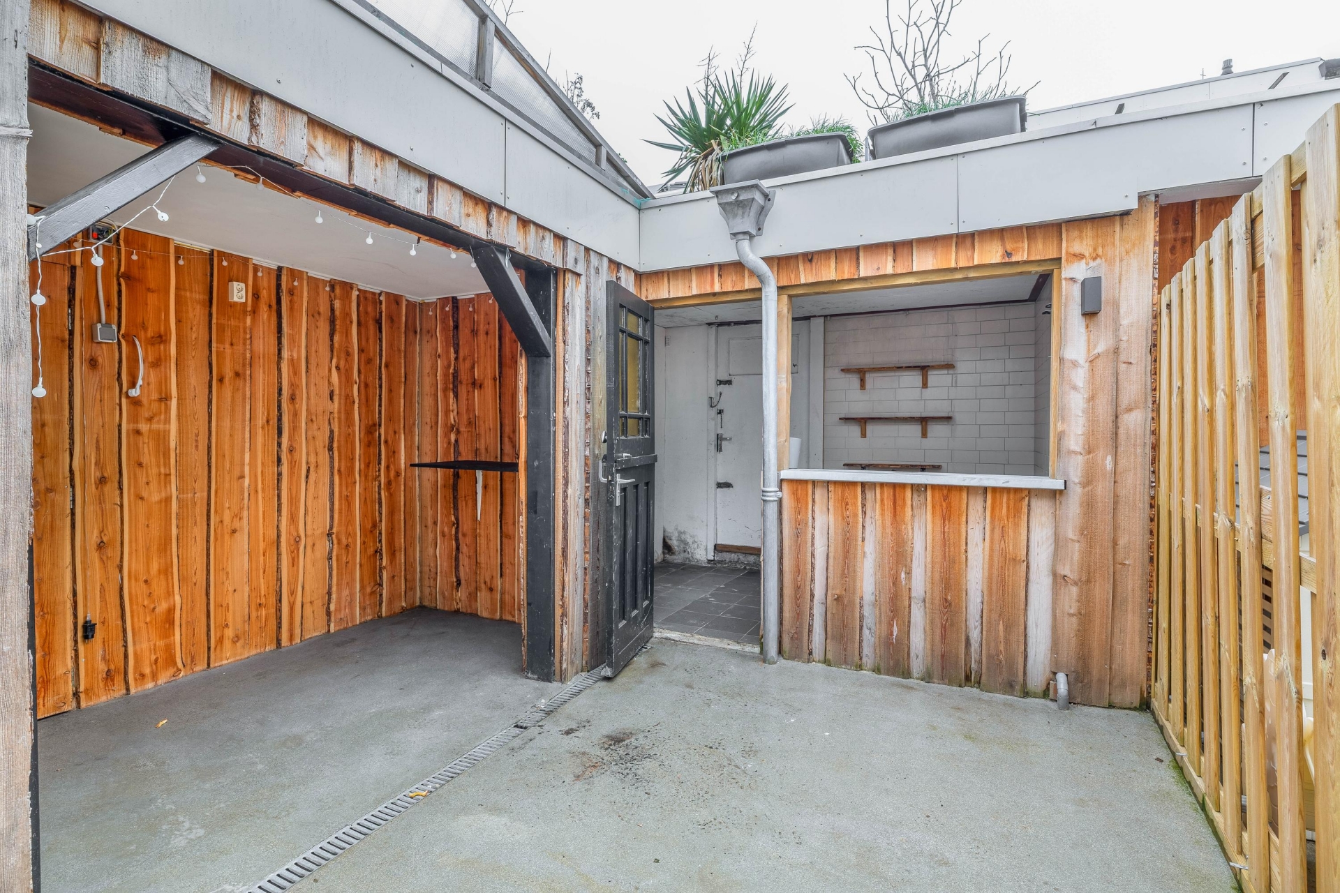 Vanuit de woonkamer stap je de achtertuin/patio in. Deze is voorzien van een overkapping en een gezellige ‘man cave’ met zitruimte, een fijne plek om te ontspannen of met vrienden te borrelen. De brede achterom maakt de tuin ook praktisch bereikbaar.