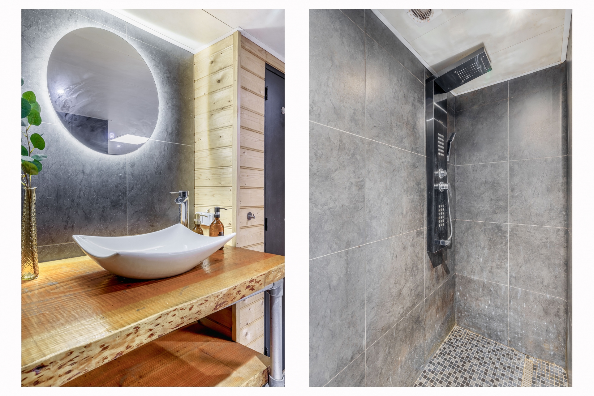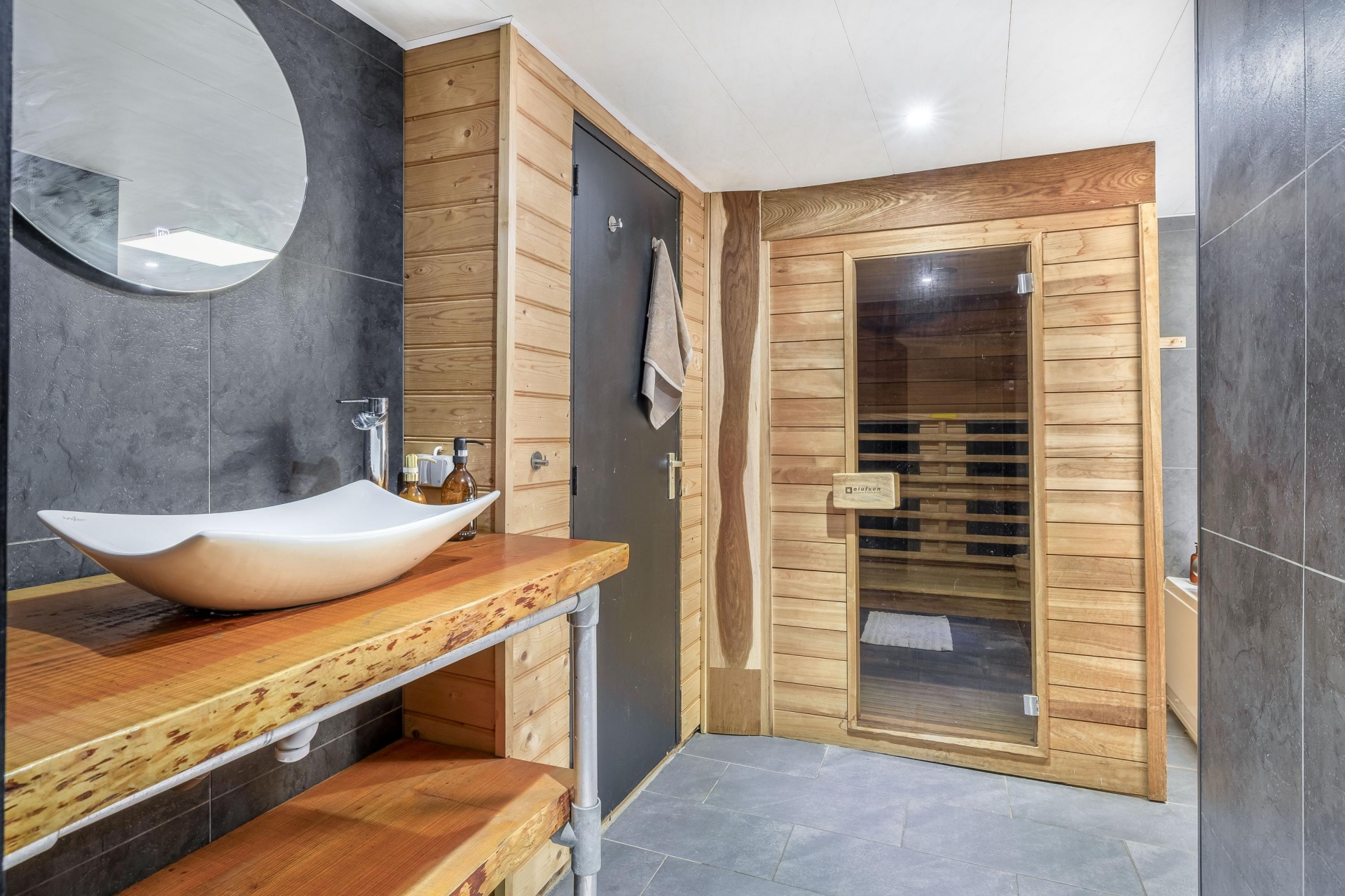 Aansluitend bevindt zich de badkamer, en dat is er één die je niet snel tegenkomt. Een ruime inloopdouche met regendouche, een wastafel met verlichte spiegel, een whirlpool én een Finse sauna maken dit een plek waar je echt tot rust komt. De cv-opstelling is netjes weggewerkt in een kast. Daarnaast is er een separaat toilet en een aparte wasruimte met plaats voor wasmachine en droger.