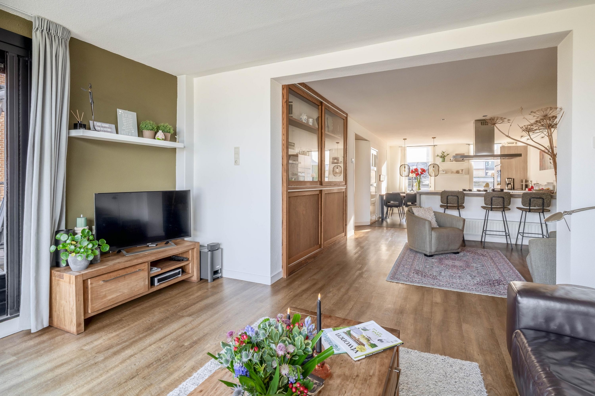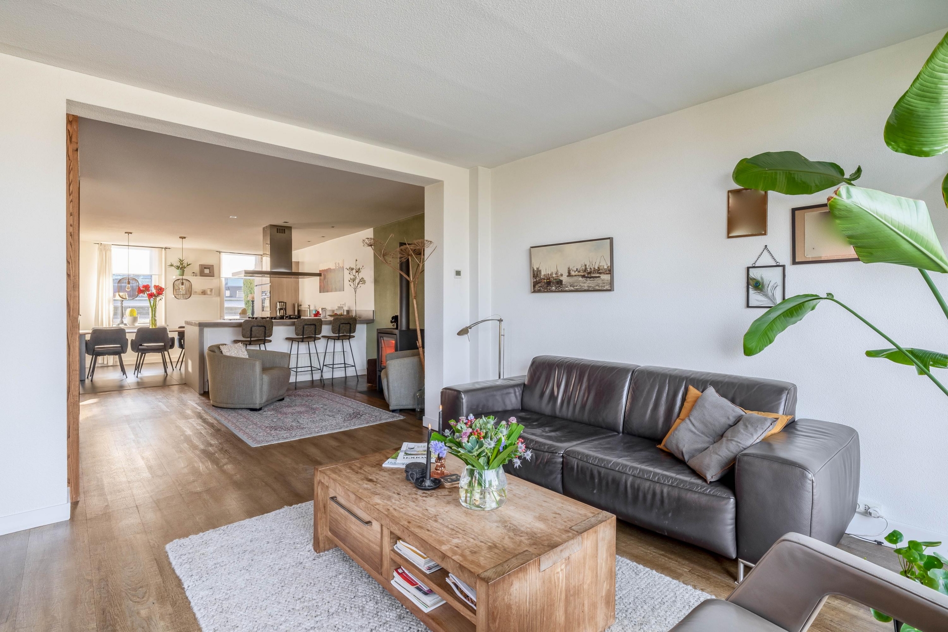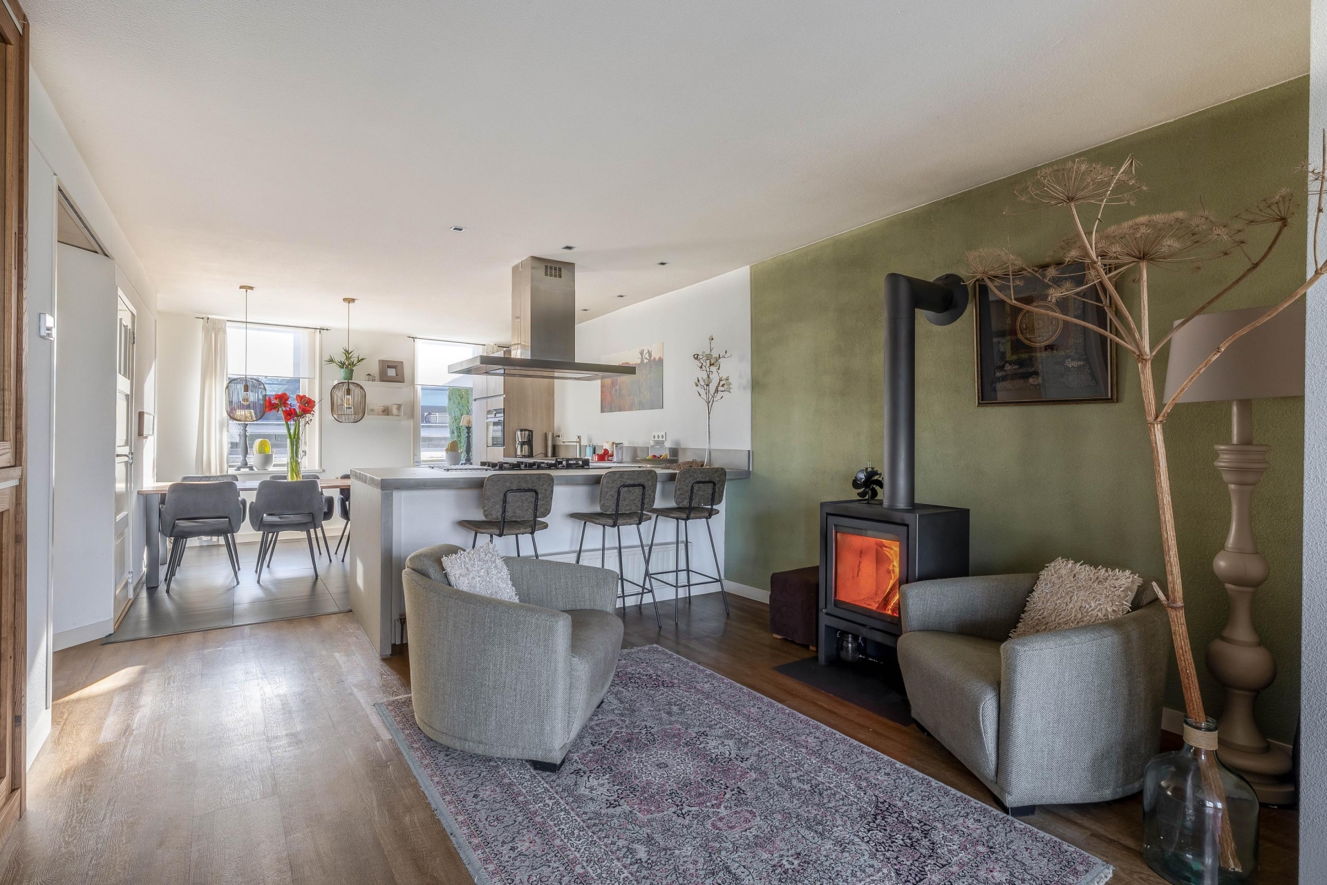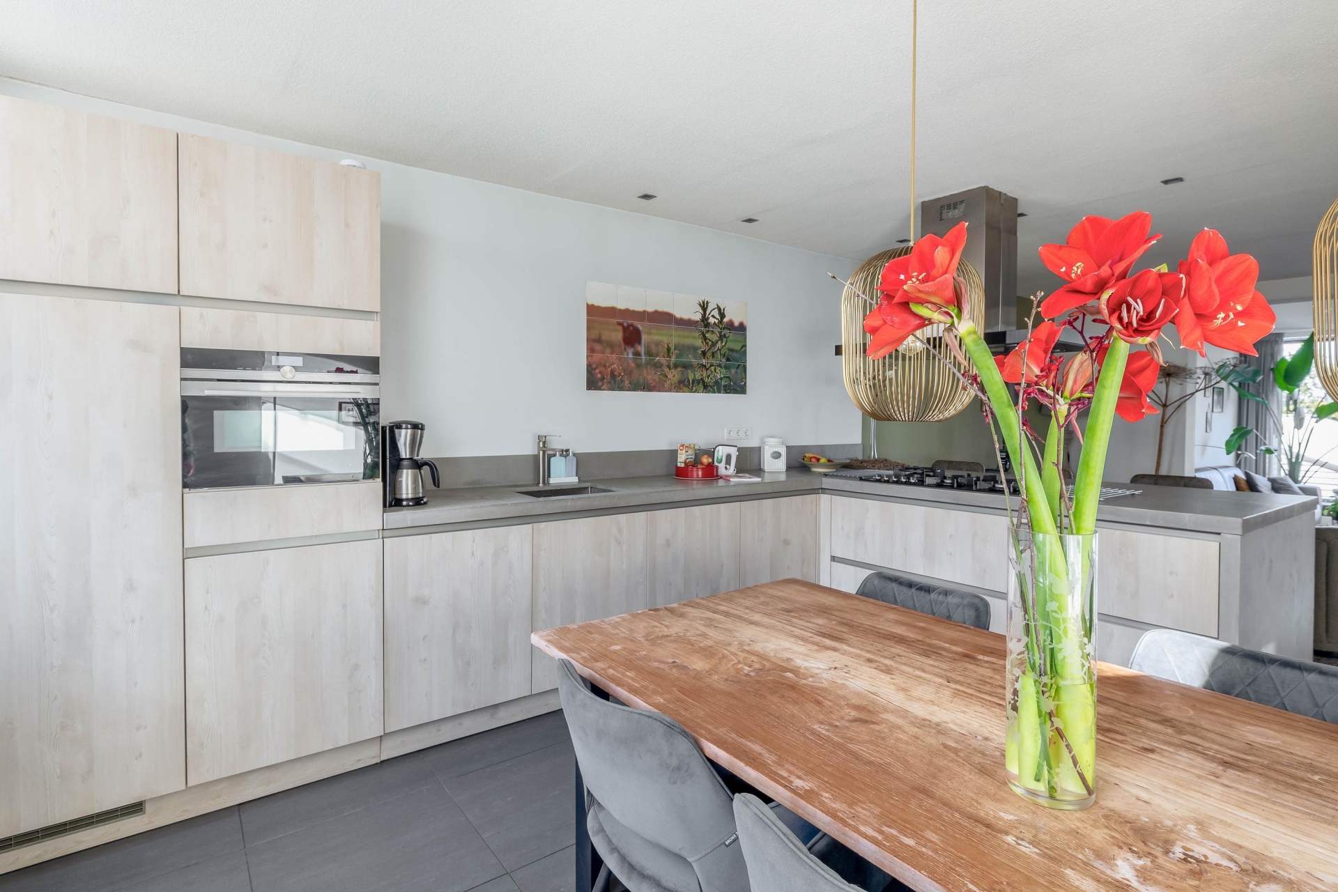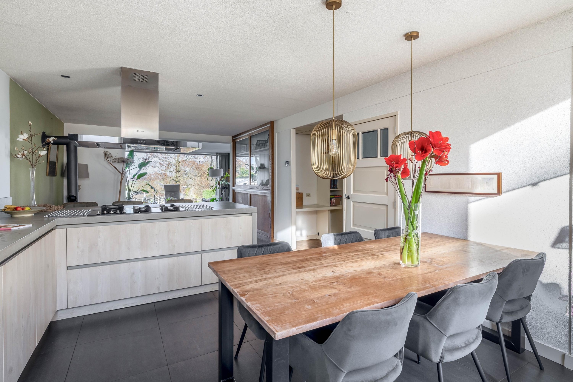 De moderne woonkeuken is een fijne plek waar koken en samenzijn centraal staan. Hier is volop ruimte voor een grote eettafel waar familie en vrienden gemakkelijk aanschuiven. De keuken vormt daarmee echt het hart van het huis.