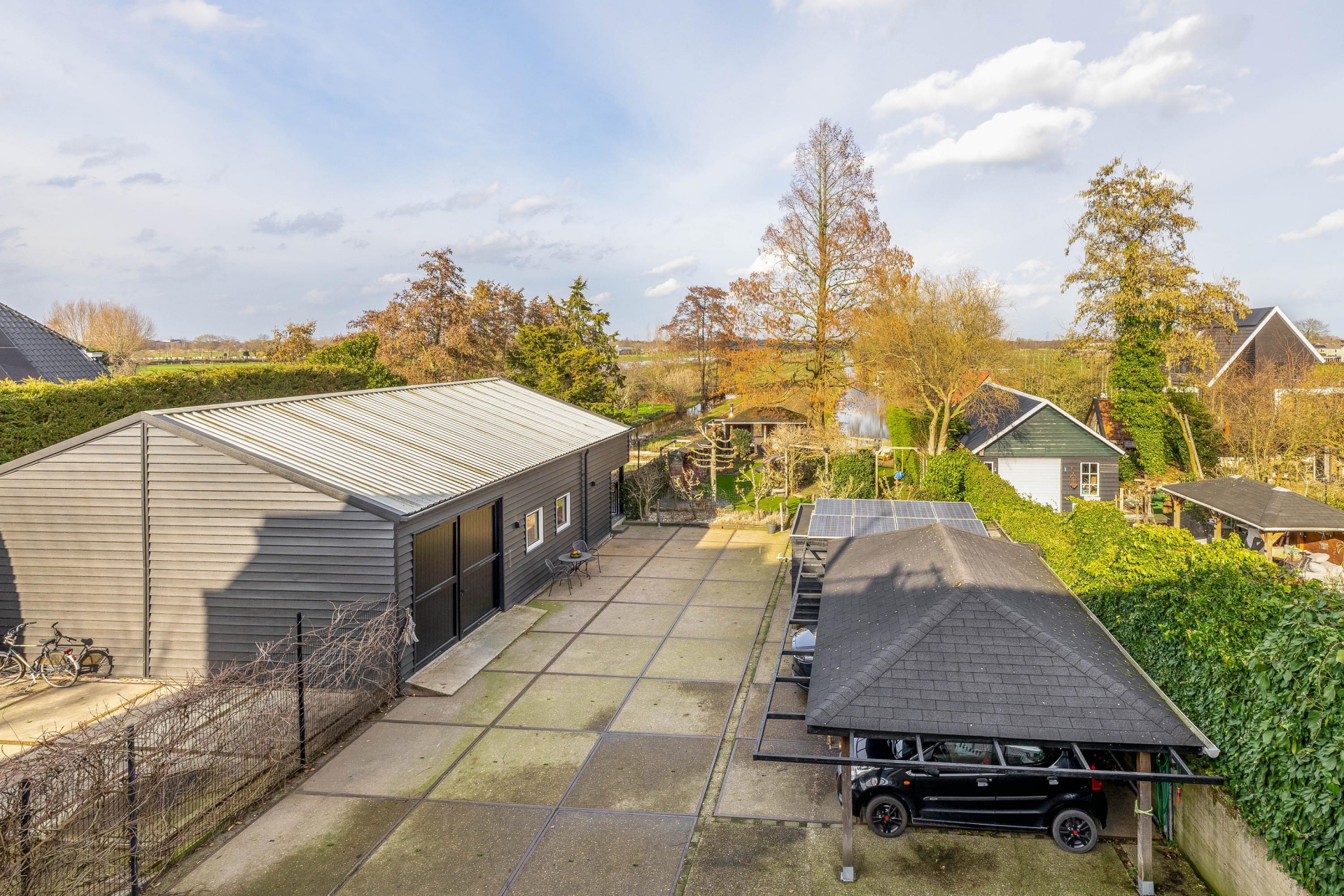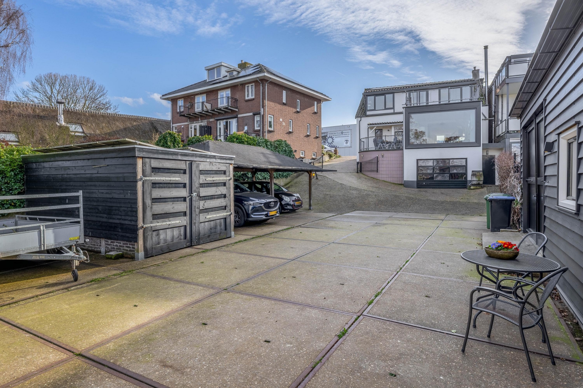 Daarnaast is er op het perceel ook nog een carport aanwezig met ruimte voor twee auto's en een aanpandige garage (met omvormer voor de zonnepanelen op de garage en voorbereiding voor elektrisch laden). De eigen afrit en het ruime erf zorgen ervoor dat parkeren op eigen terrein geen enkel probleem is.