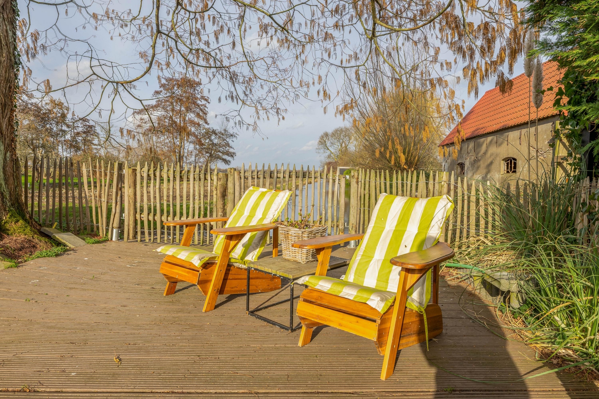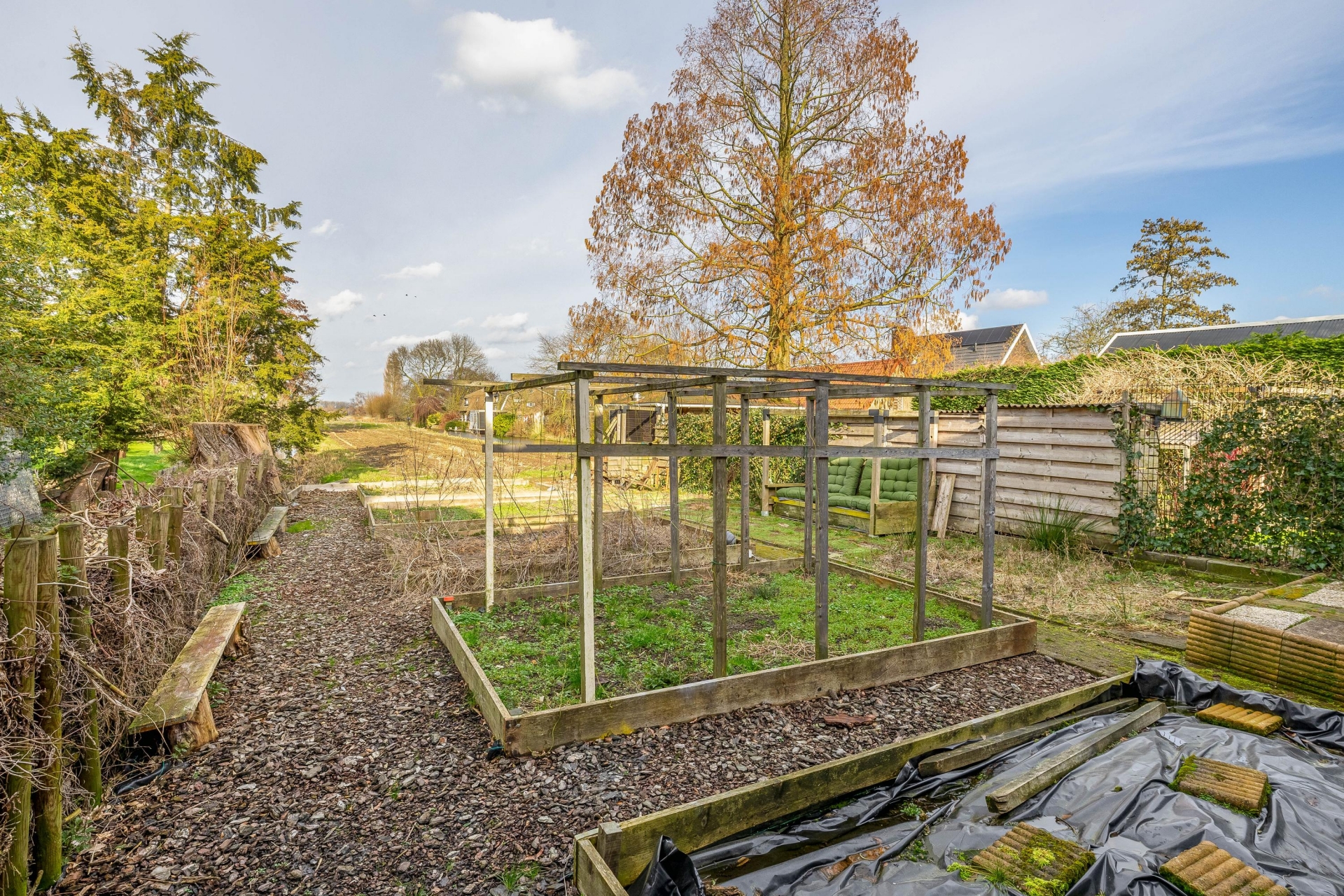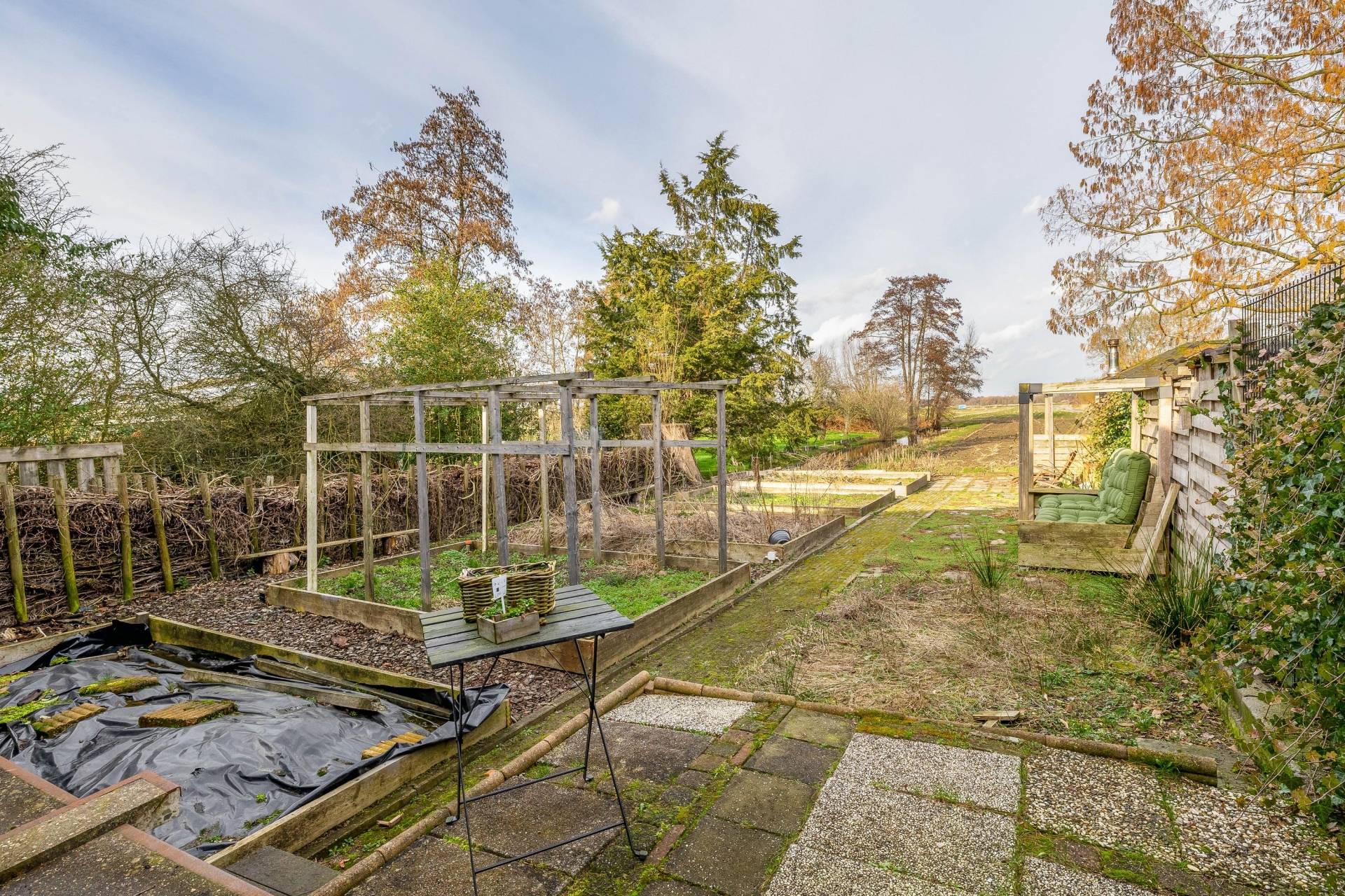 Achter in de tuin staat een sfeervol prieel met houtkachel. Dit is een heerlijke plek waar je tot in de late uurtjes kunt genieten van lange zomeravonden met vrienden en familie. Vanaf hier kijk je uit over de polder en ervaar je de rust en vrijheid van het buitenleven.