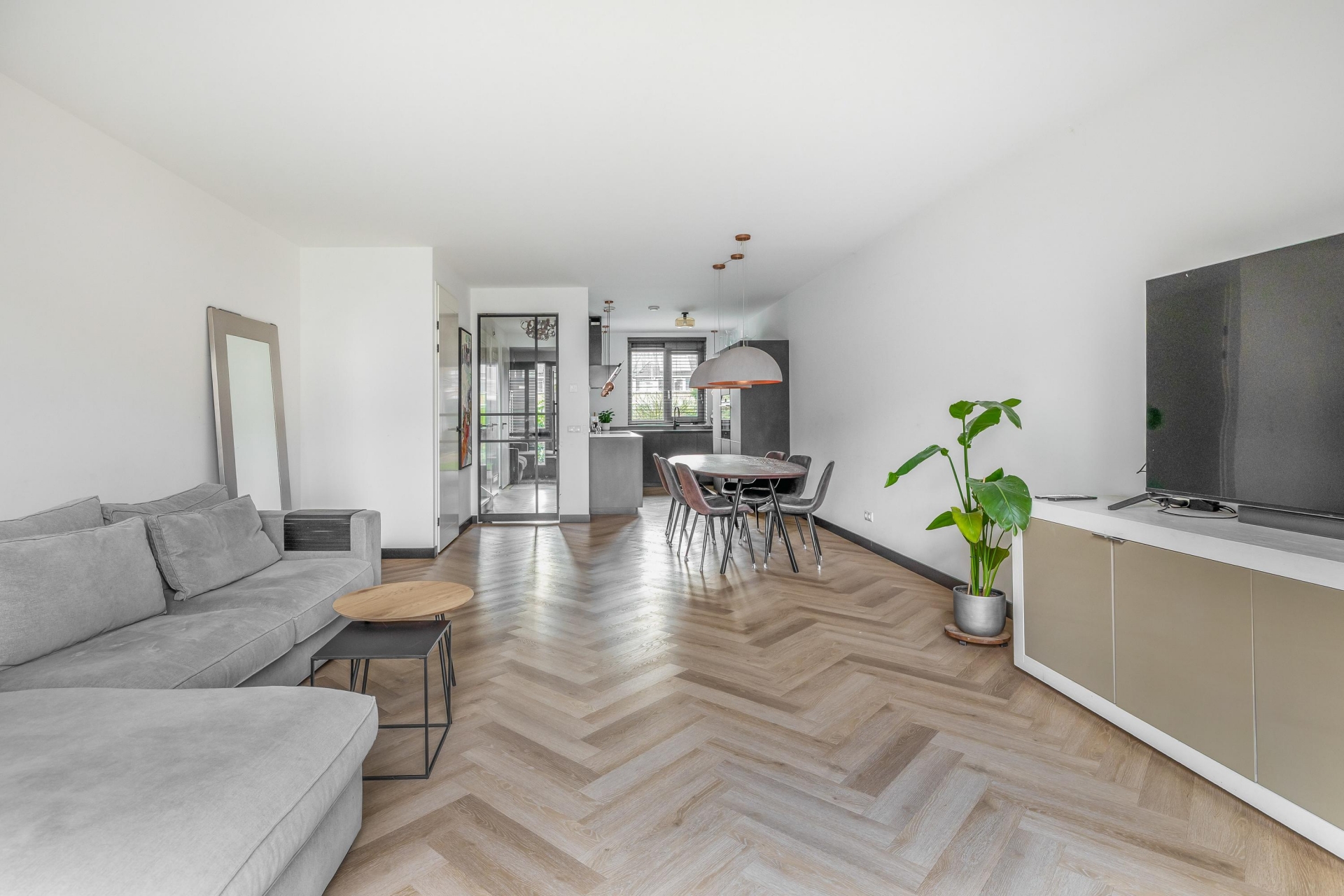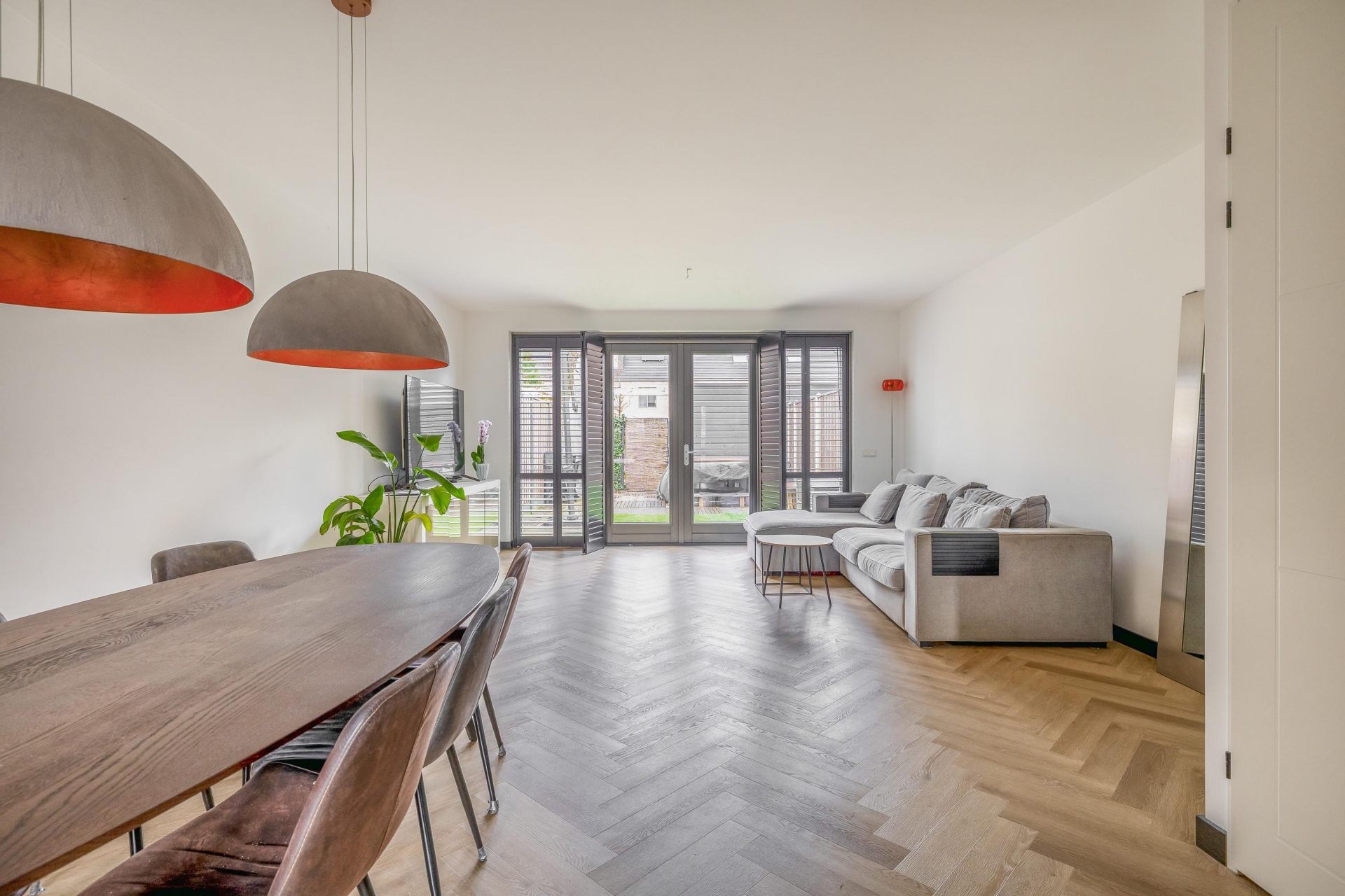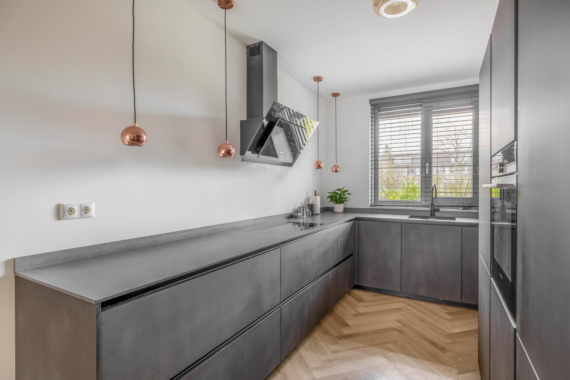 De woning is vanaf de bouw al voorzien van extra comfort. Op de begane grond is gekozen voor een uitbouw, waardoor de woonkamer royaal aanvoelt en mooi in verbinding staat met de tuin. De visgraat PVC-vloer met vloerverwarming, de grote raampartijen met luxe shutters en de openslaande deuren maken de ruimte licht en sfeervol. De open keuken aan de voorzijde is uitgerust met moderne apparatuur zoals inductie kookplaat met afzuigkap en een Quooker, een strak werkblad en veel opbergruimte – helemaal in lijn met de smaak van nu.