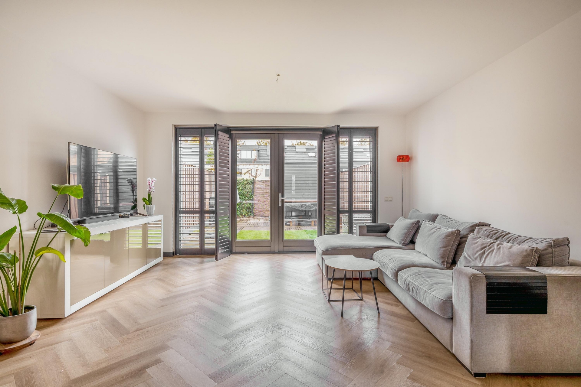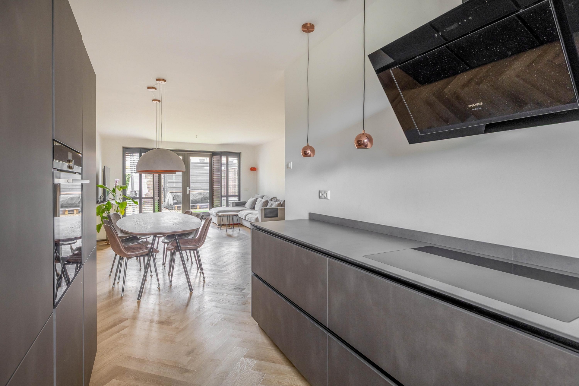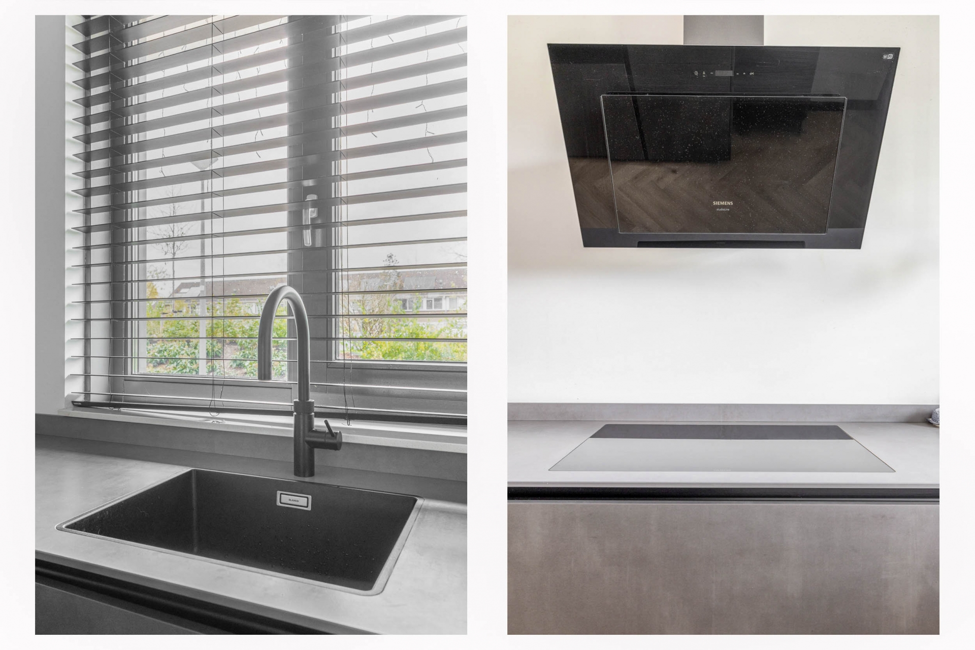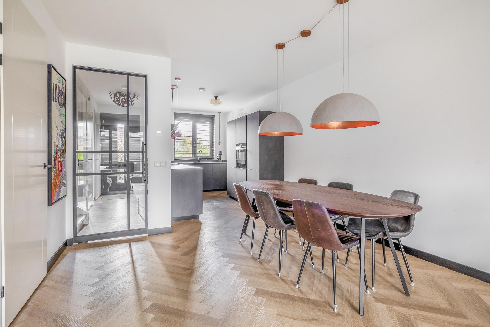 De woning is vanaf de bouw al voorzien van extra comfort. Op de begane grond is gekozen voor een uitbouw, waardoor de woonkamer royaal aanvoelt en mooi in verbinding staat met de tuin. De visgraat PVC-vloer met vloerverwarming, de grote raampartijen met luxe shutters en de openslaande deuren maken de ruimte licht en sfeervol. De open keuken aan de voorzijde is uitgerust met moderne apparatuur zoals inductie kookplaat met afzuigkap en een Quooker, een strak werkblad en veel opbergruimte – helemaal in lijn met de smaak van nu.