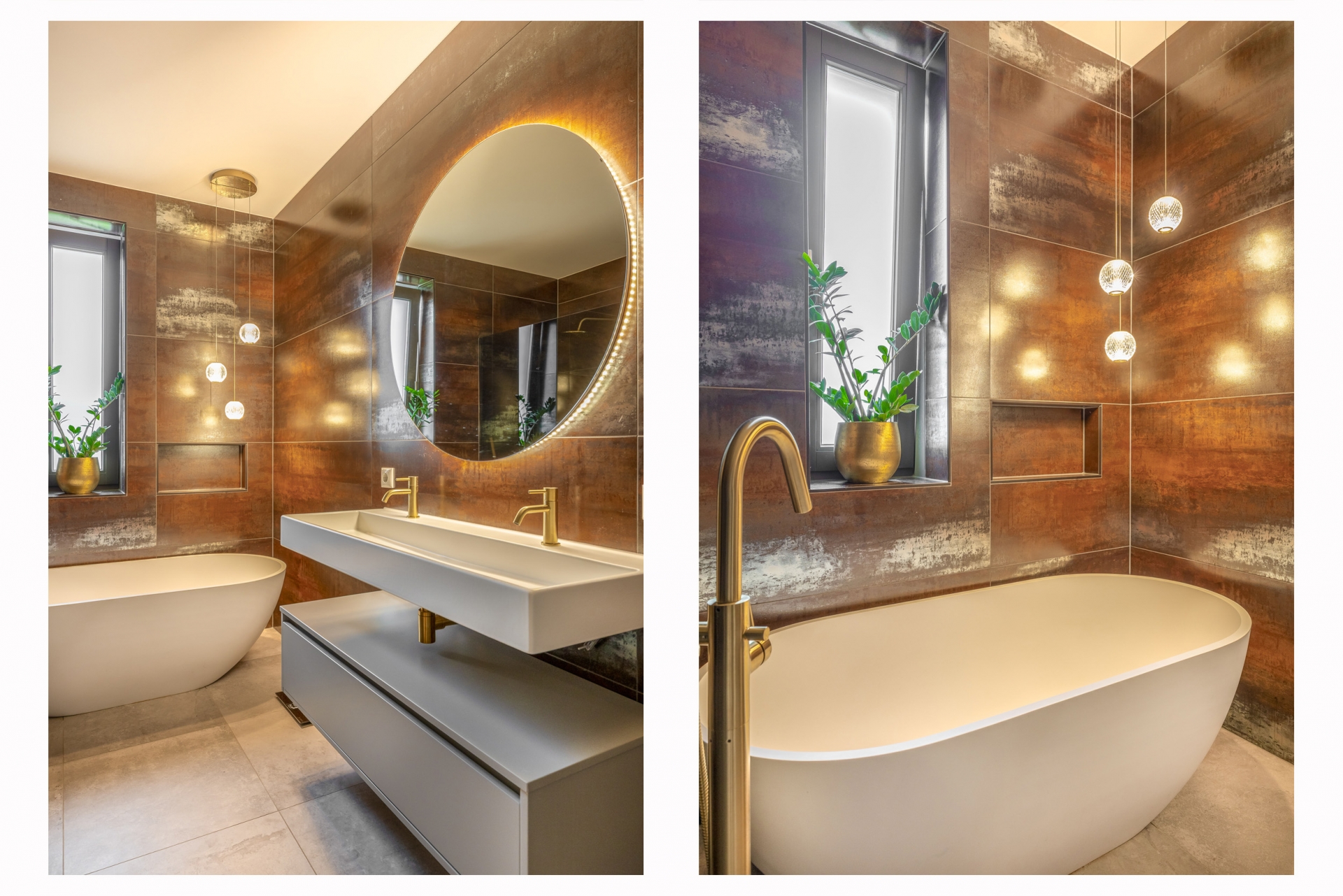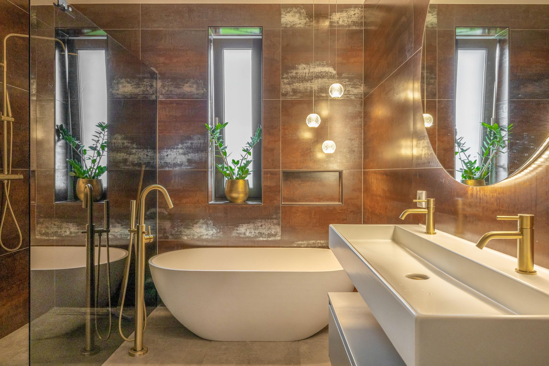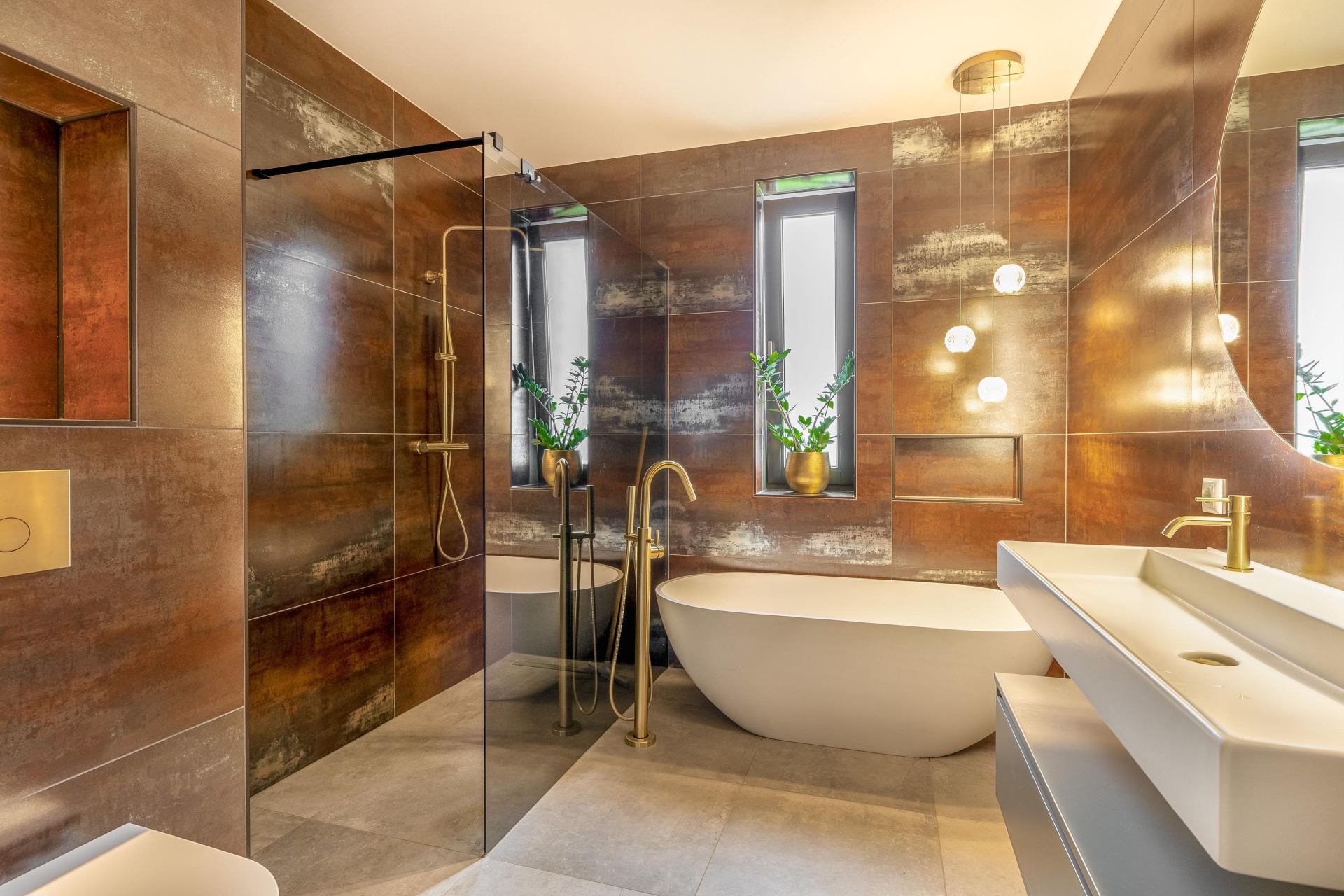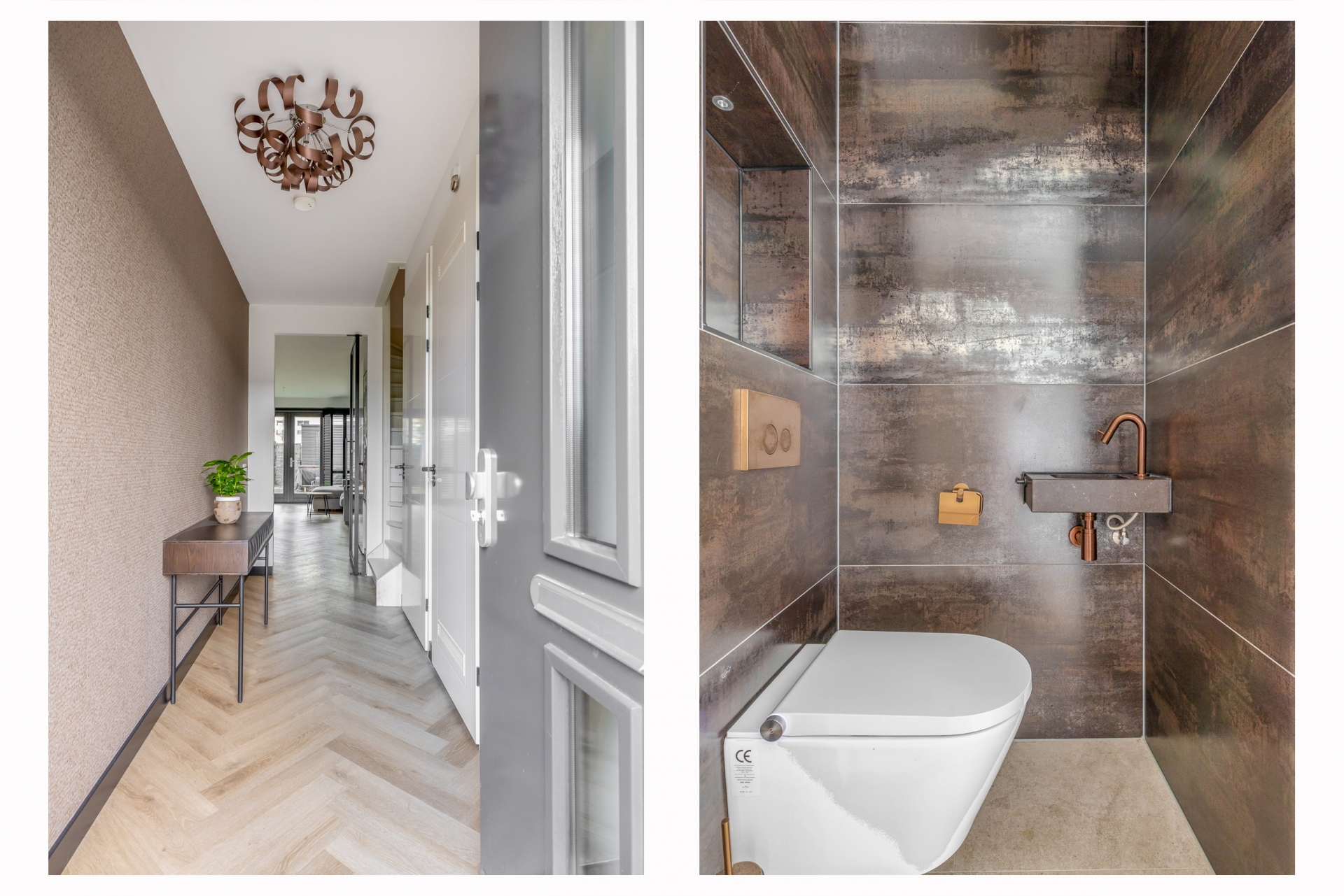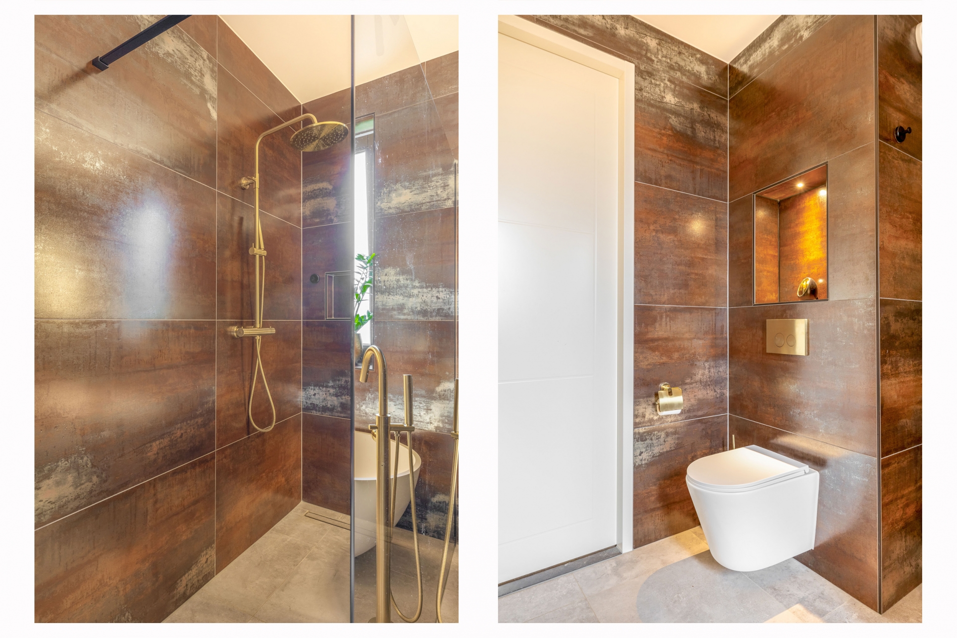 Ook de badkamer is een blikvanger: inloopdouche, vrijstaand ligbad, luxe wastafelmeubel, toilet en stijlvolle tegels in warme tinten. Alles uitgevoerd met oog voor detail en gebruiksgemak. Het separate toilet op de begane grond sluit hier naadloos op aan, met dezelfde moderne afwerking.