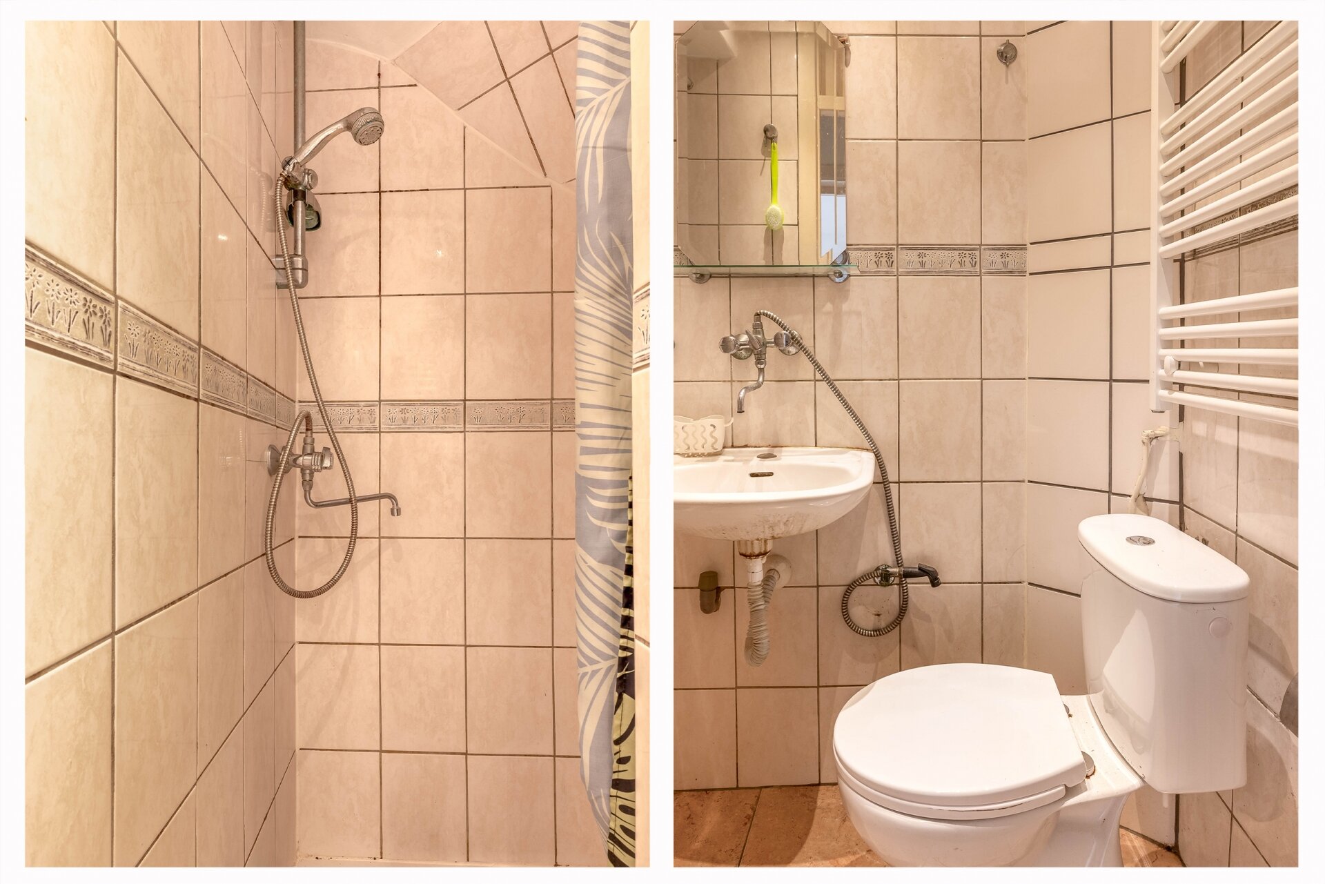 De slaapkamer ligt aan de achterzijde van de woning en beschikt over twee vaste opbergkasten en een schouw. De badkamer is geheel betegeld en voorzien van een toilet, douche en wastafel.