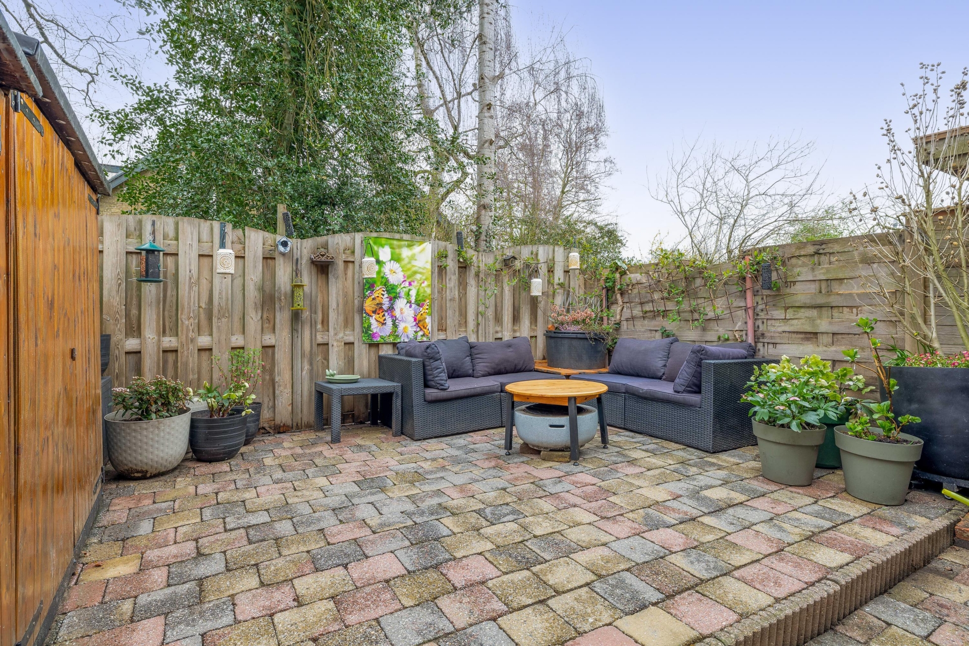 De tuin ligt beschut en biedt volop privacy. De bestrating maakt het onderhoudsvriendelijk, terwijl het groen en de omliggende beplanting zorgen voor een gezellige sfeer.