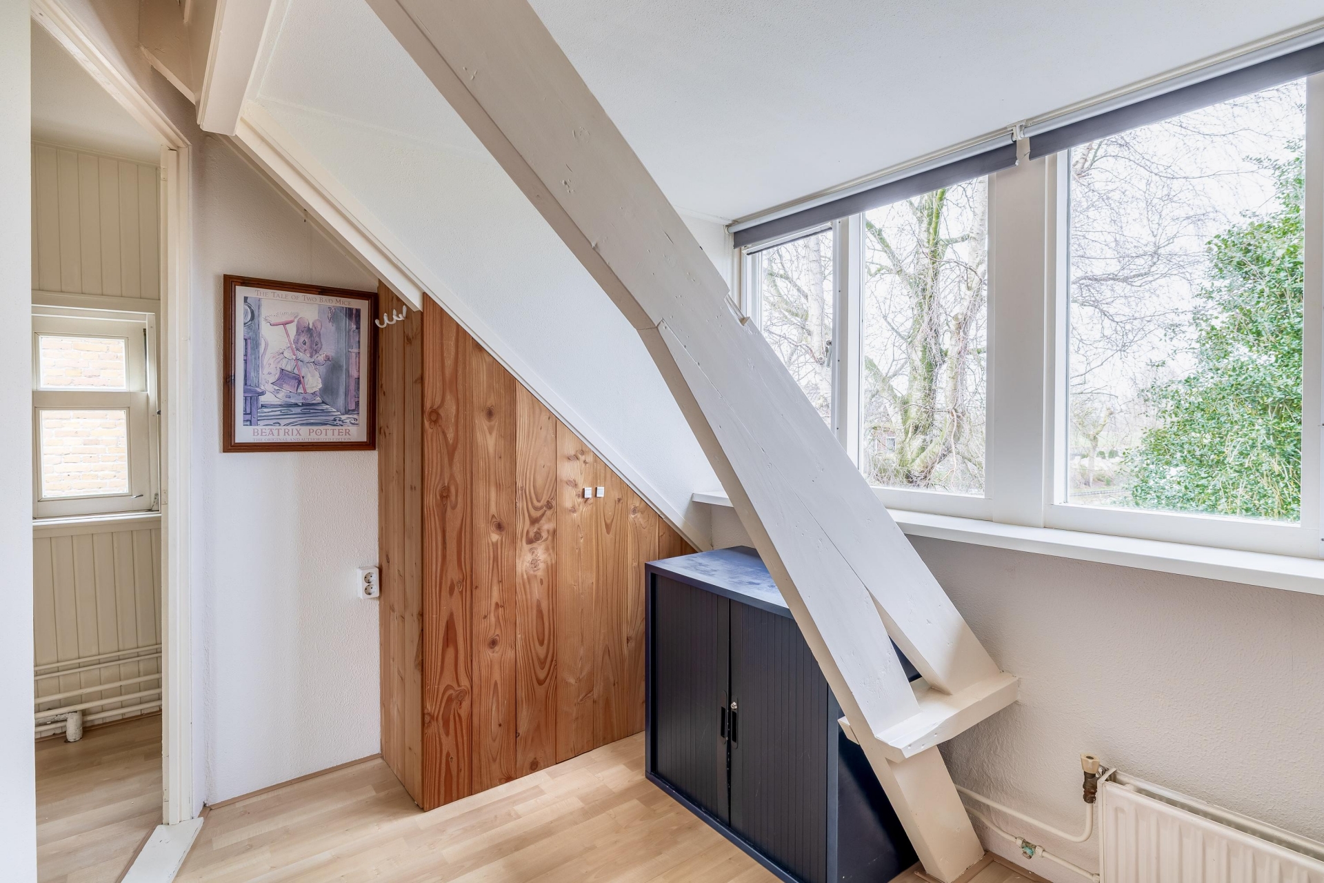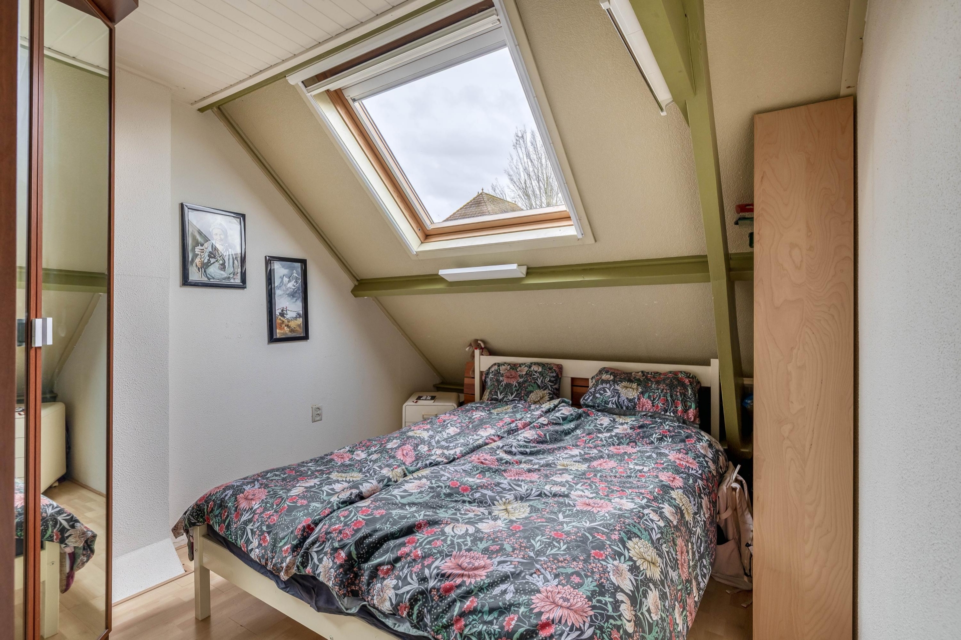 Op de verdieping vind je twee slaapkamers. De grootste slaapkamer is ruim genoeg voor een tweepersoonsbed en kastruimte. De tweede kamer is ideaal als werkkamer, logeerkamer of kinderkamer. Beide ruimtes profiteren van daglicht en hebben een prettige sfeer.