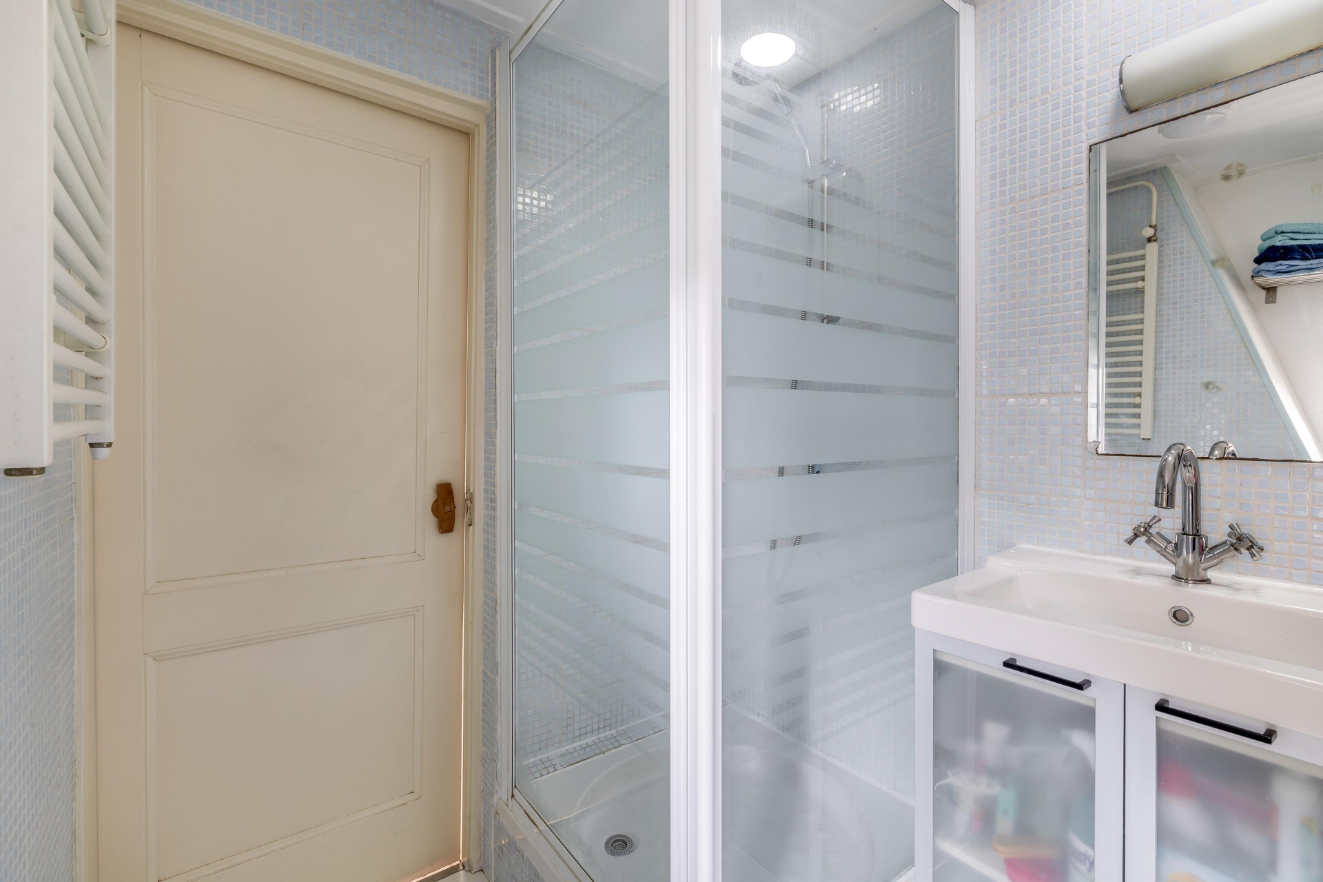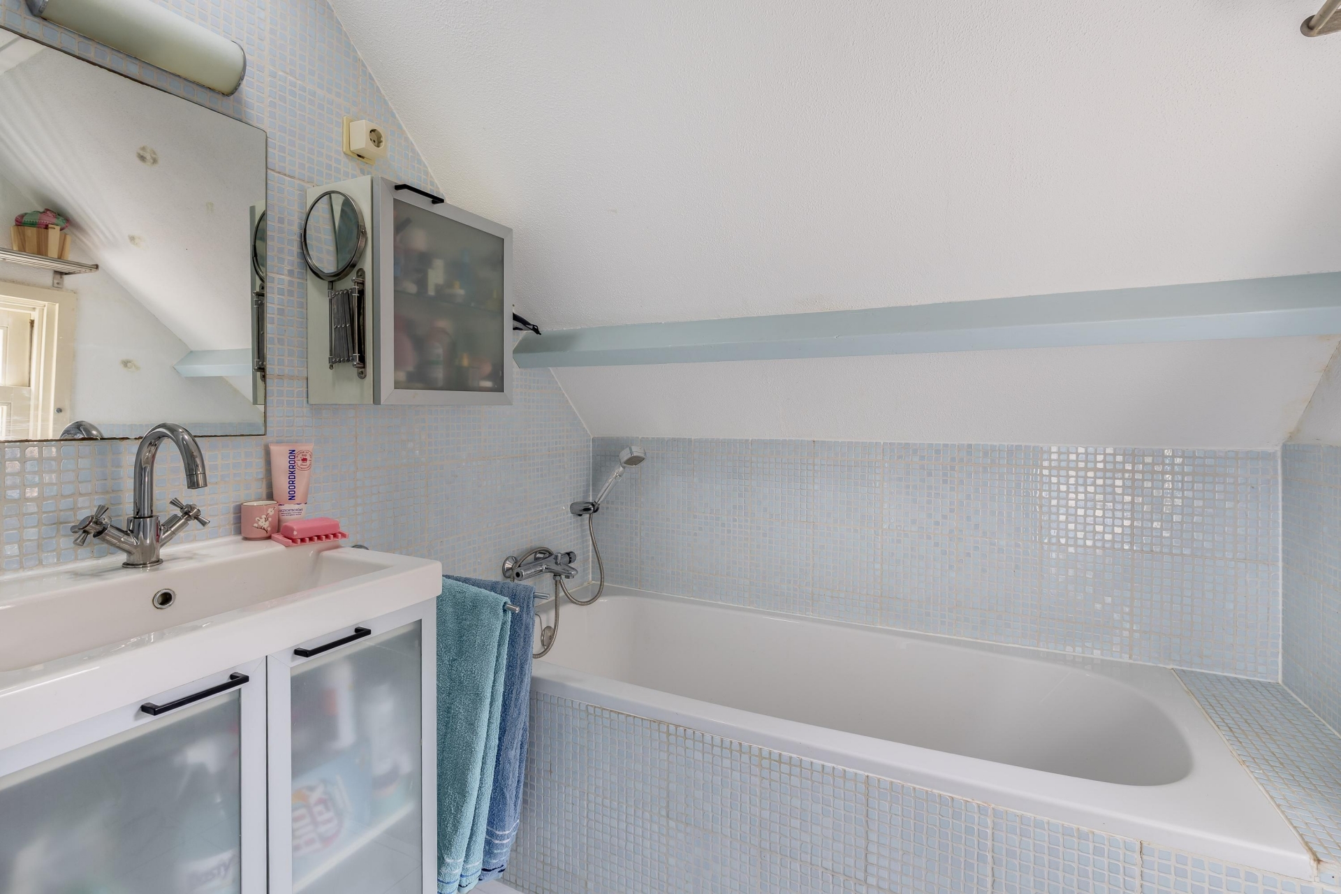 Ook vind je hier de nette badkamer met ligbad, aparte douchecabine en wastafelmeubel.