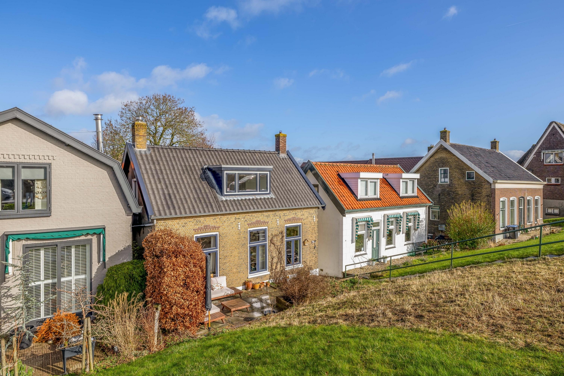 Aan de voorzijde van het huis ligt de voortuin op het zuidwesten. Door de ligging op de dijk is dit een verrassend fijne en goed te gebruiken hoofdtuin. Hier geniet je vanaf de middag tot in de avond van de zon. Een plek voor een loungeset, een grote tafel of gewoon een stoel.