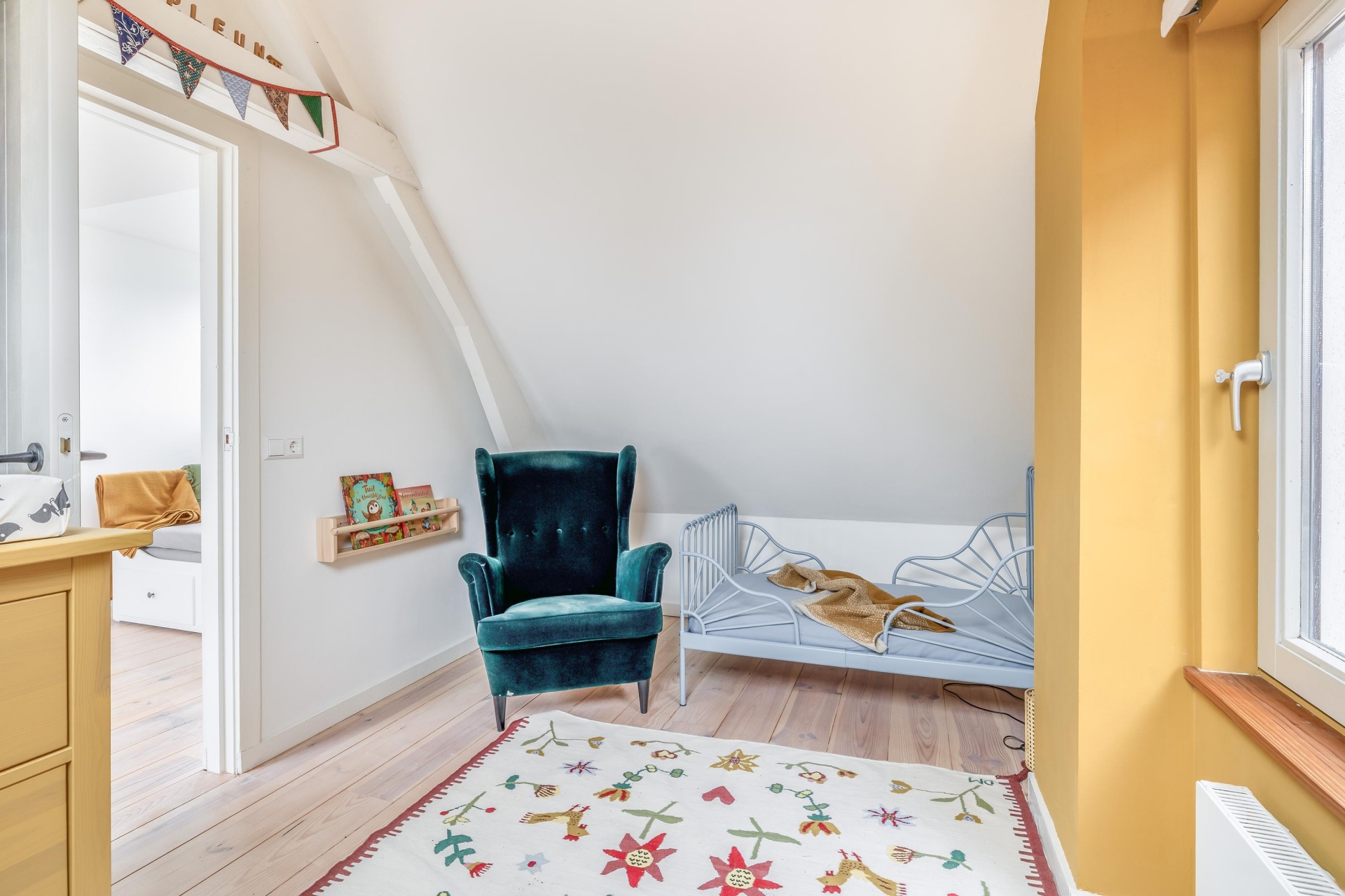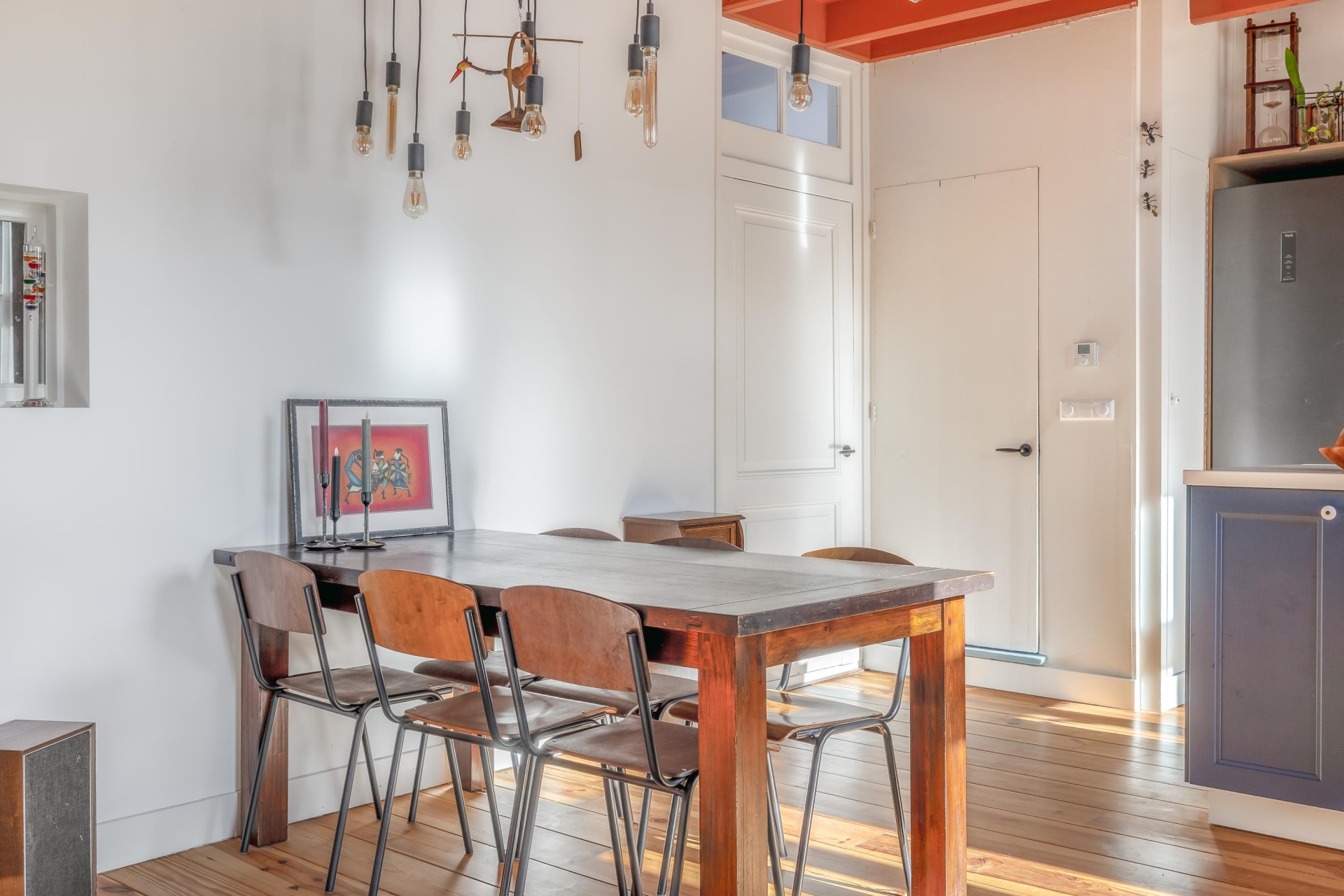 De zichtbare balken en het kleurgebruik geven de ruimte een eigen identiteit; modern, maar met respect voor het bouwjaar van het huis.