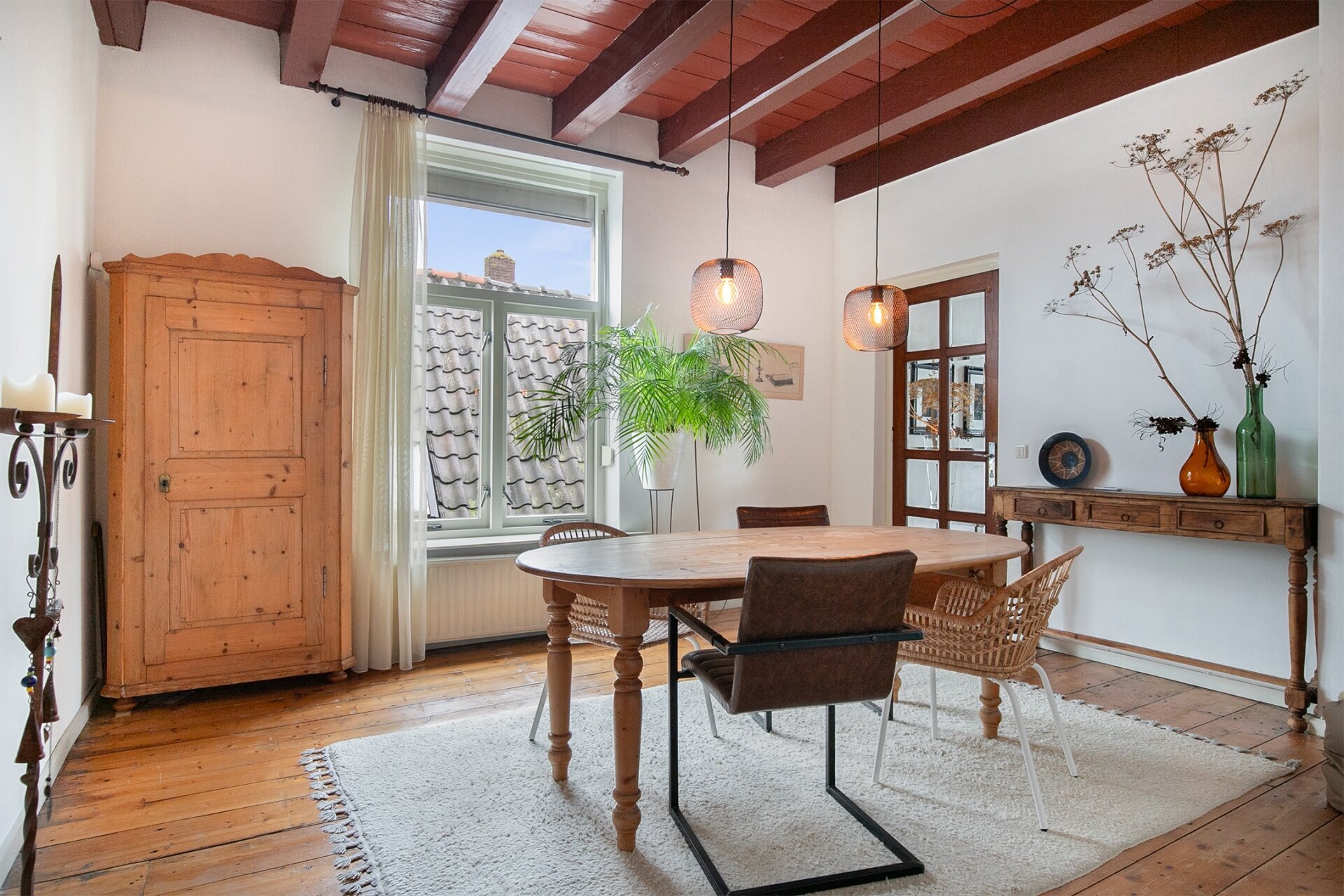 Aan de voorzijde van de woning bevindt zich een eerste slaapkamer, die kan dienen als studeerkamer of babykamer. Direct daarnaast ligt de ruime woonkamer, voorzien van een prachtige houten vloer en veel natuurlijk licht door de hoge ramen aan de voorkant. Vanuit de woonkamer heeft u toegang tot een aparte eetkamer.