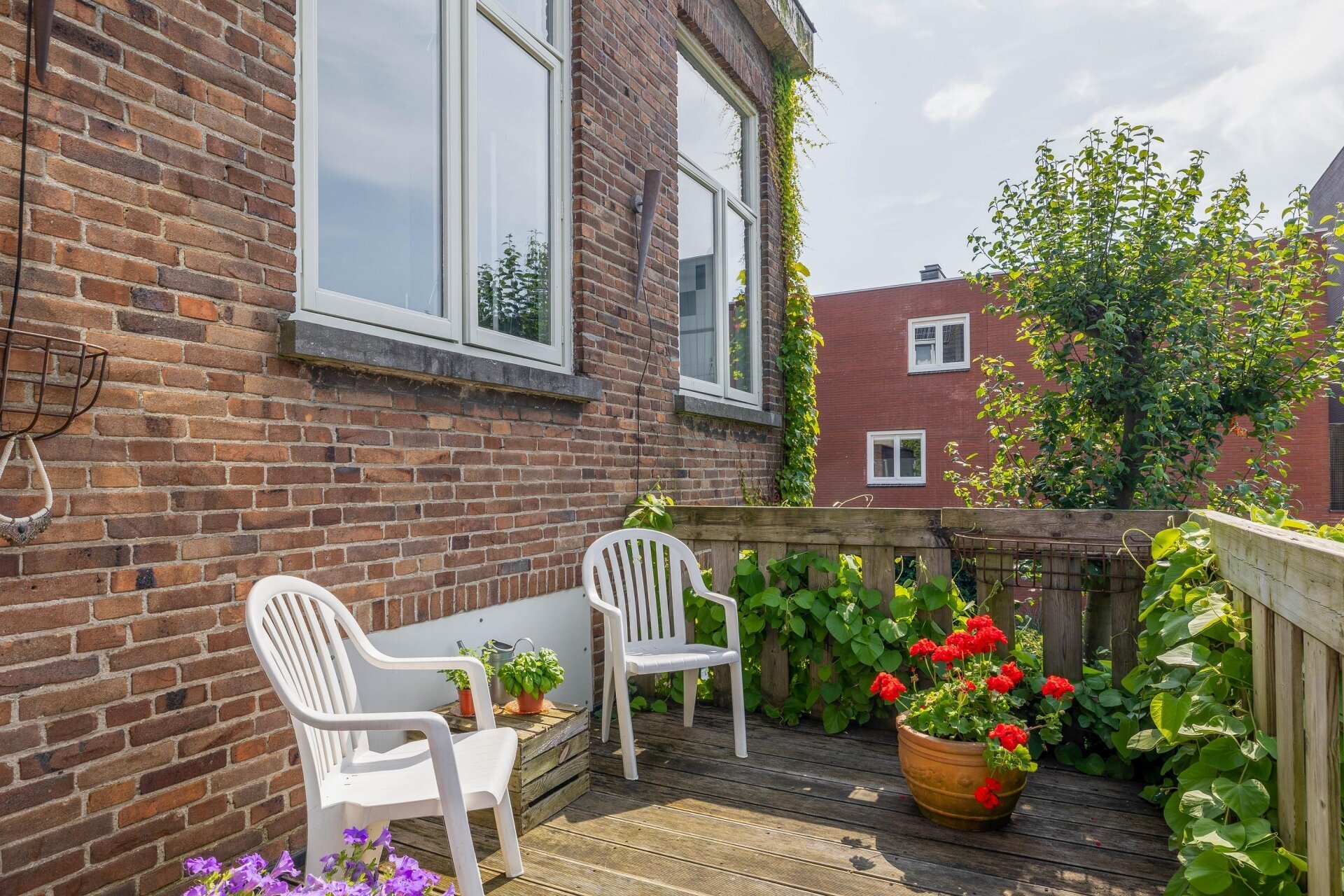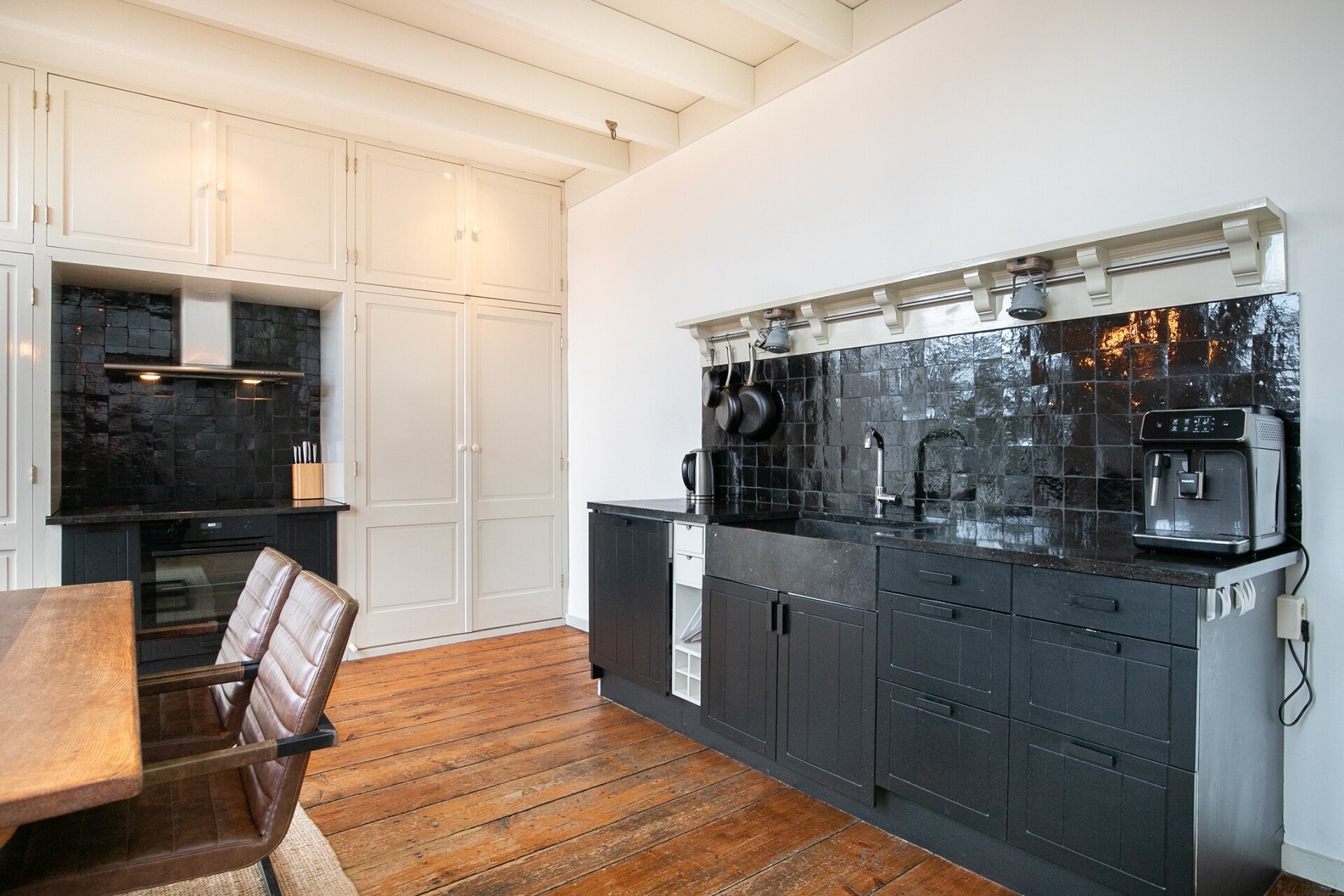 Aan de achterzijde van de woning vindt u de prachtige woonkeuken, die zeer stijlvol is ingericht. De keuken heeft een hoog keukenblok met oven, inductiekookplaat, afzuigkap en veel kastruimte, en een laag keukenblok met vaatwasser en een mooie spoelbak met kraan. De combinatie van witte en zwarte kleuren past uitstekend bij de houten vloer van de keuken. Via de keuken bereikt u het ruime balkon van 17 m², dat ook via een trap vanaf het dakterras toegang biedt tot de achtertuin.