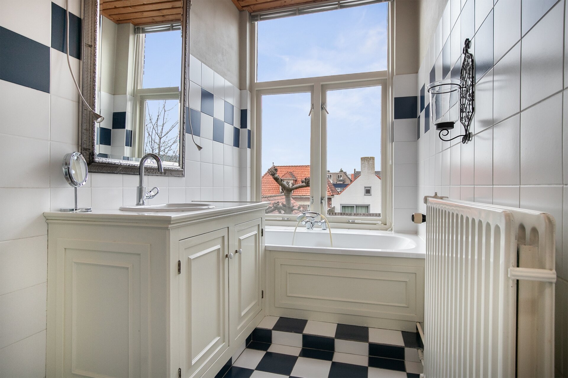 Naast de keuken bevindt zich de eerste badkamer van de woning, met een ligbad, wastafelmeubel en een nette douchecabine.