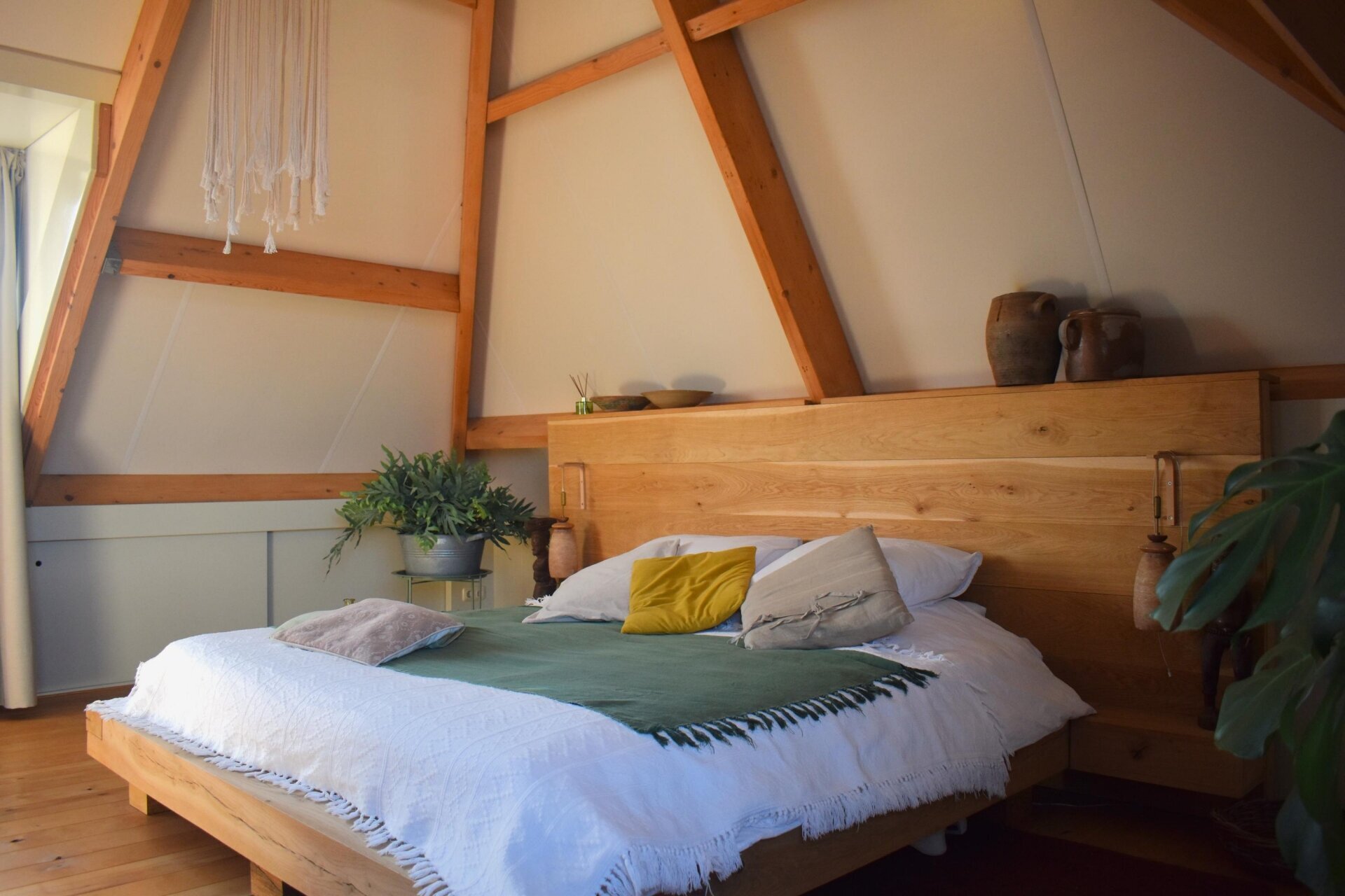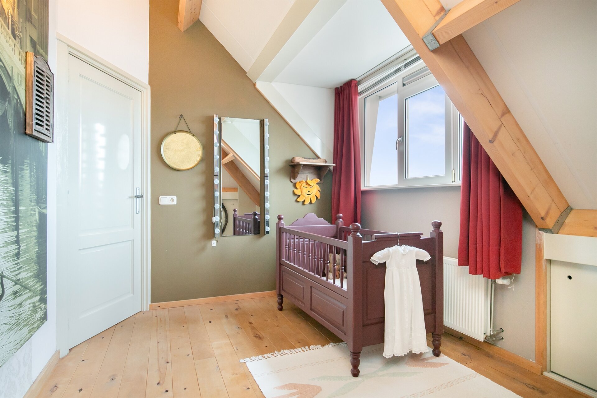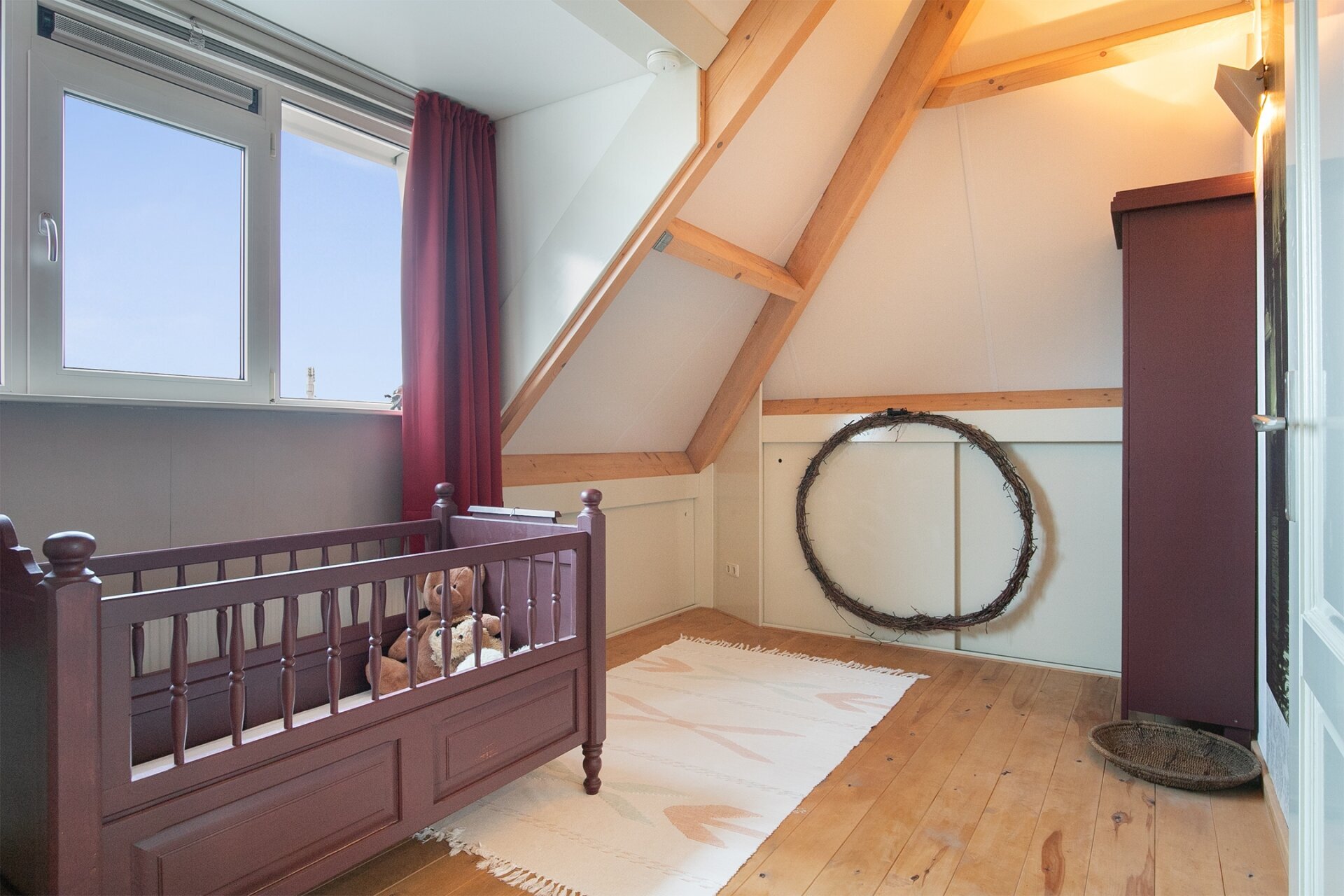 De masterbedroom bevindt zich aan de achterzijde en is heerlijk ruim dankzij de hoge nok en twee dakkapellen met kunststof ramen. De kamer heeft diverse knieschotten en via een luik is de bergzolder bereikbaar.