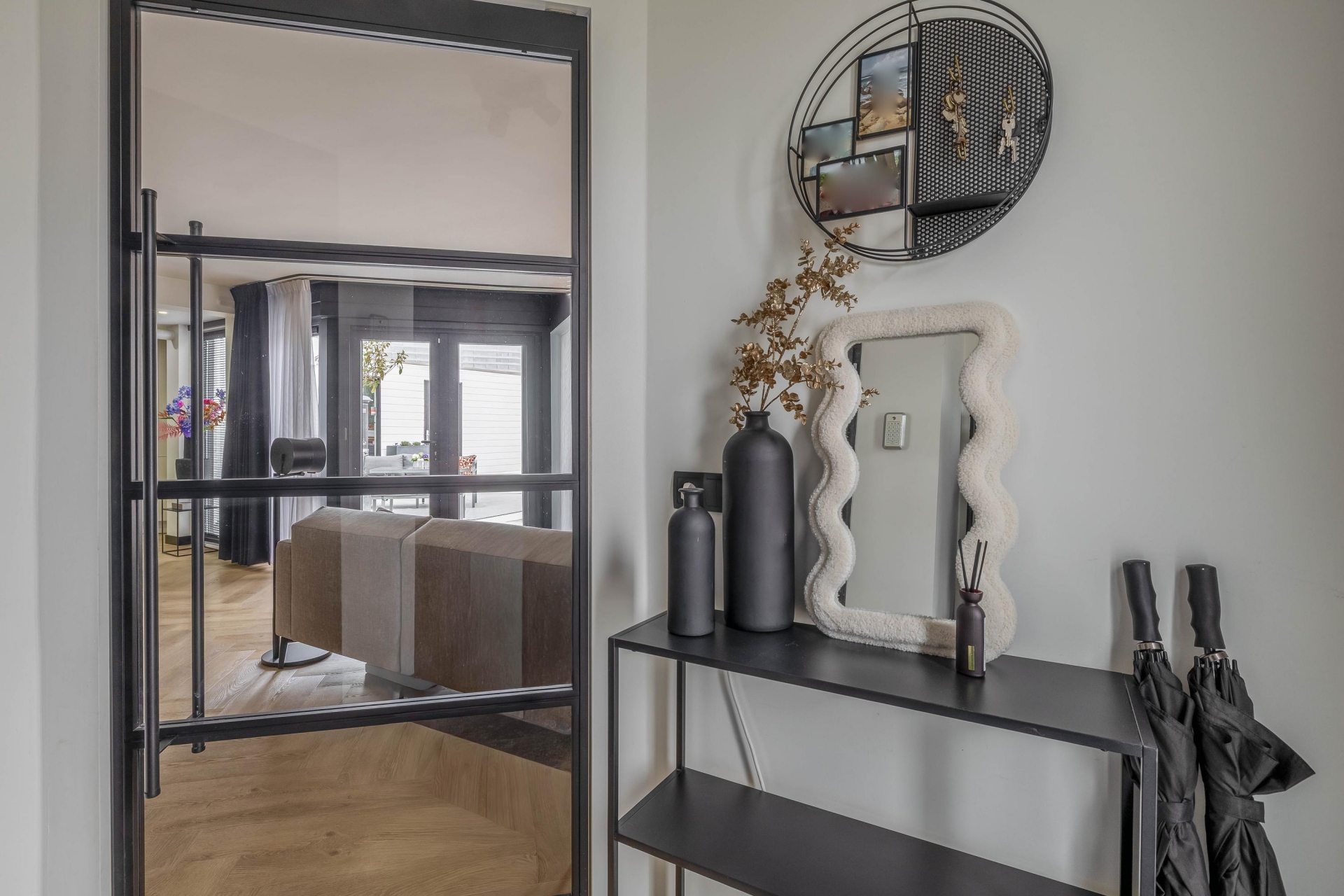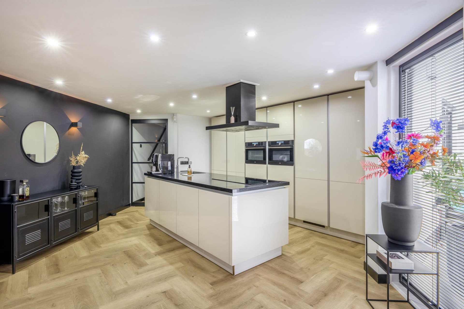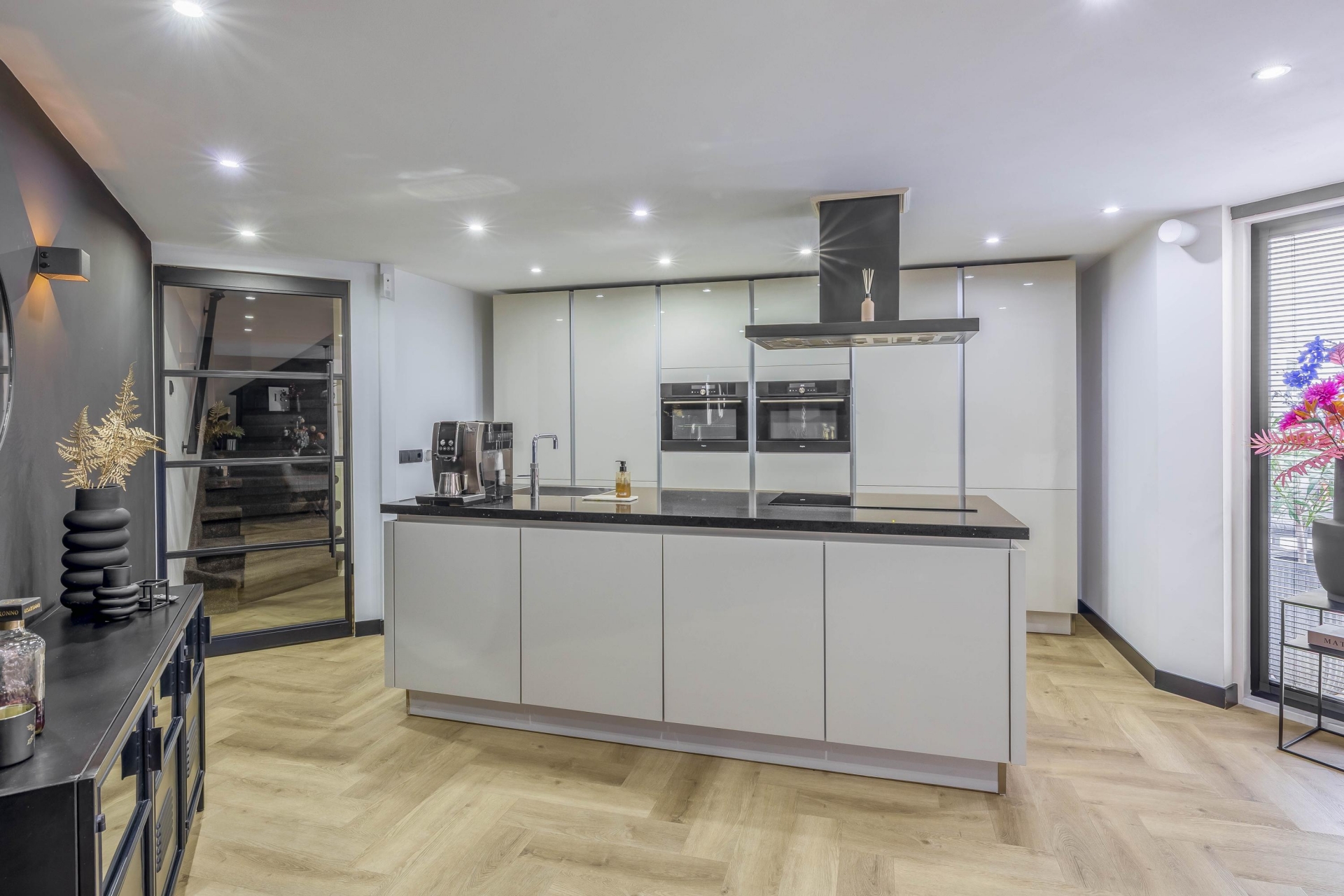 Entree met toegang tot het toilet en de lichte, tuingerichte woonkamer. De ruimte heeft een speelse indeling en beschikt over een fraaie PVC-vloer met vloerverwarming. De woonkamer beschikt over een cinewall, een stalen tussendeur en zwarte plinten. Hierdoor is er een luxe uitstraling gecreëerd. Voor comfort is er nog een airconditioning geplaatst. De open keuken is geplaatst in 2020 en beschikt over alle benodigde inbouwapparatuur. Achter de keuken is een tussenportaal te vinden, welke toegang biedt tot een slaapkamer en de trapopgang naar de eerste verdieping.