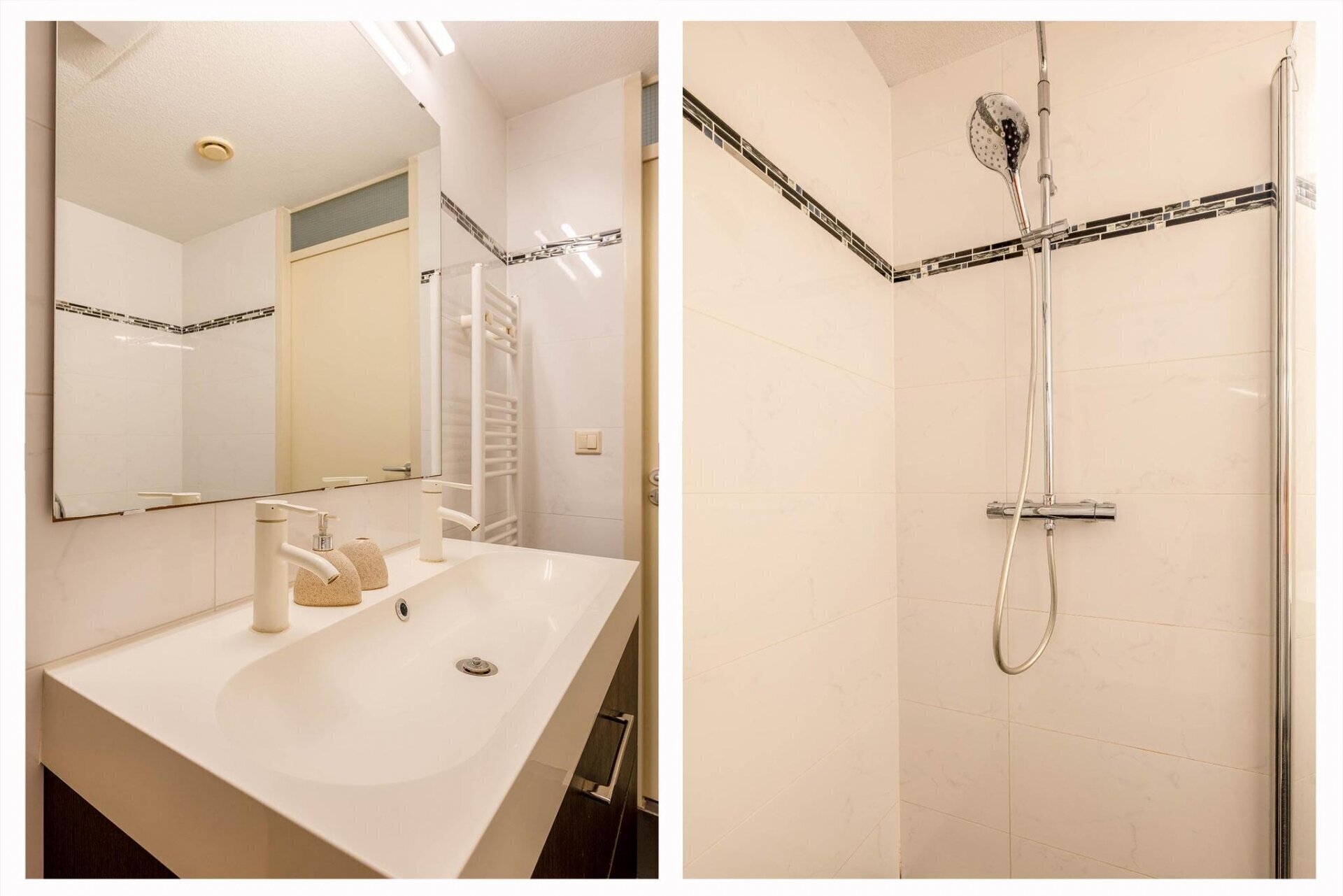 • Een badkamer met douche, wastafel en aansluiting voor een wasmachine.