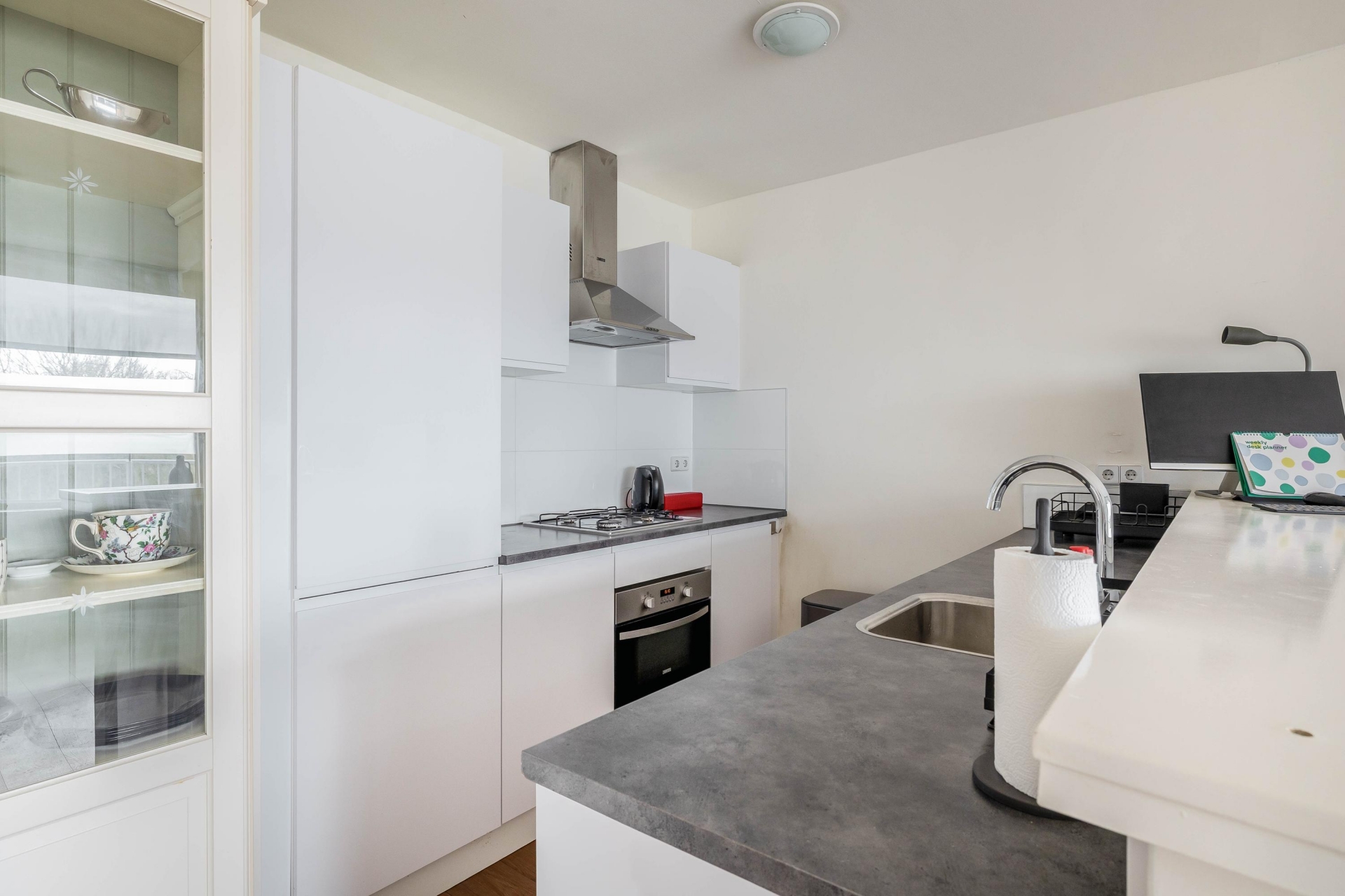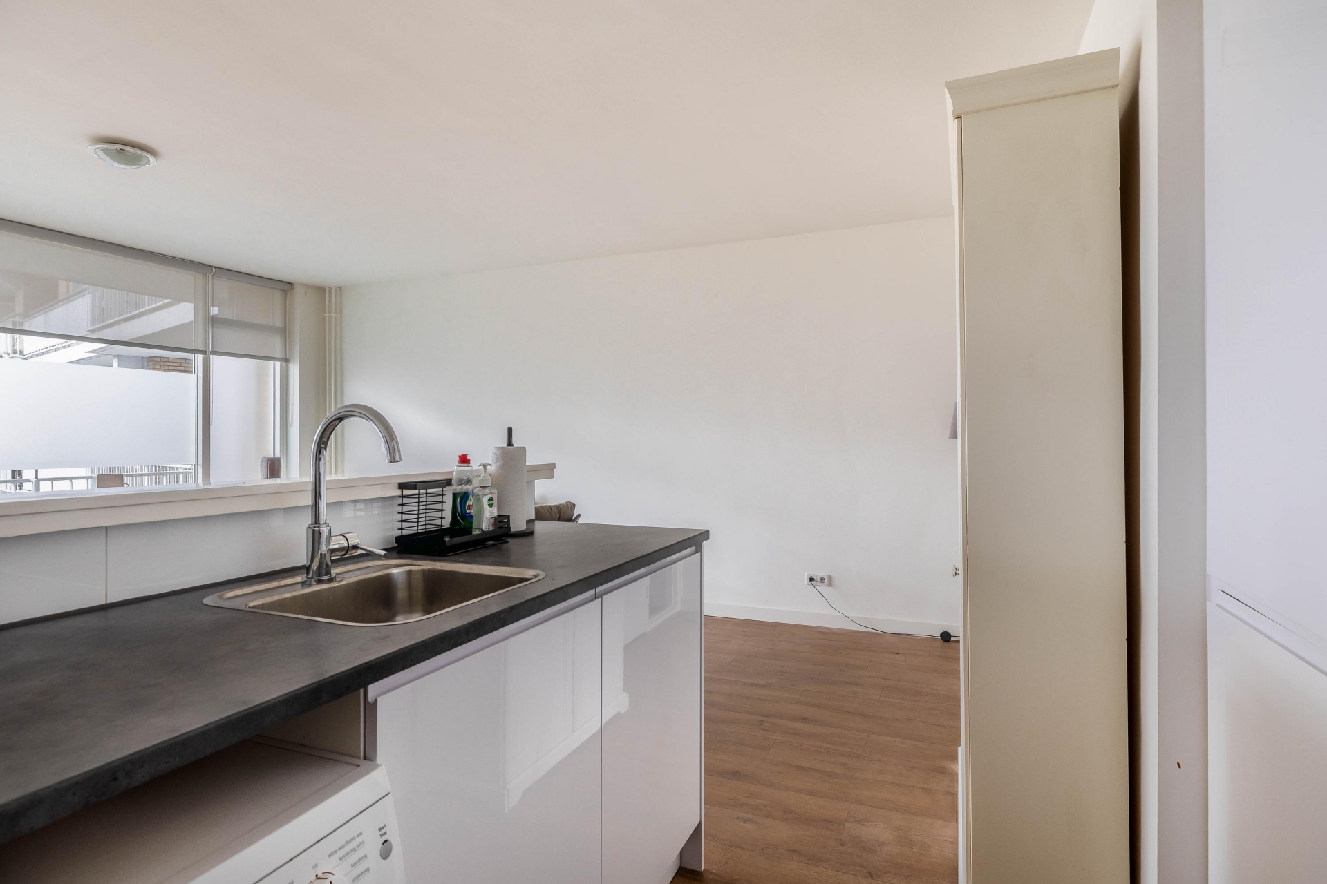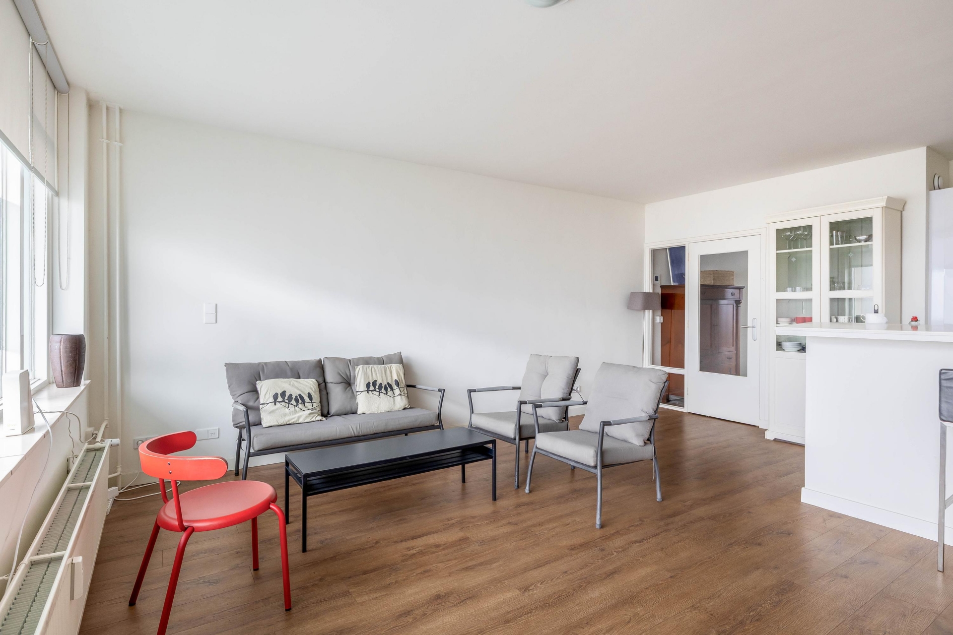 Zodra je binnenkomt valt direct de fijne lichtinval op. De grote raampartijen zorgen voor een open en frisse uitstraling. De woonkamer is praktisch in te delen met een comfortabele zithoek én een eethoek. Dankzij de neutrale afwerking en de laminaatvloer voelt het geheel verzorgd en instapklaar aan.