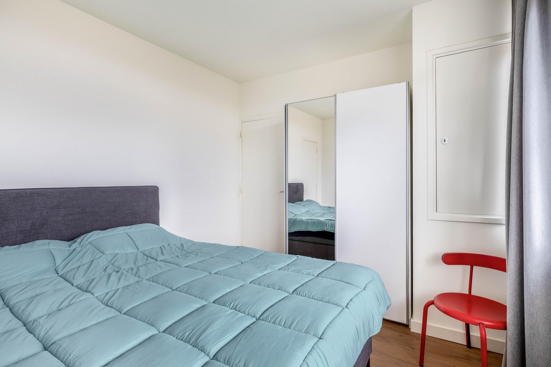 De slaapkamer is goed van formaat en biedt voldoende ruimte voor een tweepersoonsbed en een kledingkast. Ook hier zorgen de ramen voor prettig daglicht. Door de efficiënte indeling voelt het appartement groter aan dan de vierkante meters doen vermoeden.